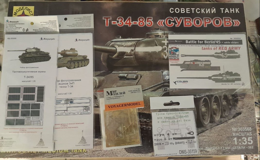 Итак, в сборке принимают участие Т-34/85 от Моделиста (репак Акаемии), 2 набора травления от Микродизайна (собственно сетки и ящики ЗиП"