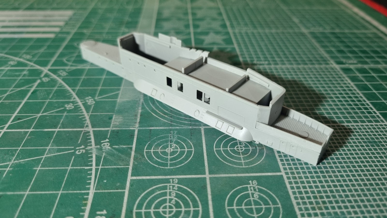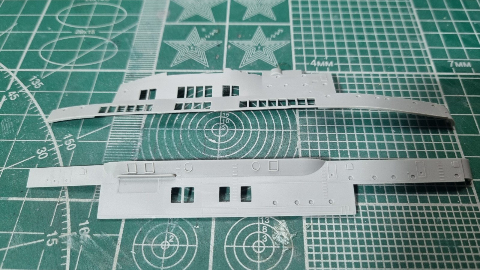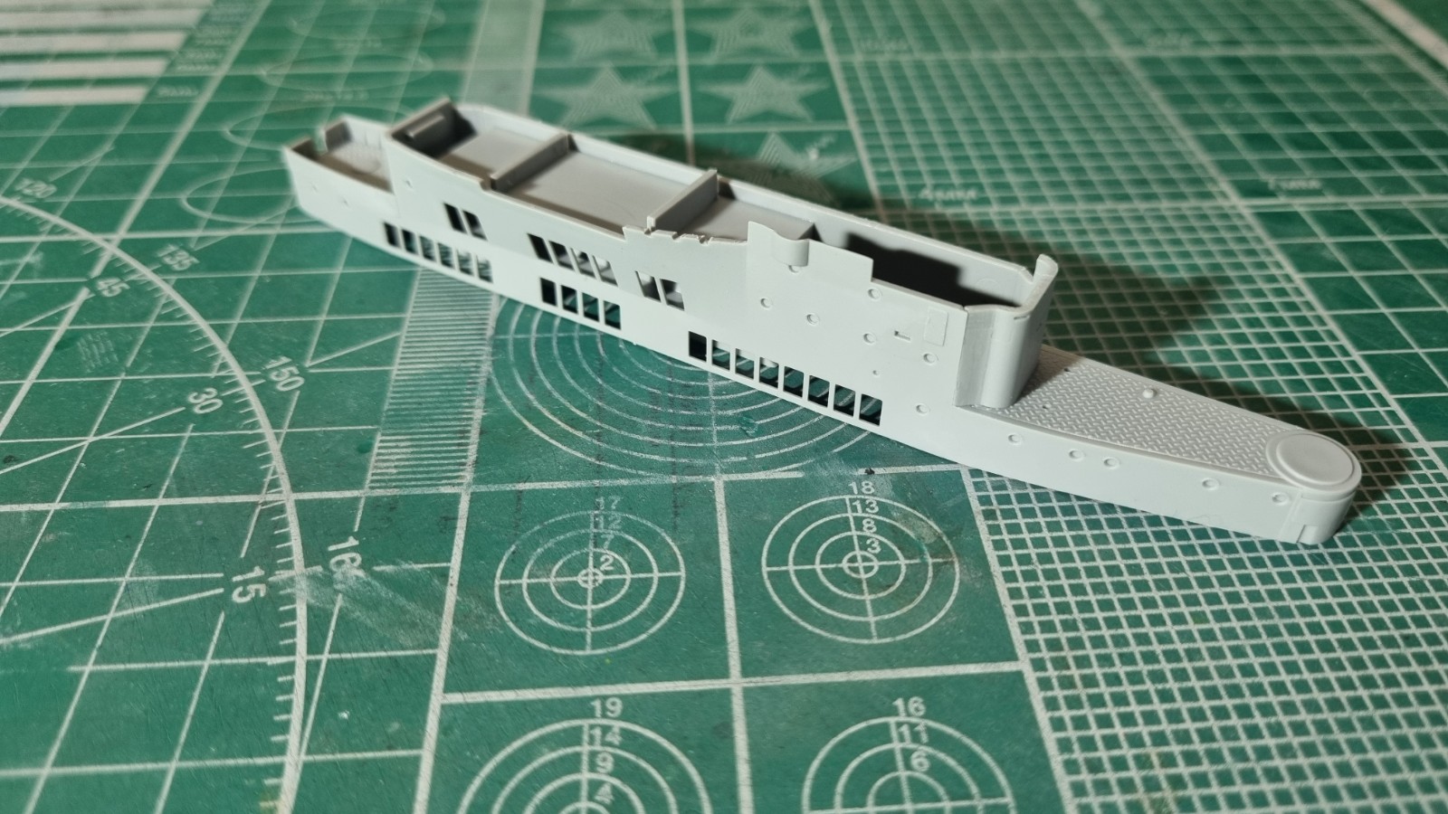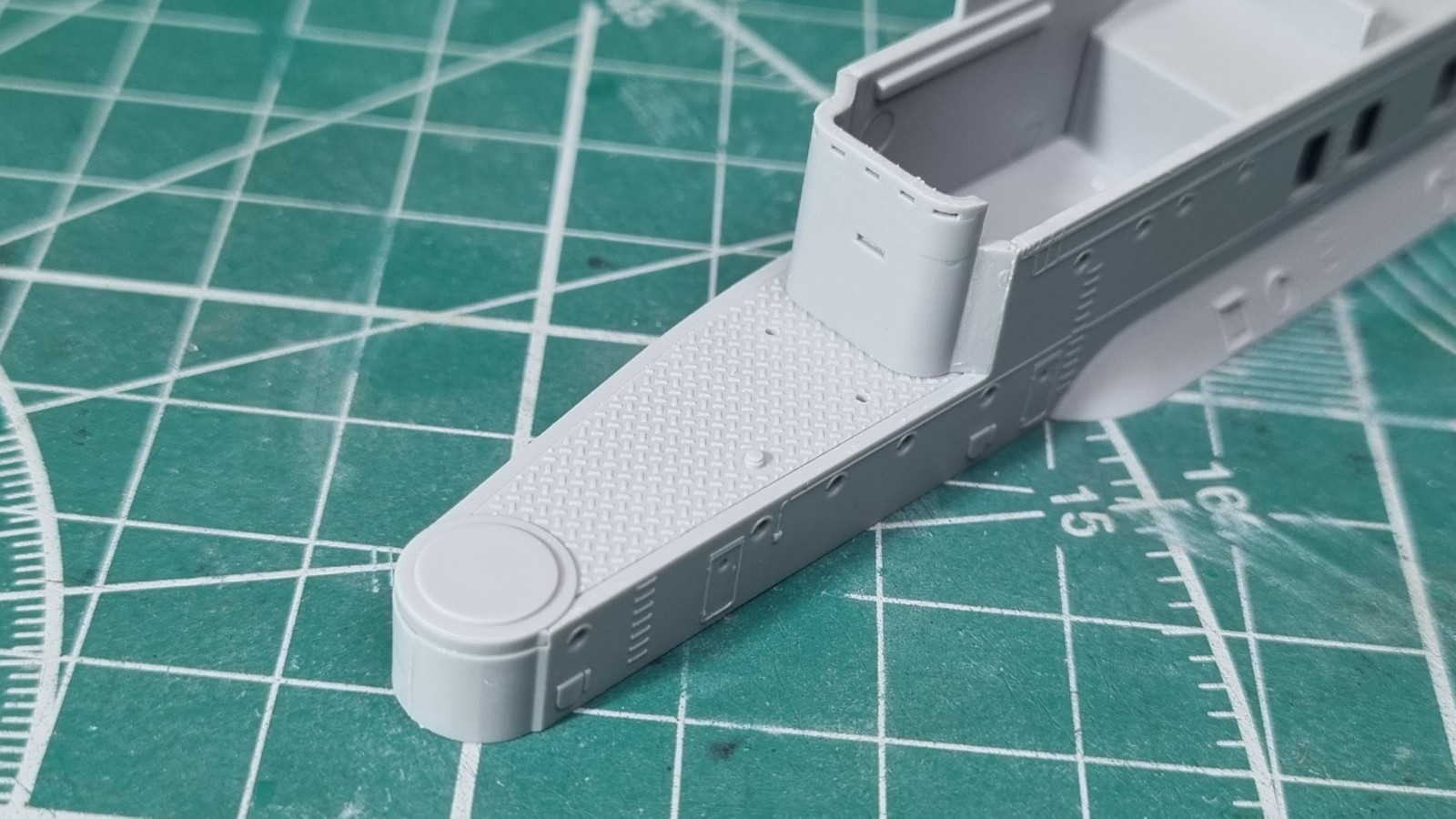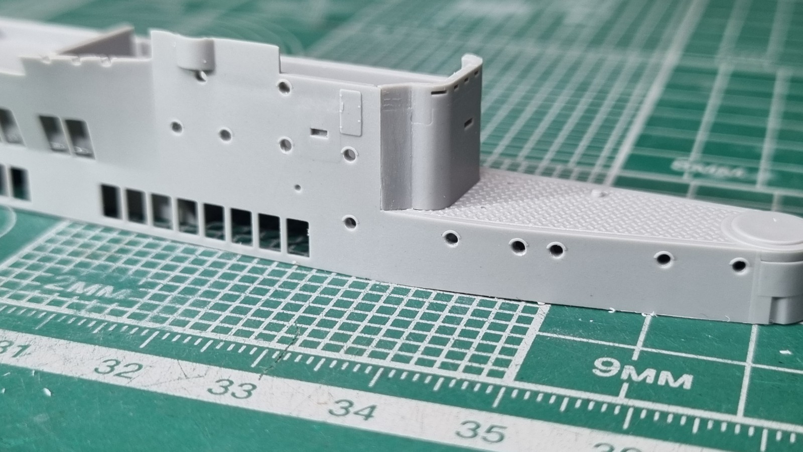 Первое, оно же главное. Кормовая часть не ложится в размер по длине где то на 1-'1,5 мм. То есть видимо придётся отрезать полоску на стыке с центральной частью.