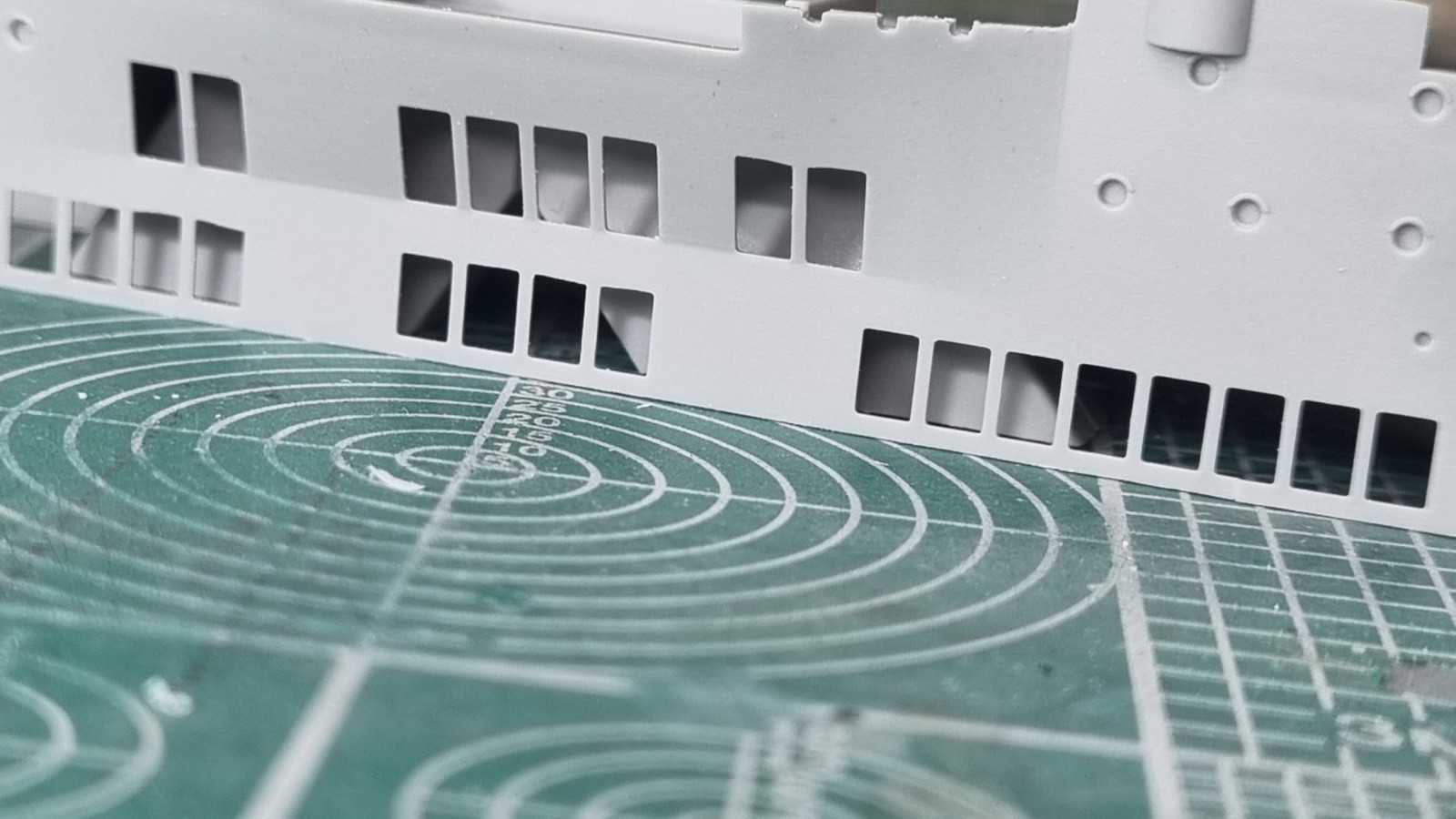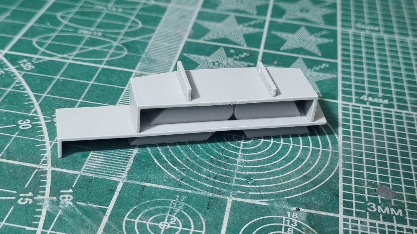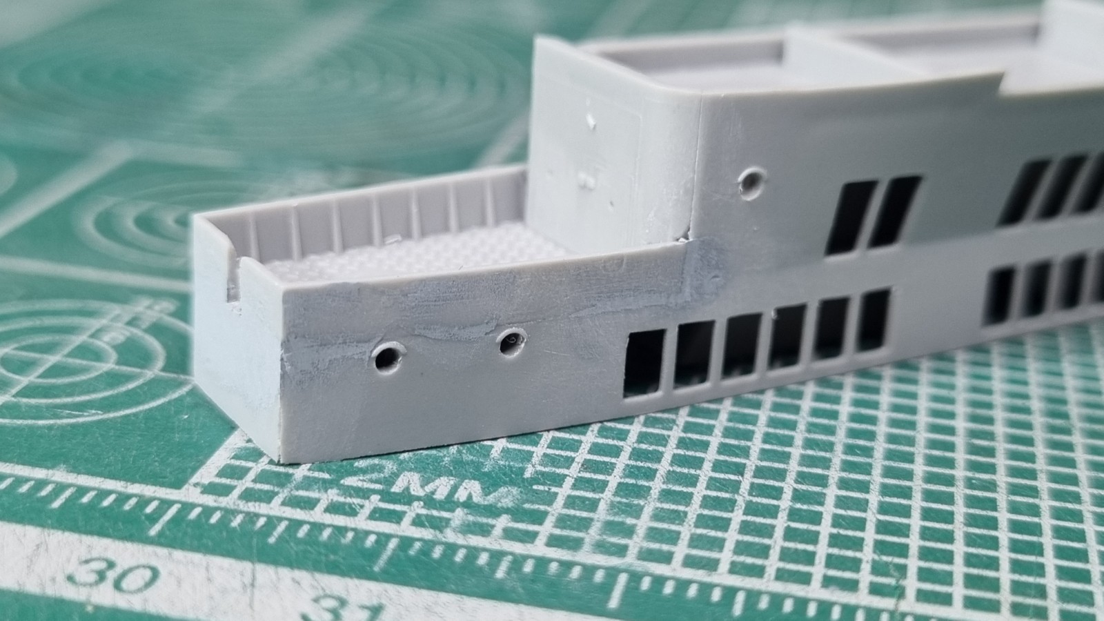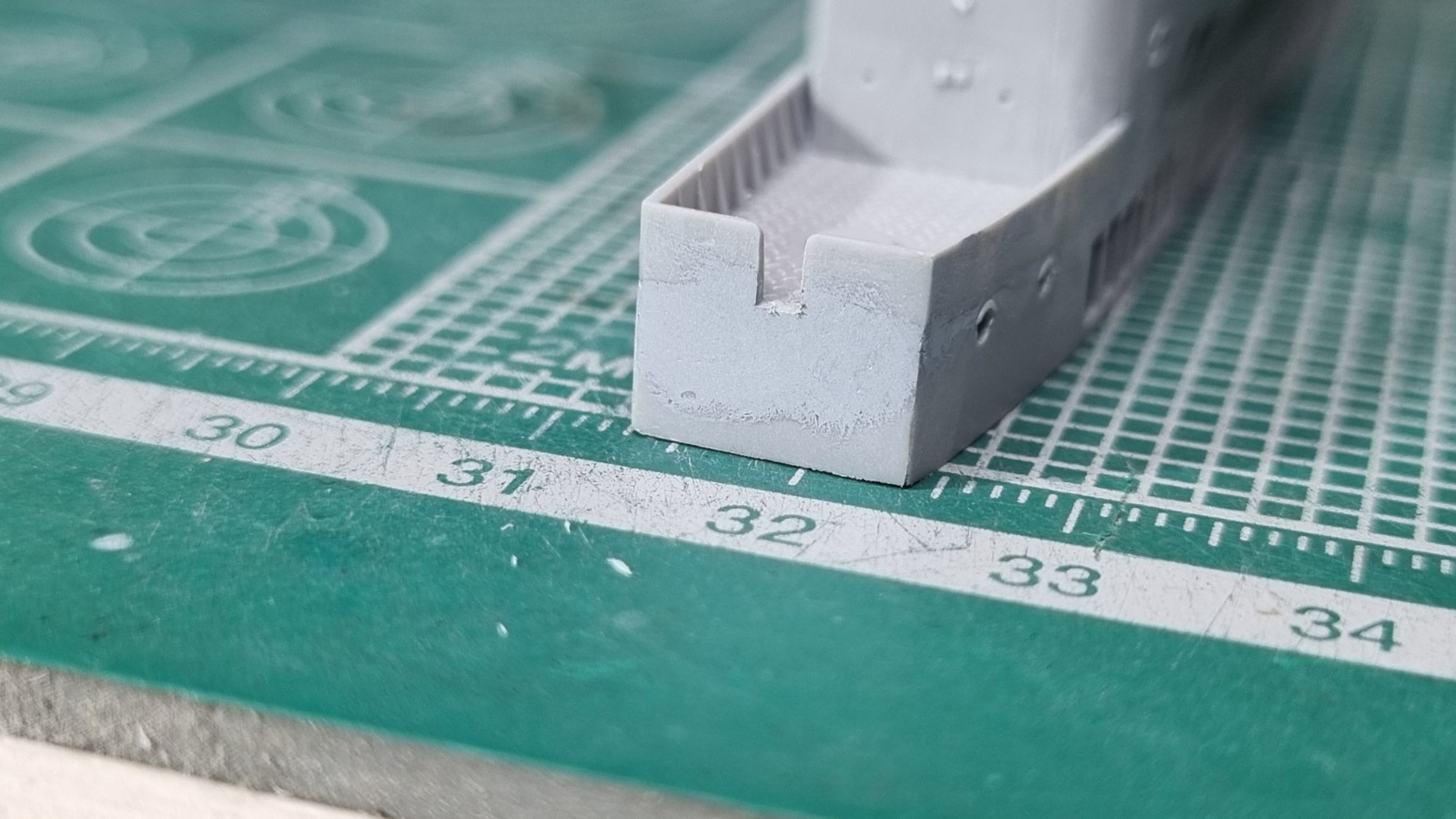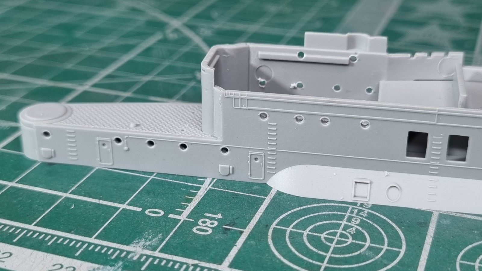 Первое, оно же главное. Кормовая часть не ложится в размер по длине где то на 1-'1,5 мм. То есть видимо придётся отрезать полоску на стыке с центральной частью.