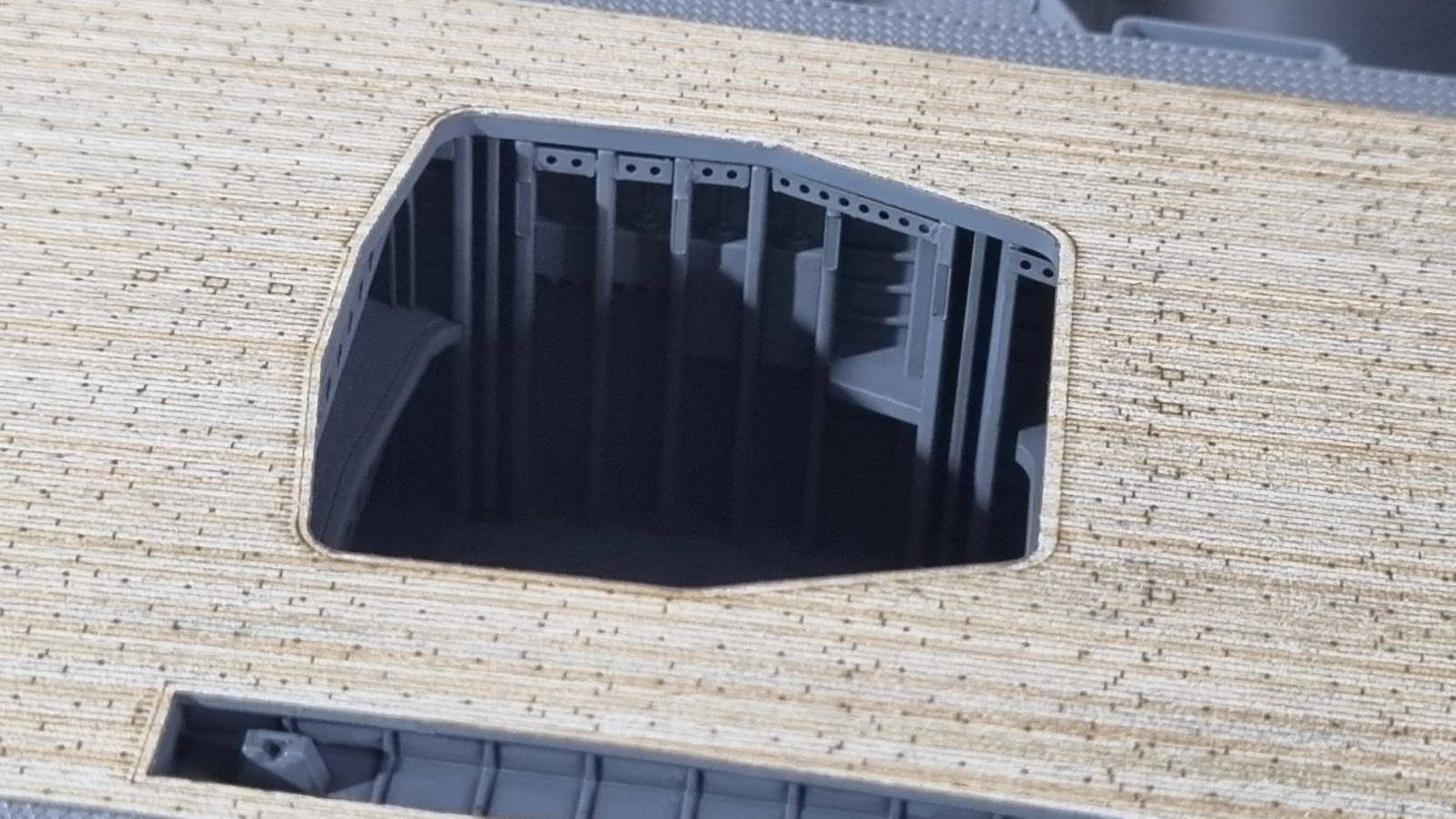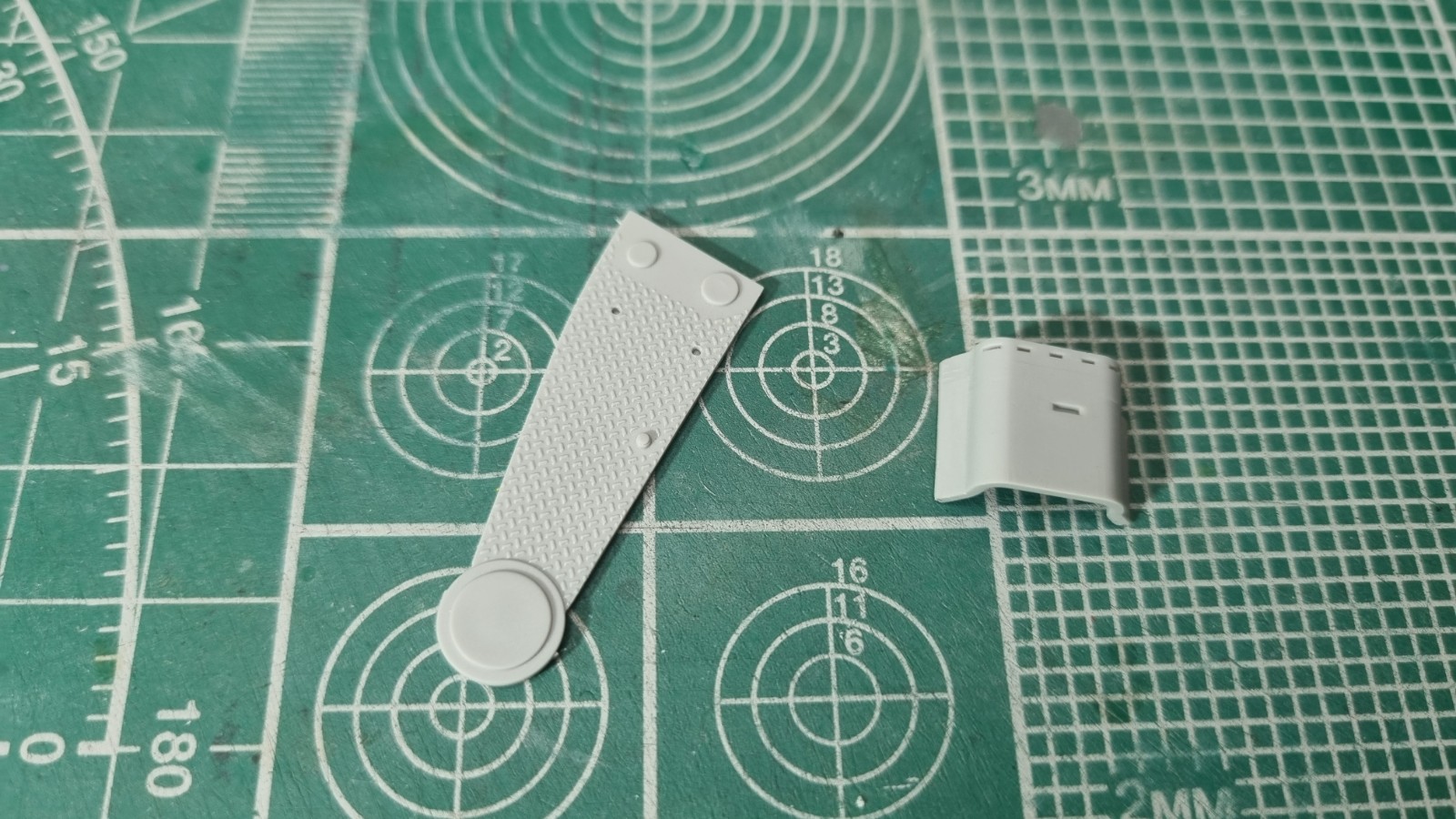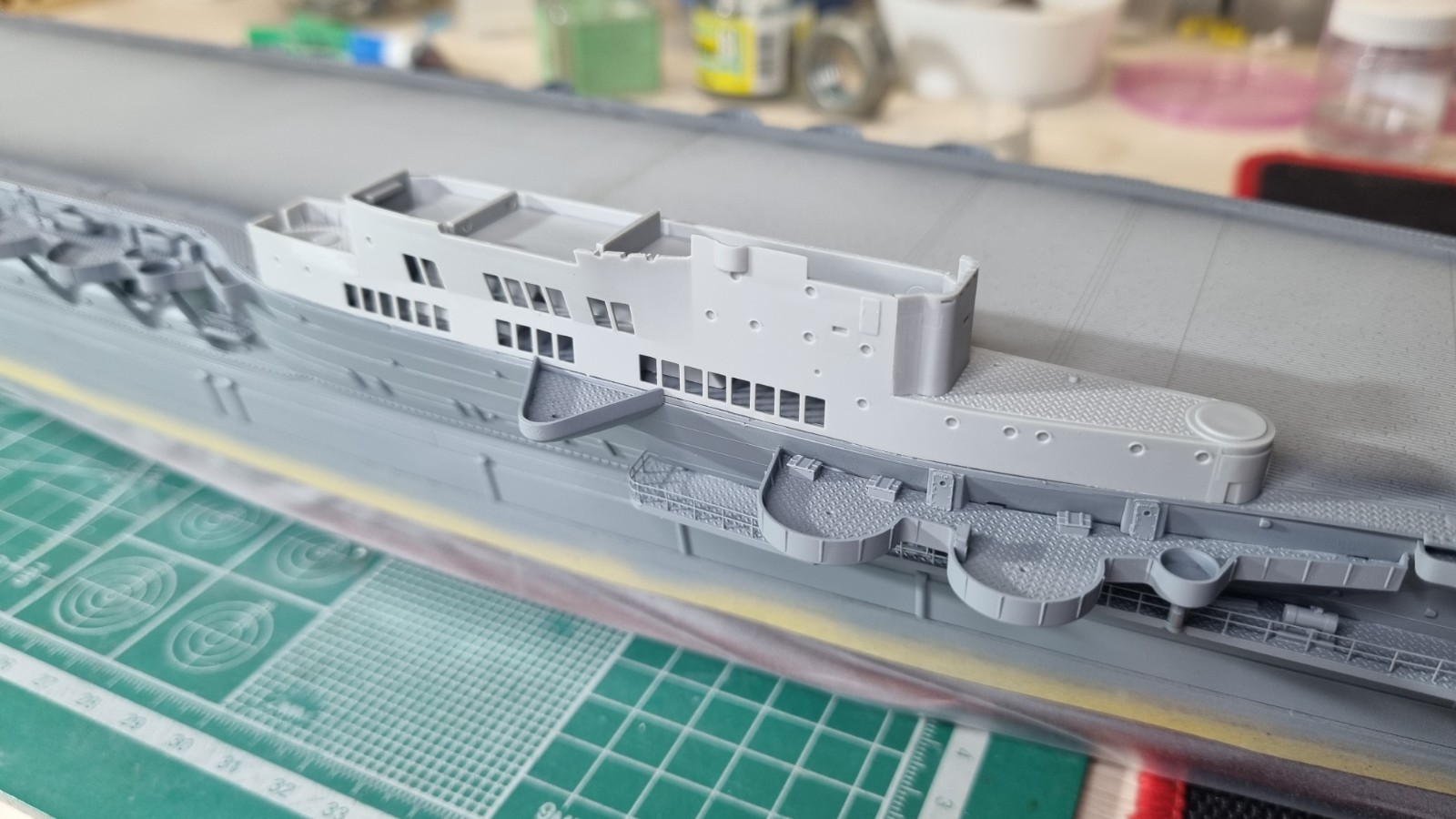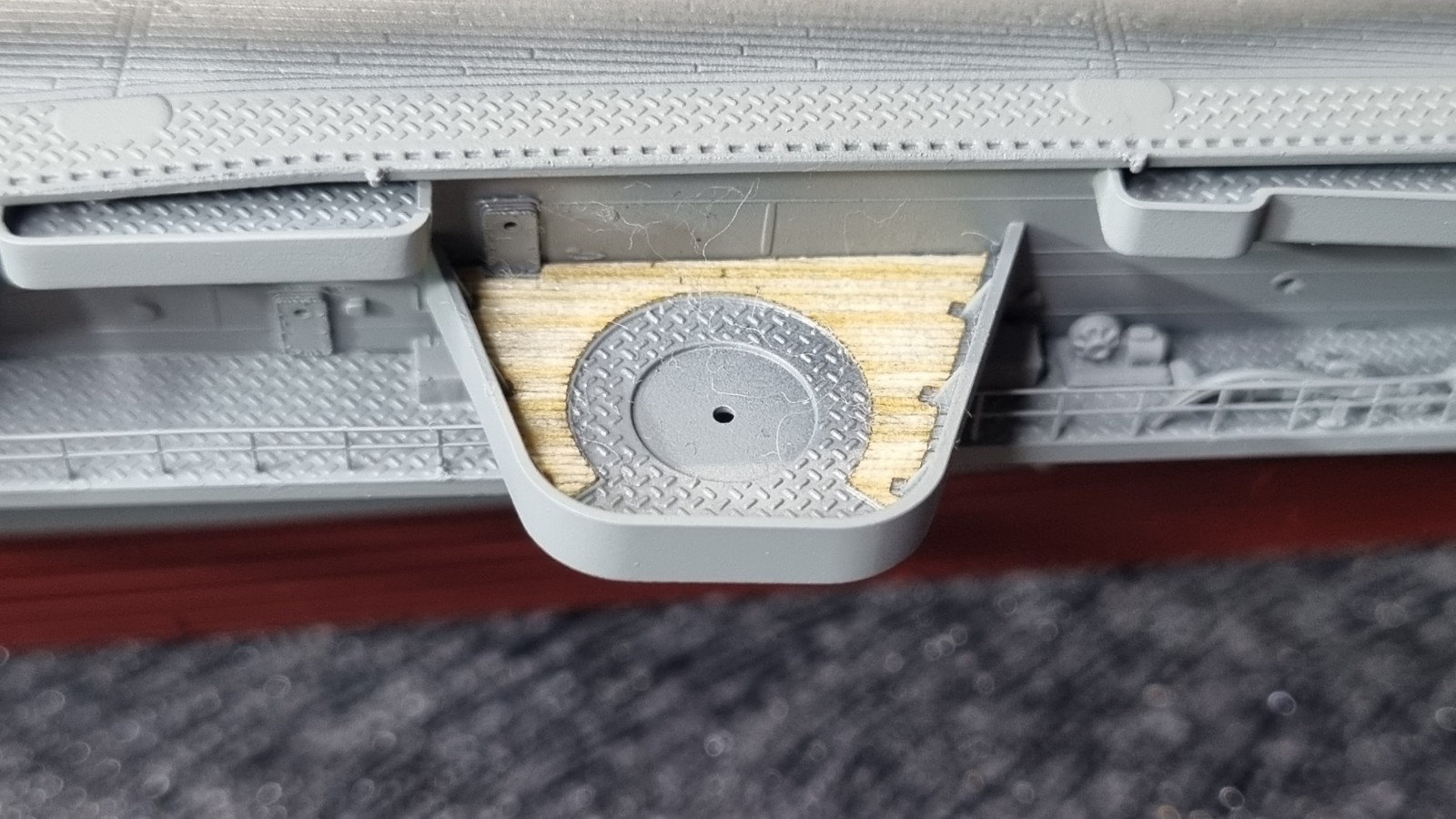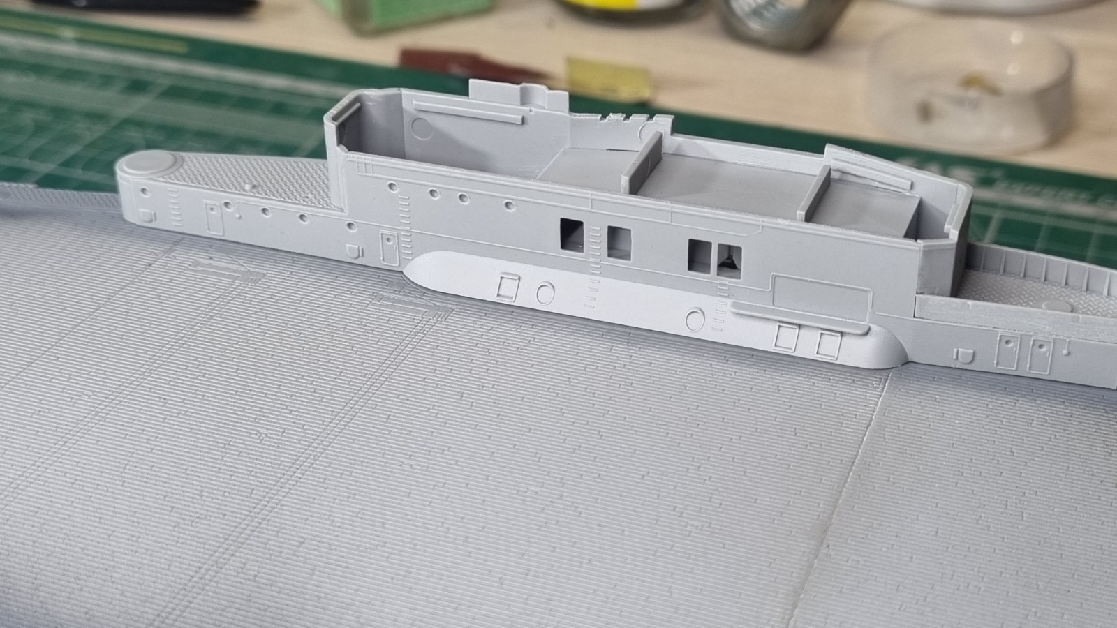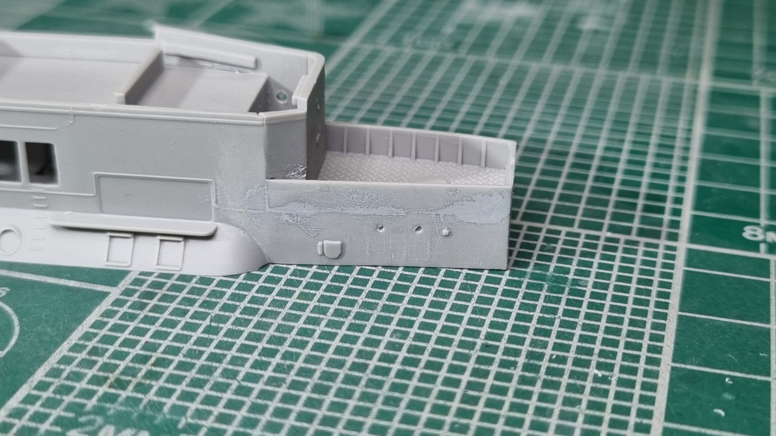 Первое, оно же главное. Кормовая часть не ложится в размер по длине где то на 1-'1,5 мм. То есть видимо придётся отрезать полоску на стыке с центральной частью.