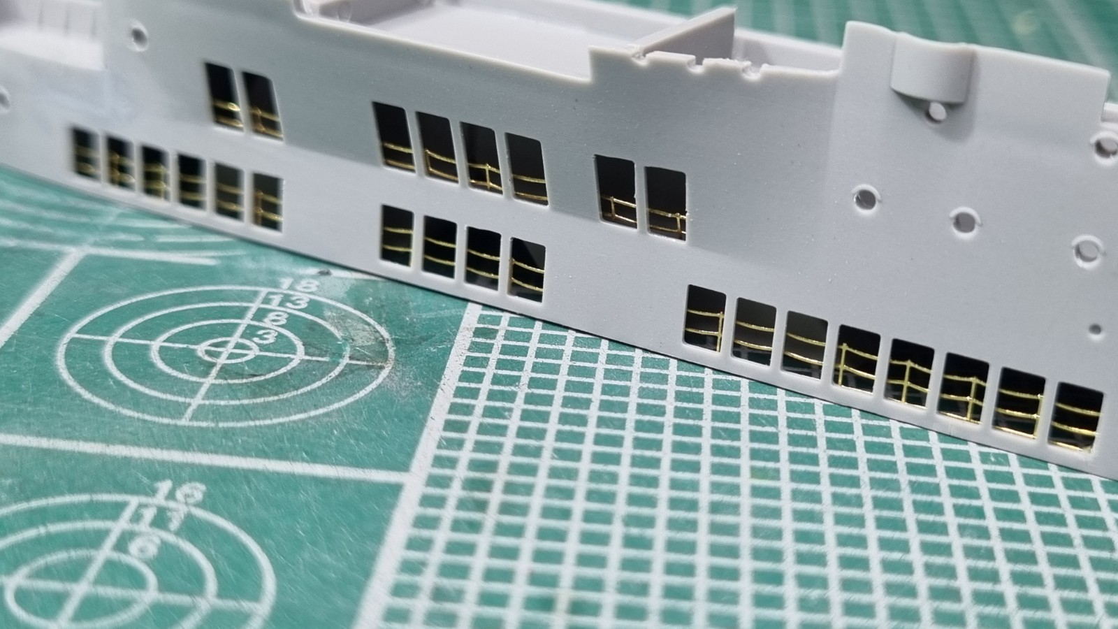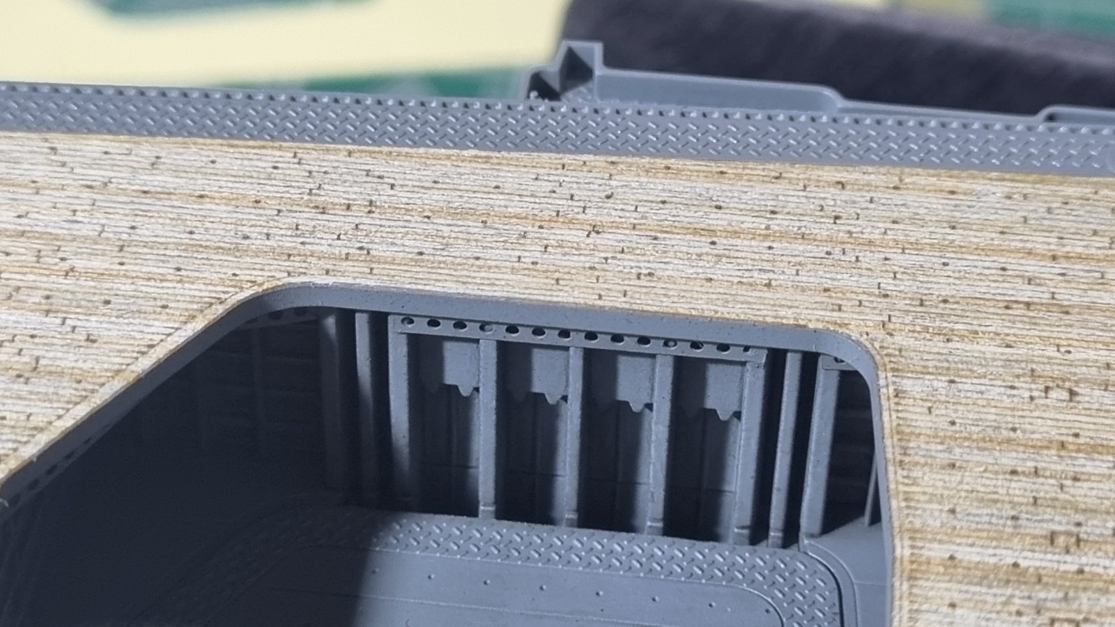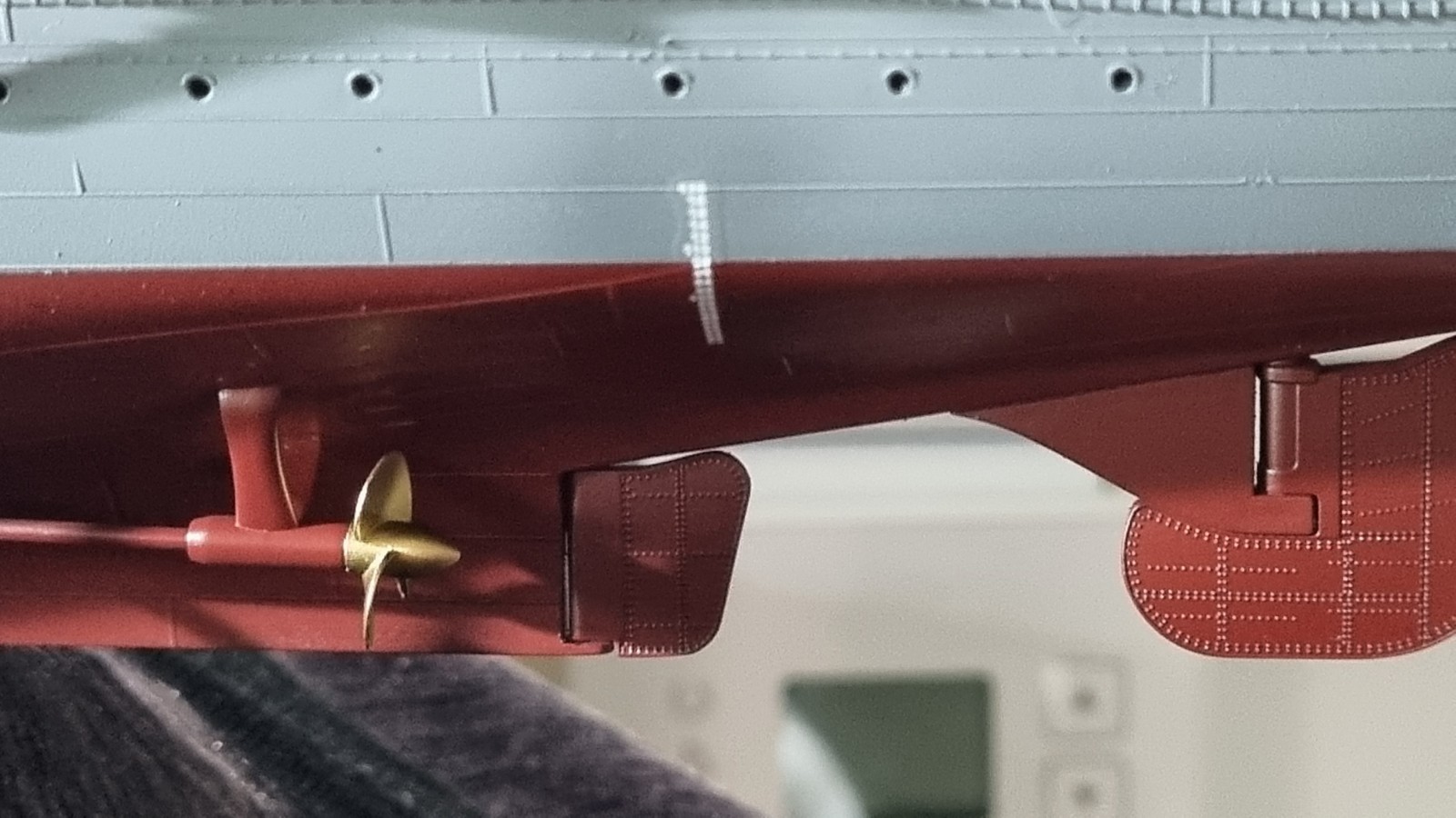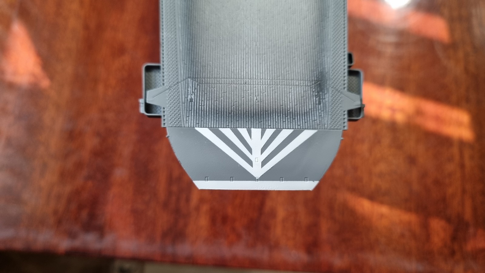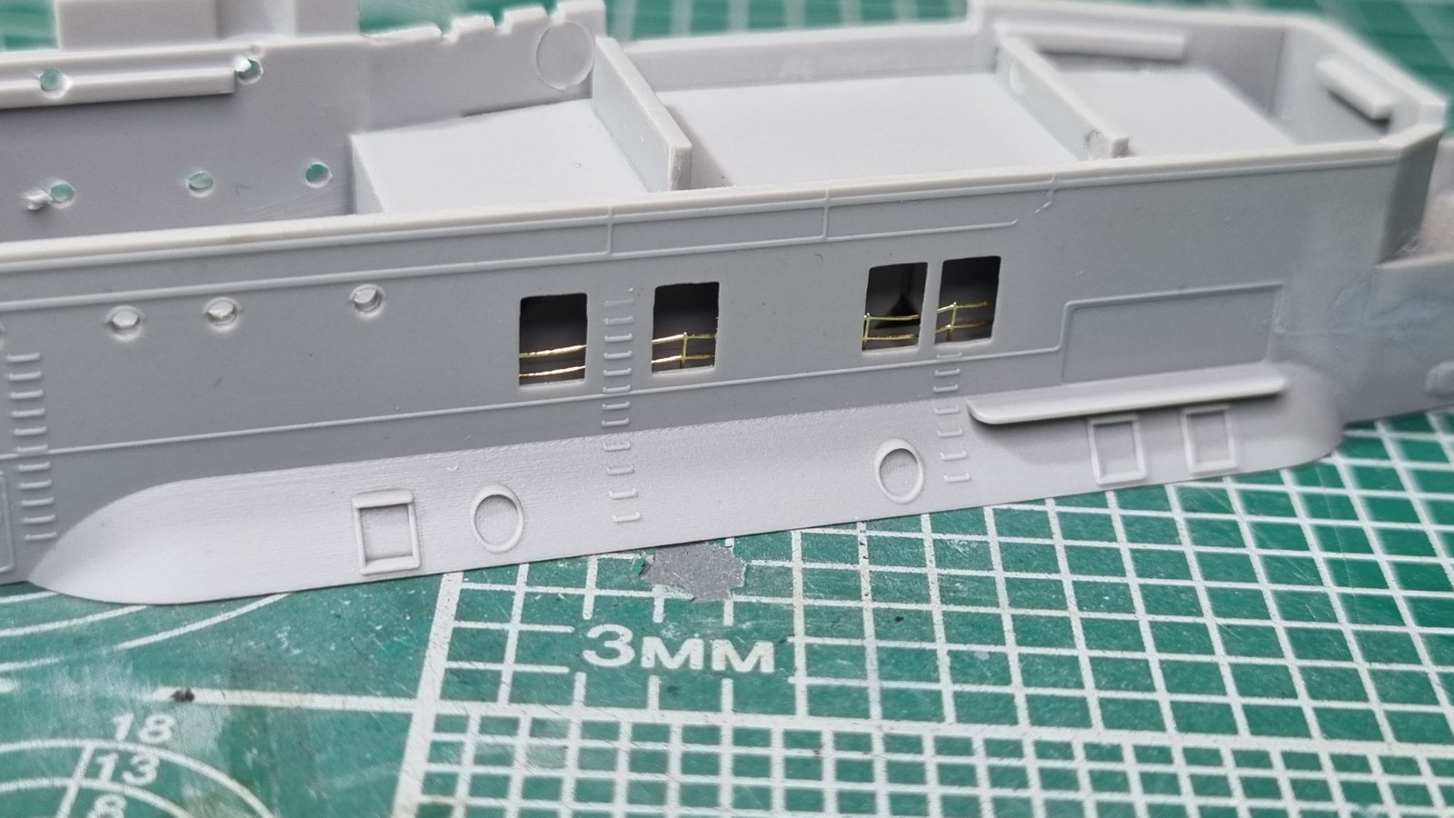 Первое, оно же главное. Кормовая часть не ложится в размер по длине где то на 1-'1,5 мм. То есть видимо придётся отрезать полоску на стыке с центральной частью.
