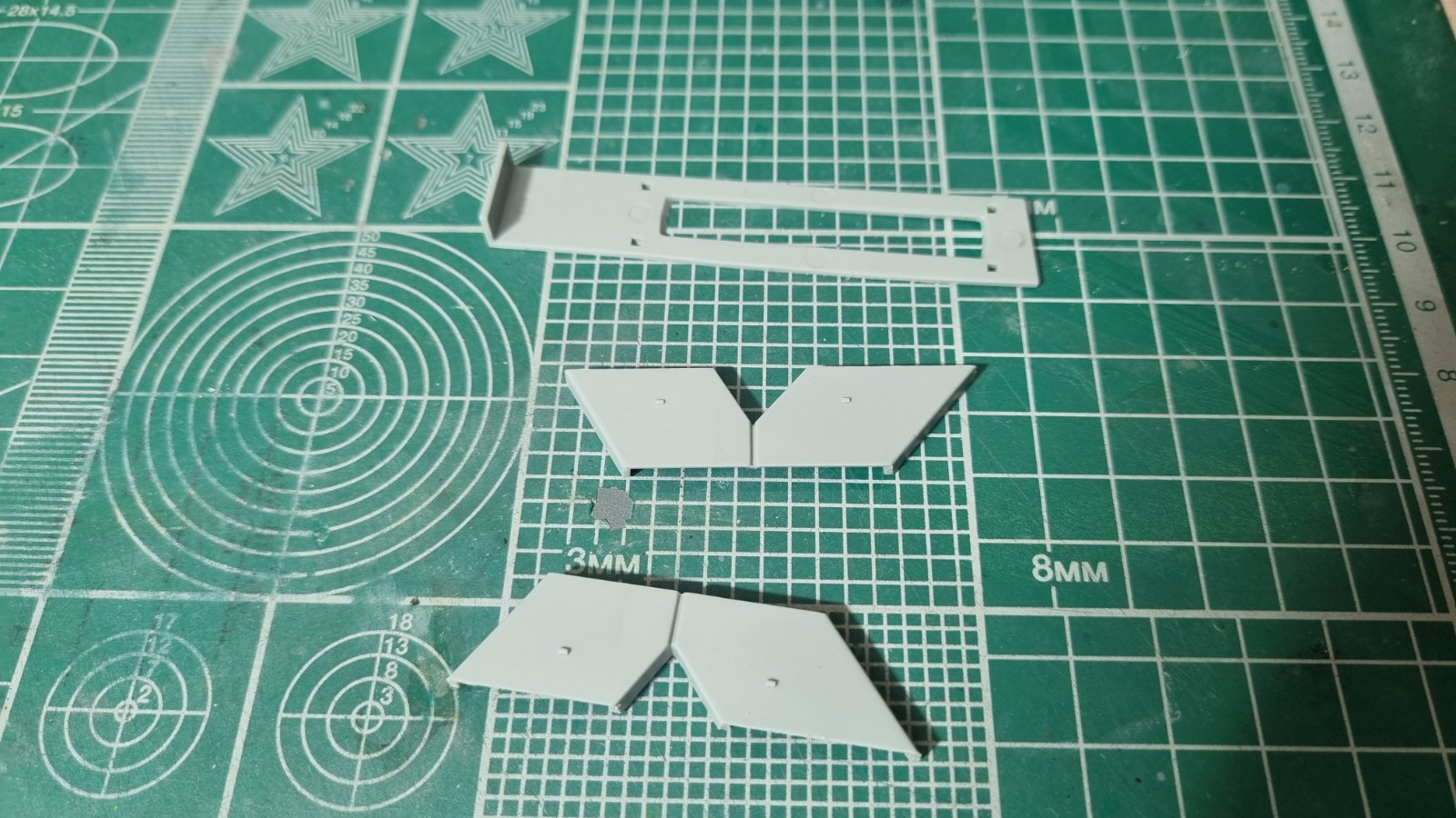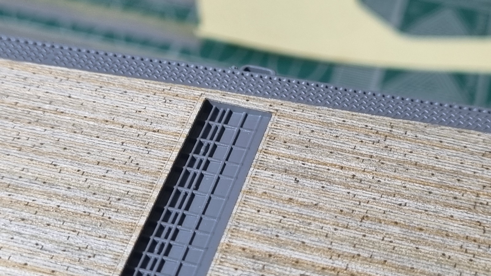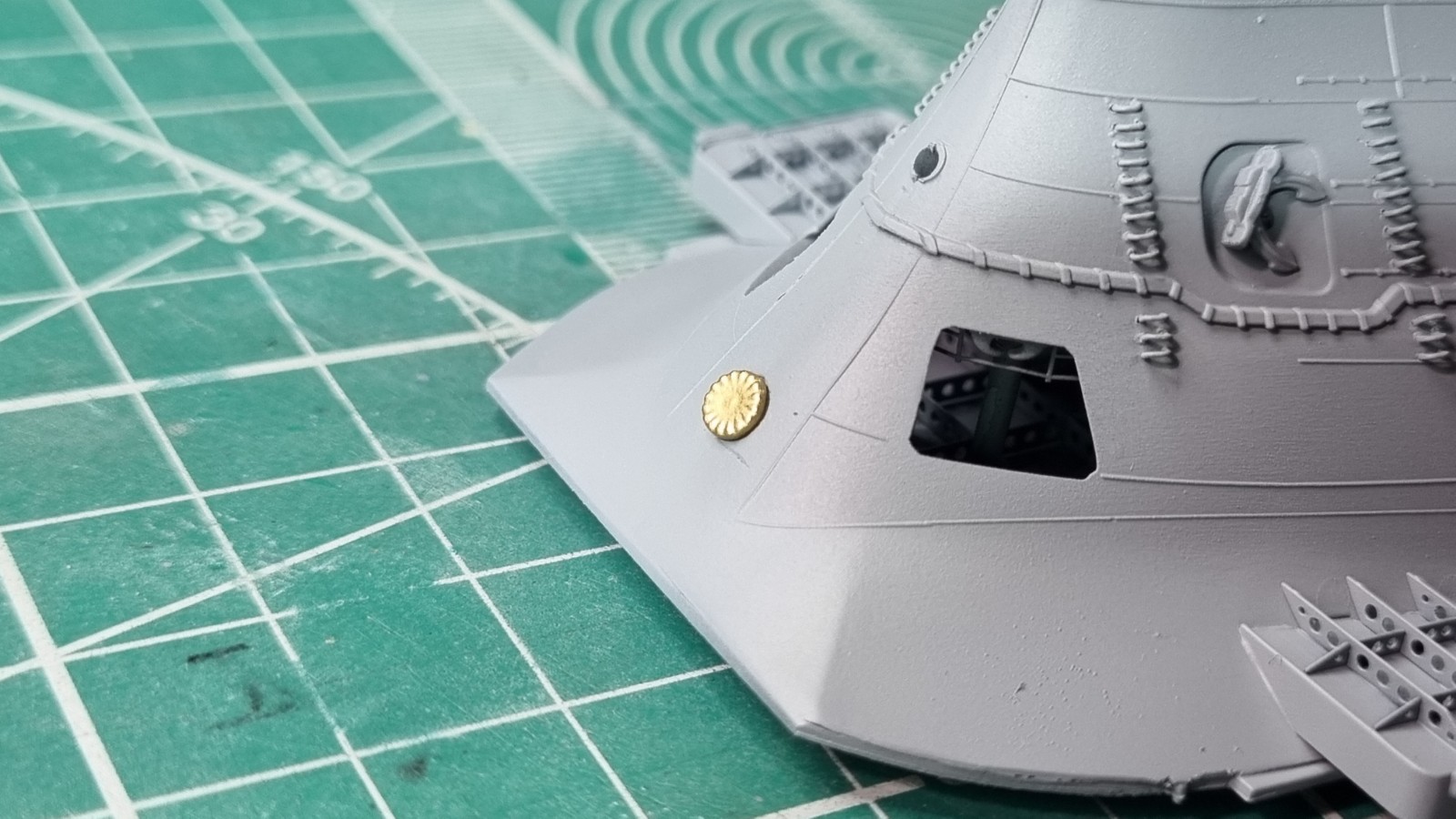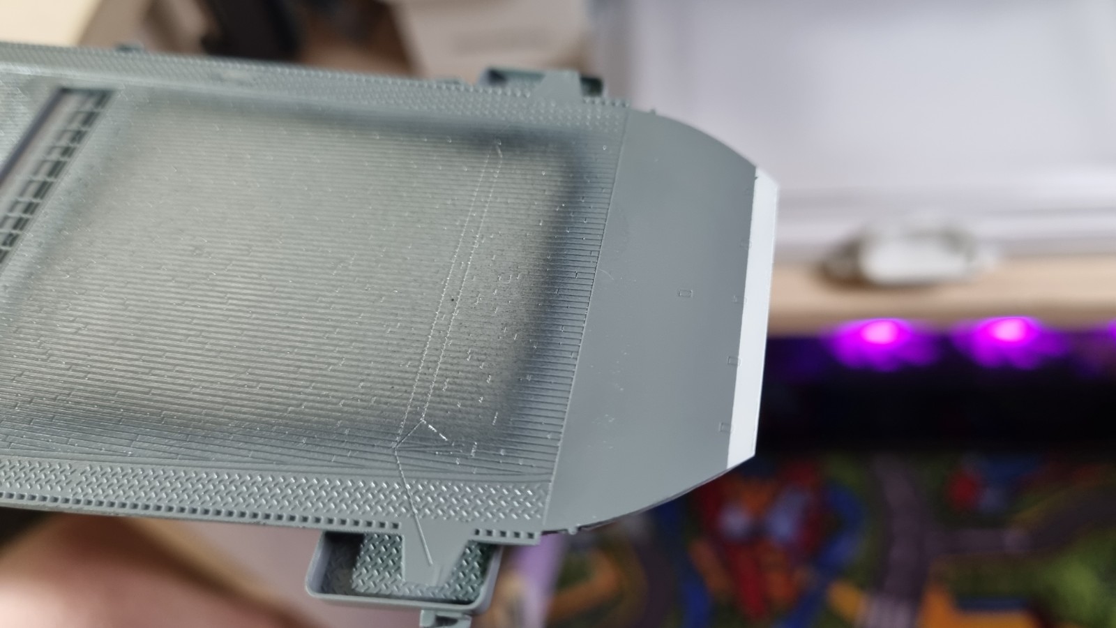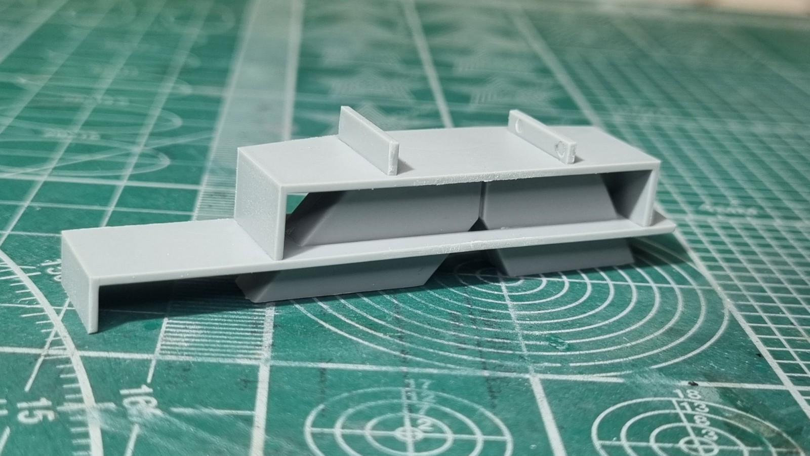 Первое, оно же главное. Кормовая часть не ложится в размер по длине где то на 1-'1,5 мм. То есть видимо придётся отрезать полоску на стыке с центральной частью.