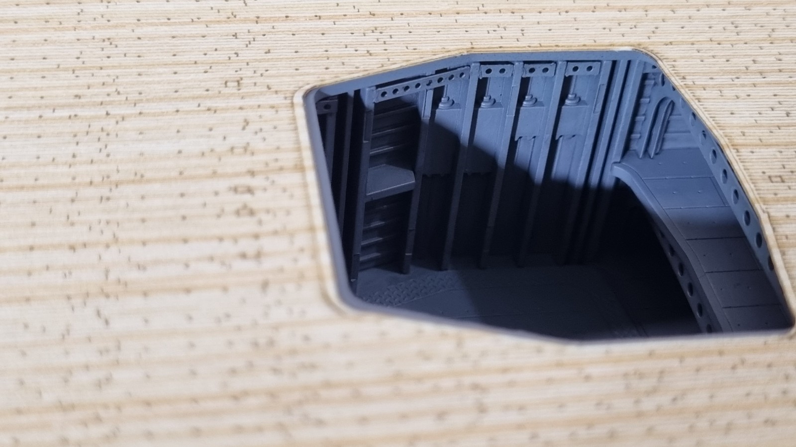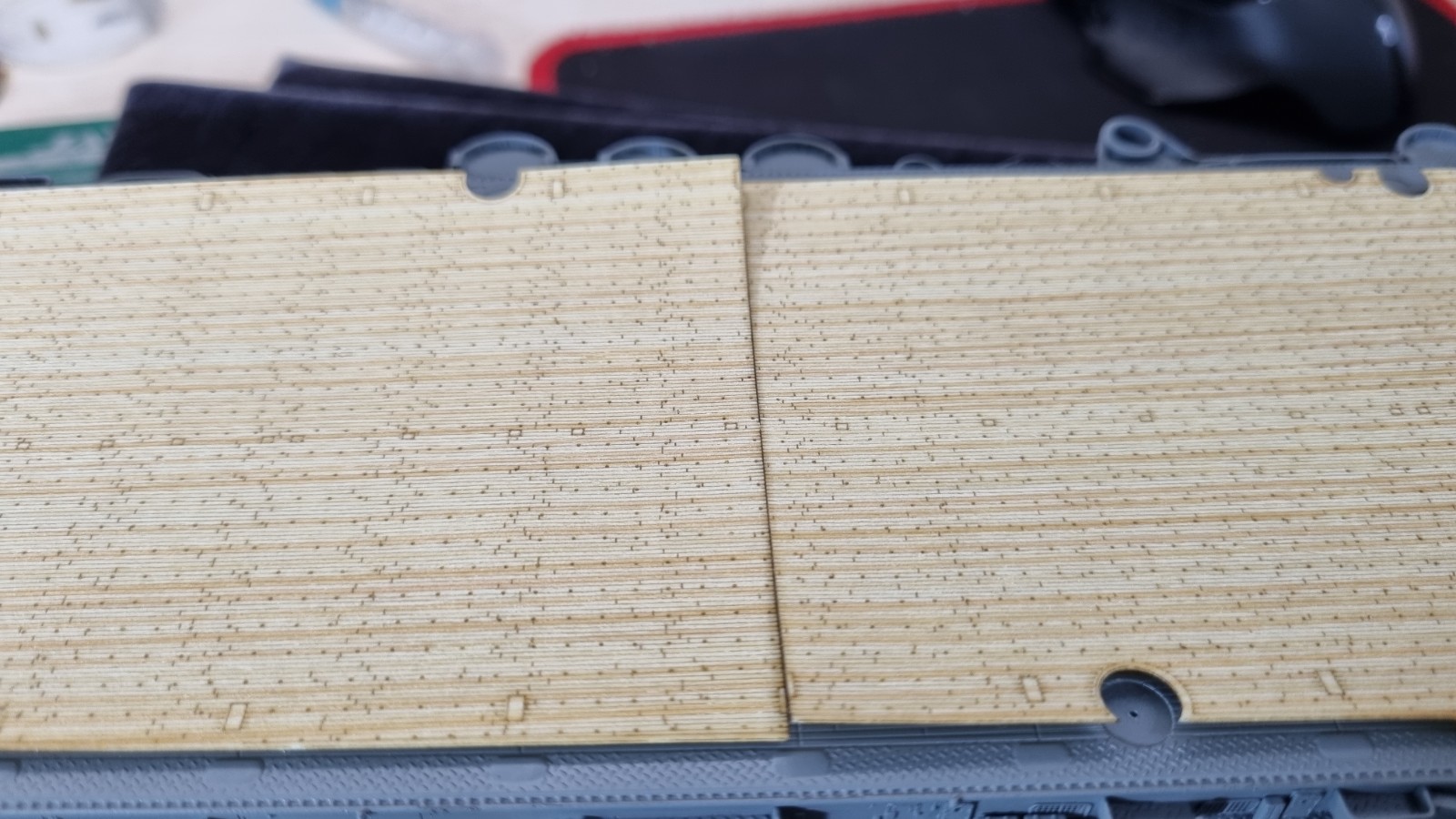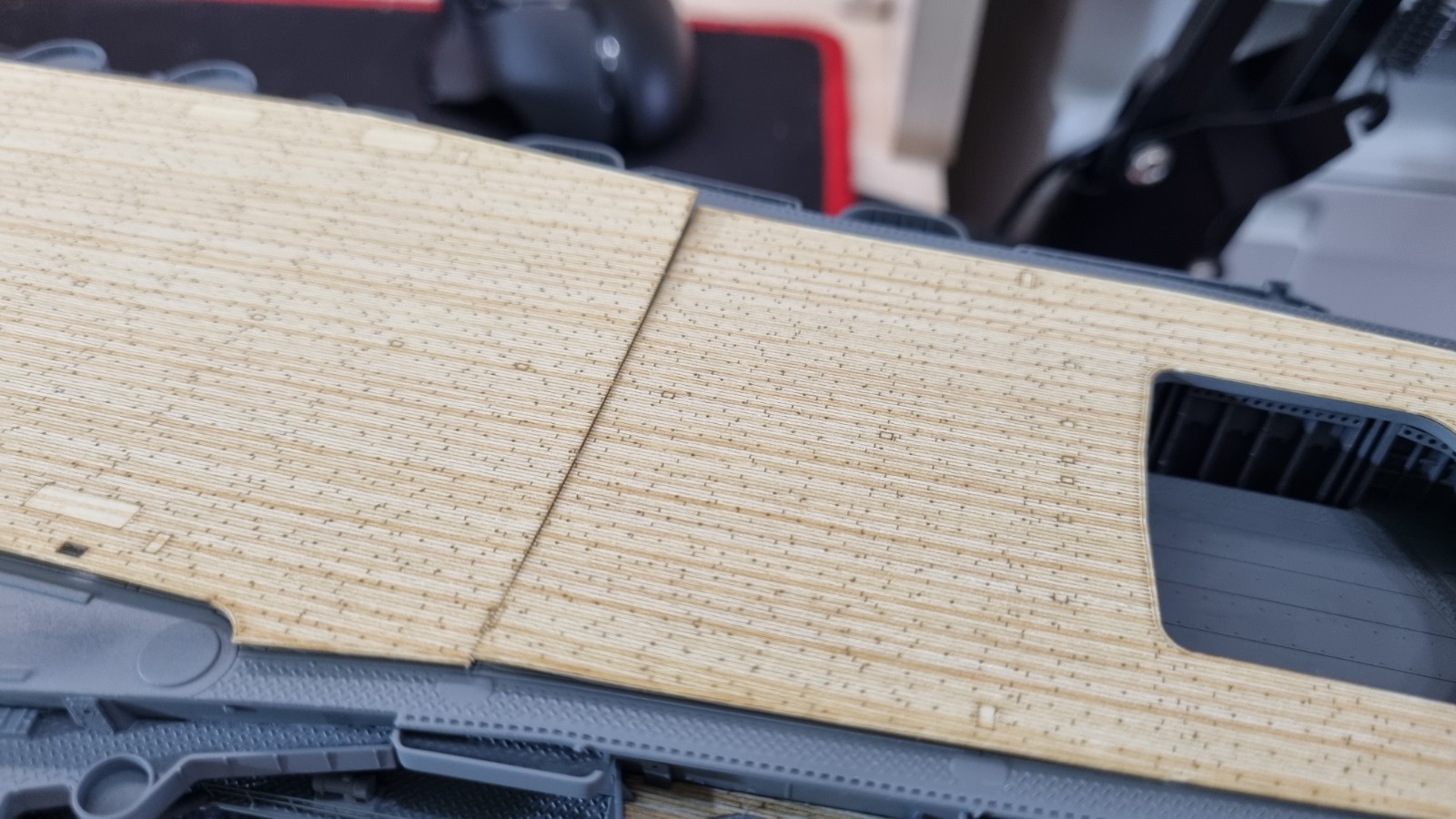 Итак. Произошли достаточно большие изменения. На выходных отработал деревянную палубу. Собственно говоря всё прошло достаточно хорошо. Клеится ститер хорошо отрывается и переключается тоже нормально))) из минусов пришлось подрезать кормовой стикер по длине. Есть небольшой косячёк с обходом прожектора, но в целом хорошо. Стыки частей, как и ожидалось, очень бросаются в глаза.