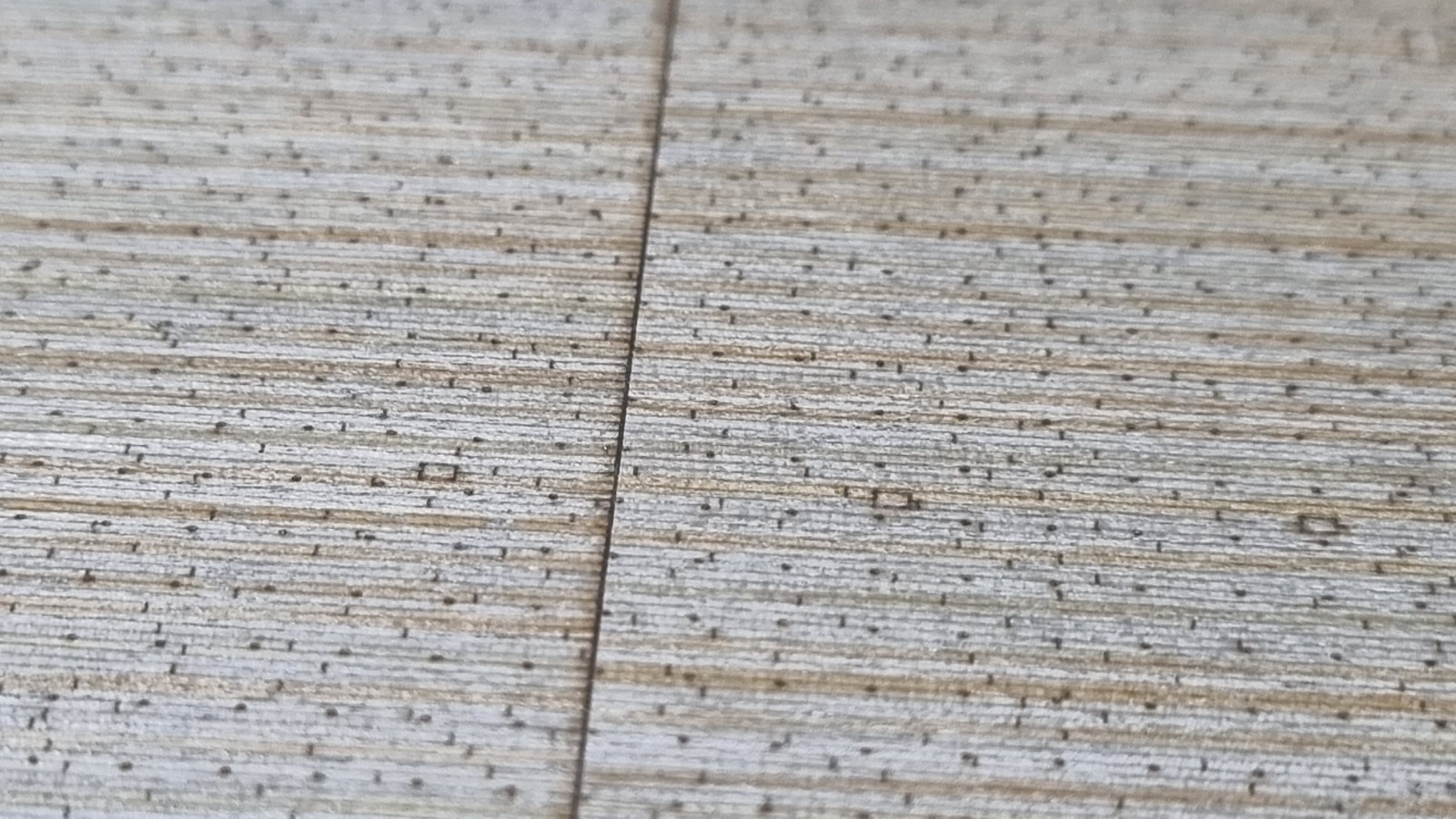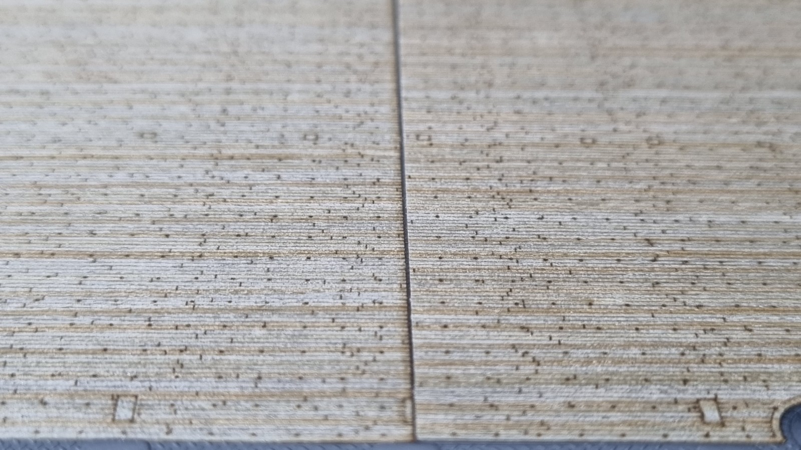 Нет, всё верно. Она деревянная. Но она не полностью деревянная. По краям металл. И как раз на металле трафарет. На дереве тоже трафареты в виде разметки, но об это чуть позже.