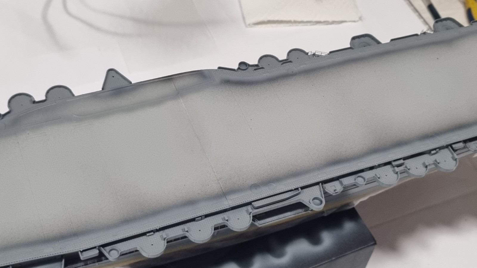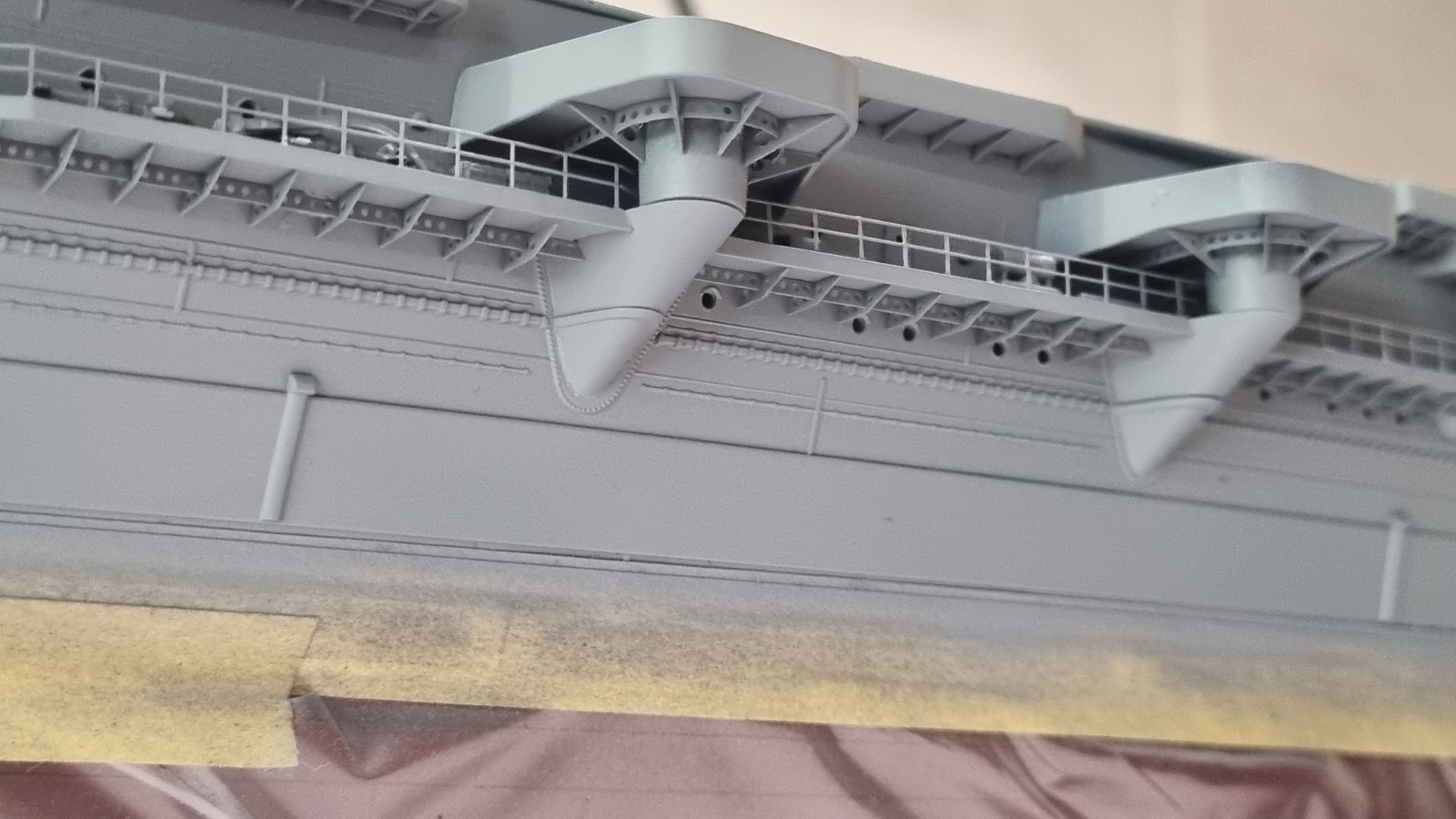 По делу. Приготовил я бортовые трапы и при примерке обнаружил что кое где они будут выступать над палубой. Соответственно уже не положить корпус вверх днищем. И вот что я решил. Сейчас подгрунтую всё необходимое и нанесу базу на надводный борт. Потом закончу с подводной частью и уже займусь деталировкой и деревянной палубой. Опять же, дерево клеится на палубы спонсонов крупнокалиберных зениток и без стикеров туда трапы не поставить. В общем одно за одно цепляется.