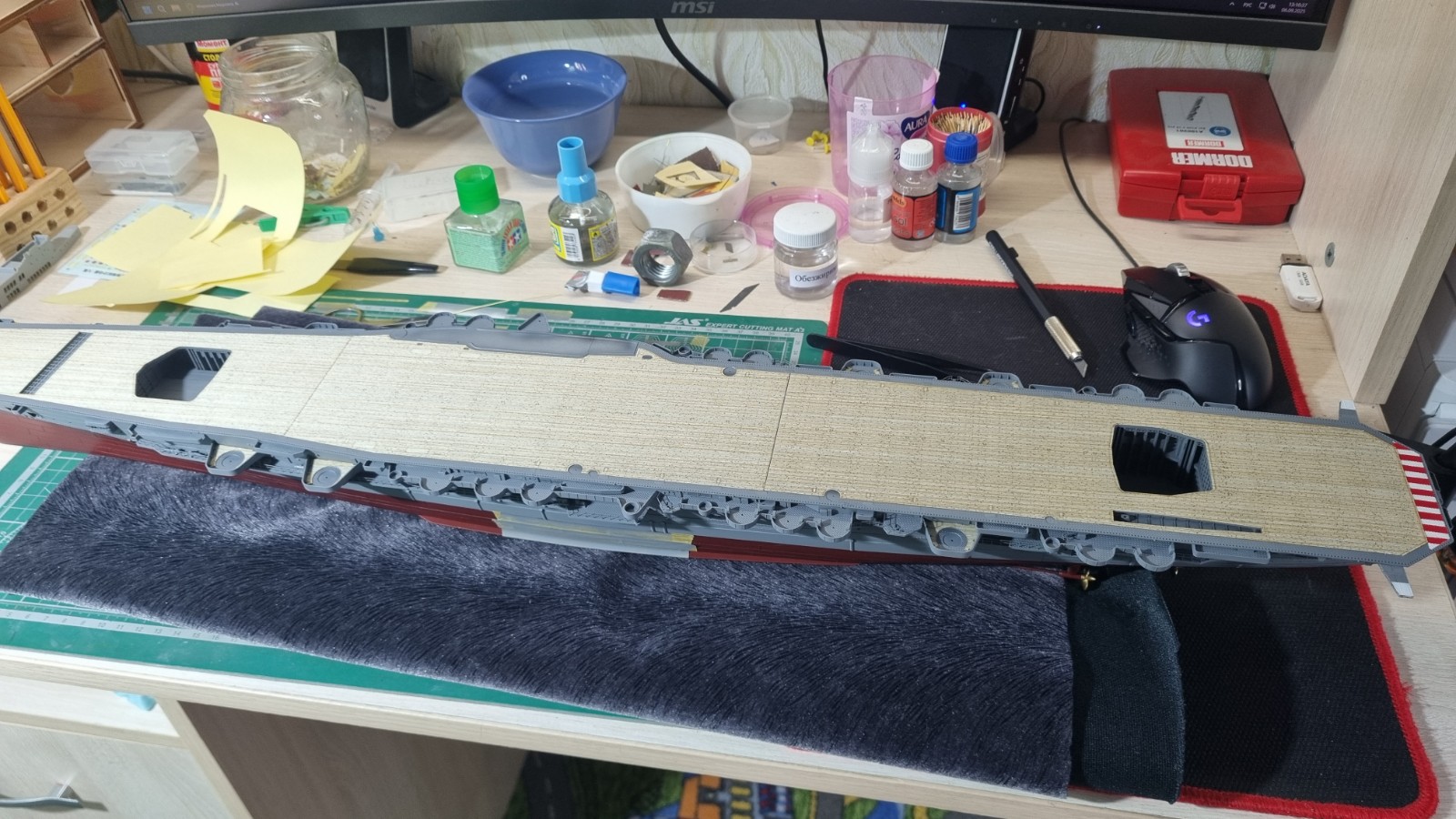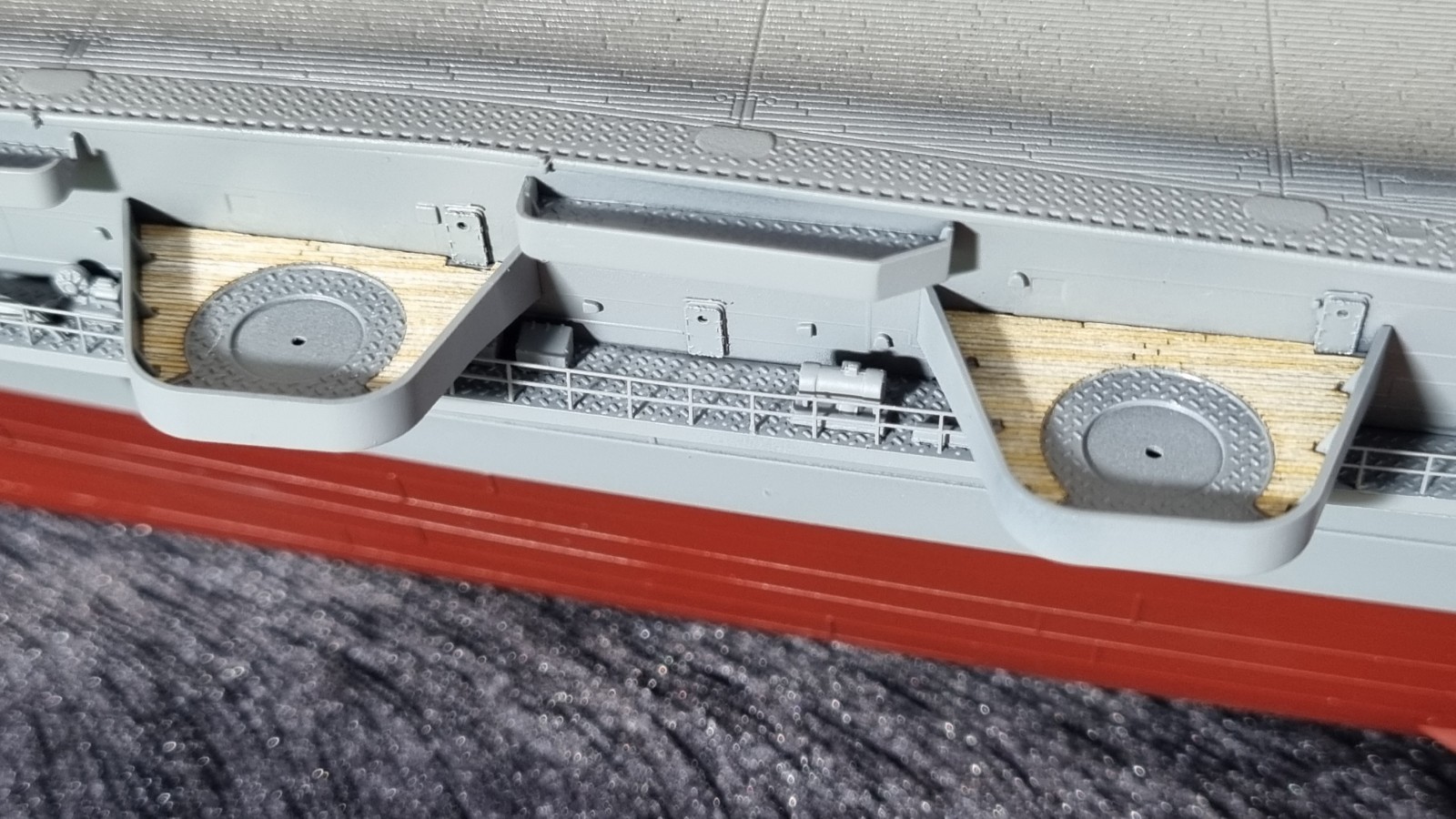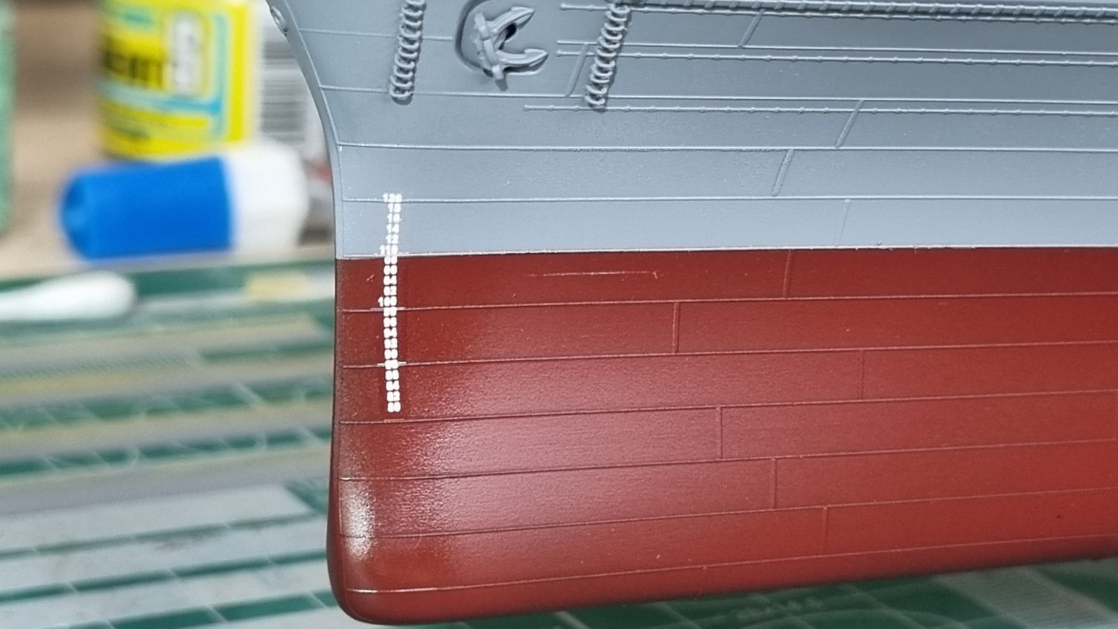 По подводной части остались марки осадки. В связи с этим янанес глянцевый лак на места марок и пока глянец был заряжен нанёс его на места приклейки деревянной авлубы. А именно на спонсоны крупнокалиберных зениток и на всю палубу.