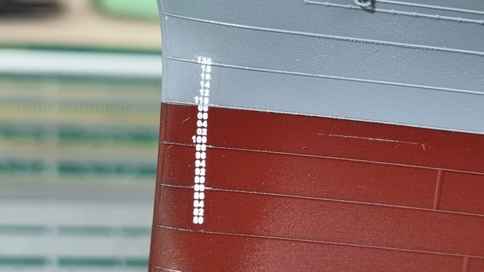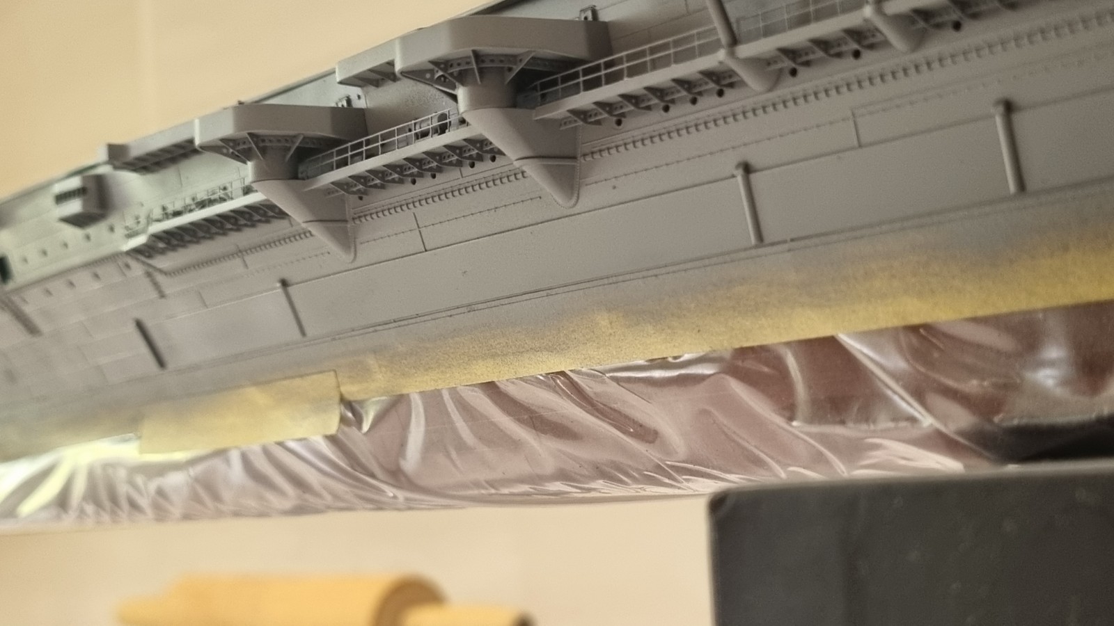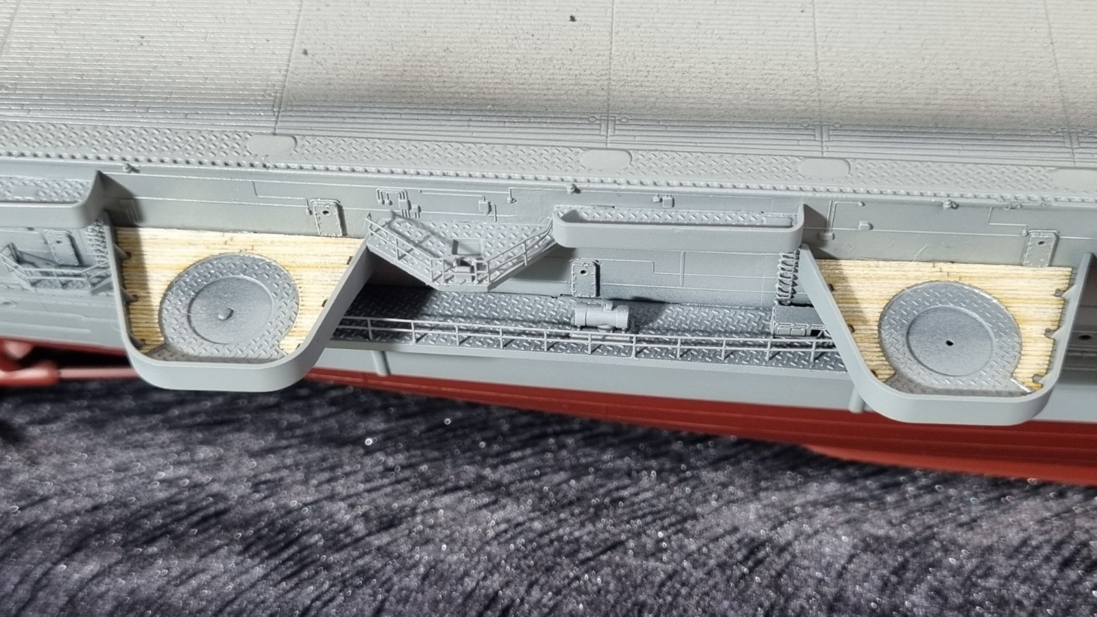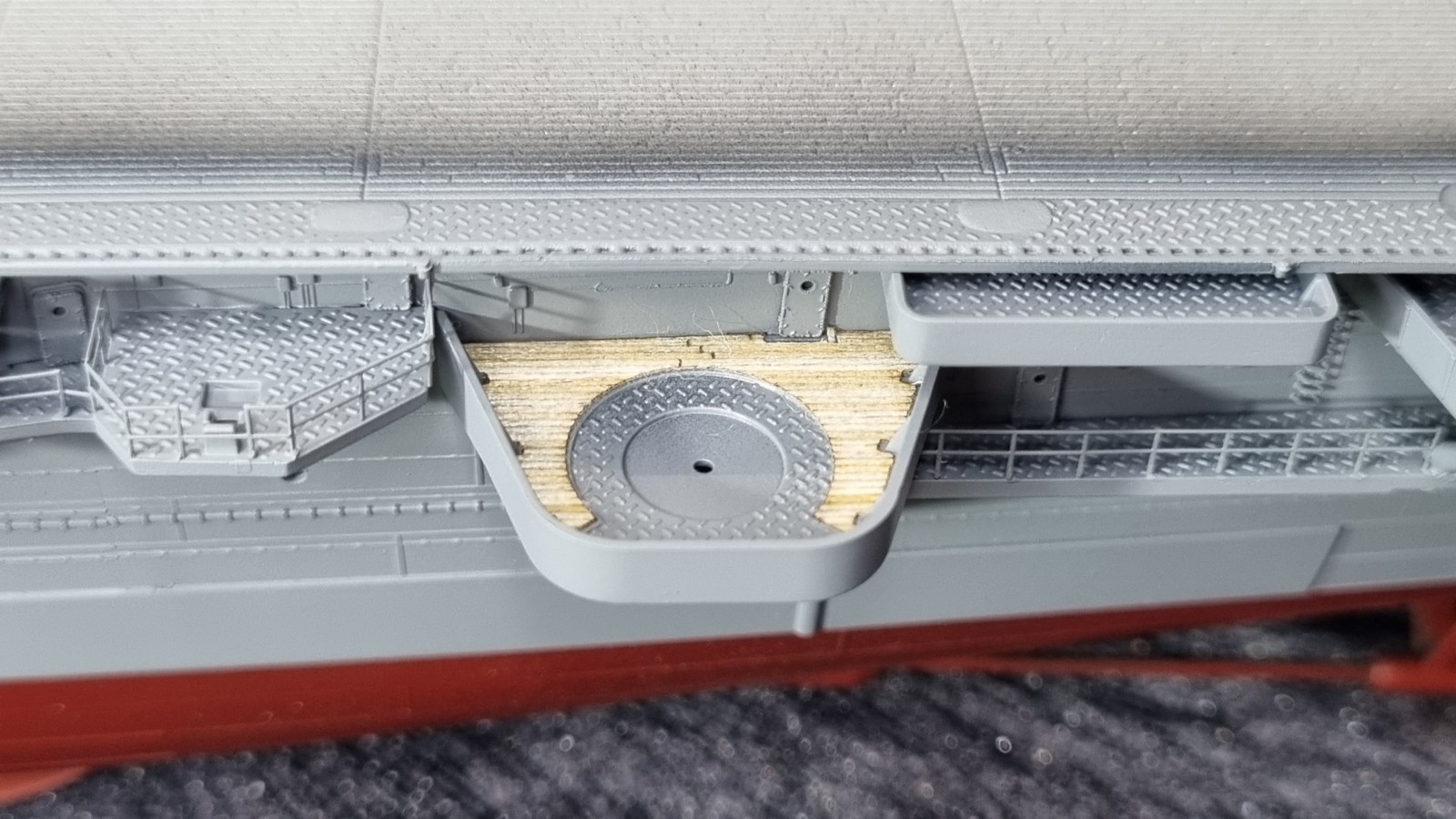 По подводной части остались марки осадки. В связи с этим янанес глянцевый лак на места марок и пока глянец был заряжен нанёс его на места приклейки деревянной авлубы. А именно на спонсоны крупнокалиберных зениток и на всю палубу.
