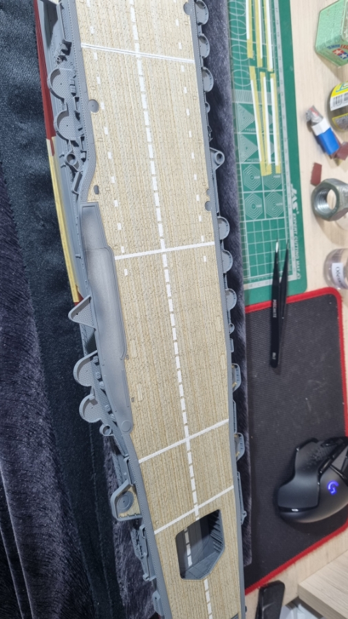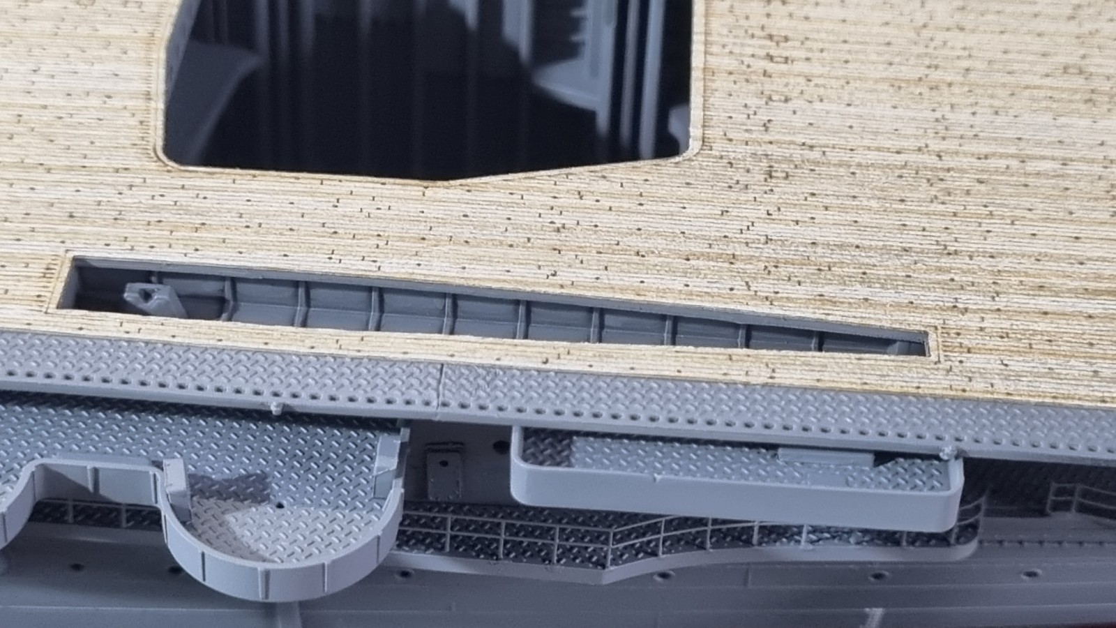 Примерил палубу. Результаты так себе. Не знаю зачем её разделили на три части. Коробка позволяет. Хотя наверно китайцы решили что с таким длинным элементом работать будет сложно.