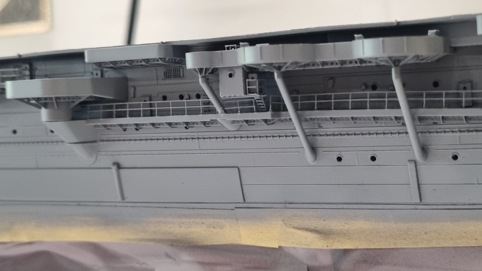 Как по мне, я бы в стороны антенны убрал. Во-первых группа на палубе, во-вторых, так более масштабно смотрится (с самолетами и поднятыми антеннами как то куцо, плюс загромождает). С поднятыми было бы лучше в диорамму.