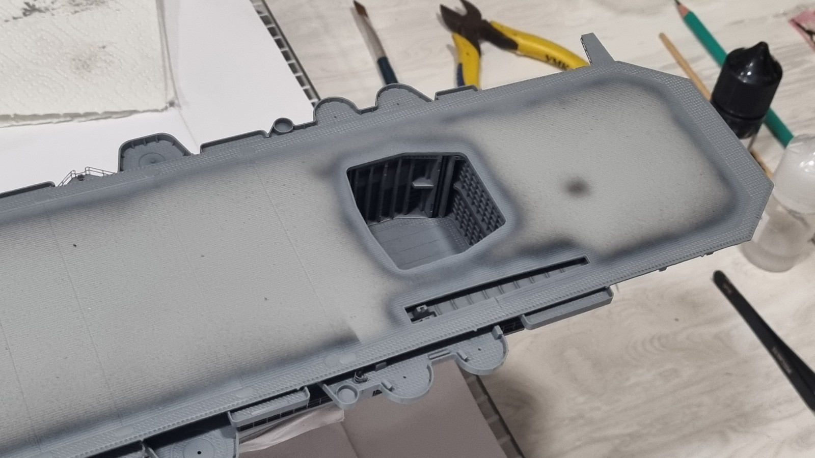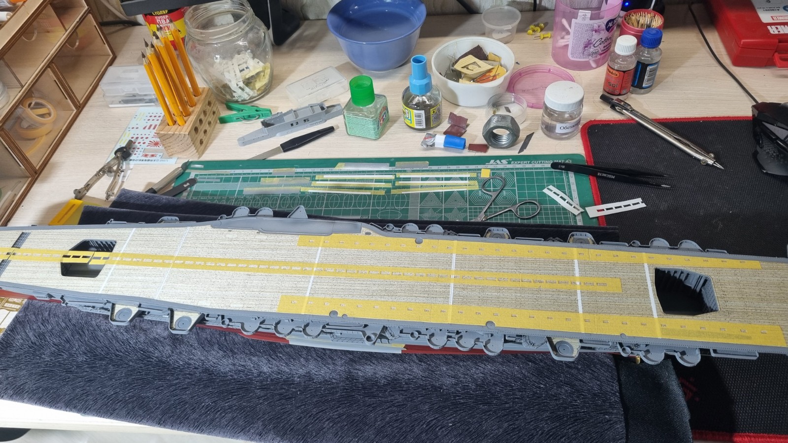 И ещё один палубный этап. Разметка. Очень классно что в наборе есть маски для неё. Единственное, что я не учёл, это то, что разметка и по носовой лифту ппрходит. Пришлось рисовать её внутри и было не удобно. Плюс краска рамтеклась по чечевице. Ну да это поправимо. В самом начале ошибся с жидкостью краски и на корме растеклись поперечный полосы немного. Боюсь, это уже не устранимо. Прикроется самолётами.))) Стыки частей стикера замаскировал поперечной разметкой. Осталось лаком "запечатать" и можно искать время для продолжения стройки.