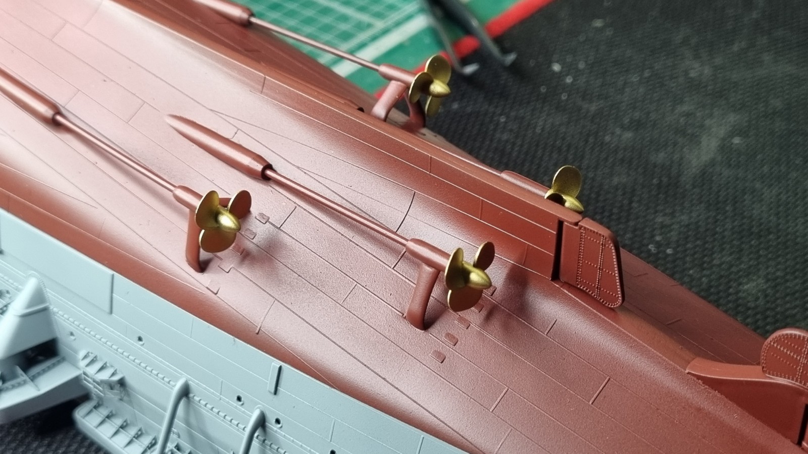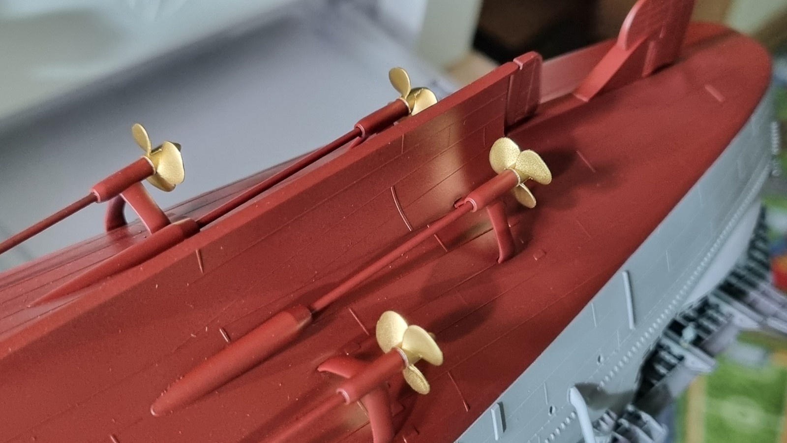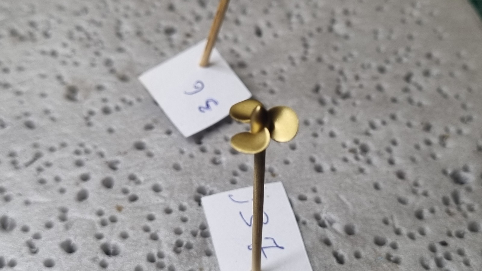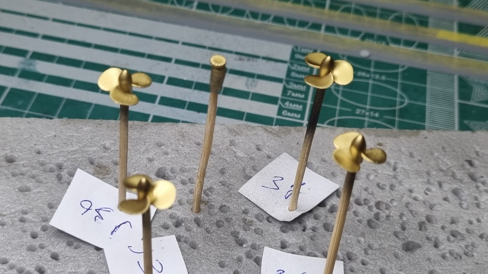 Но вот поставив винты на валы, я понял что затопил маловато. Так что винты будут... с толстыми лопастями.