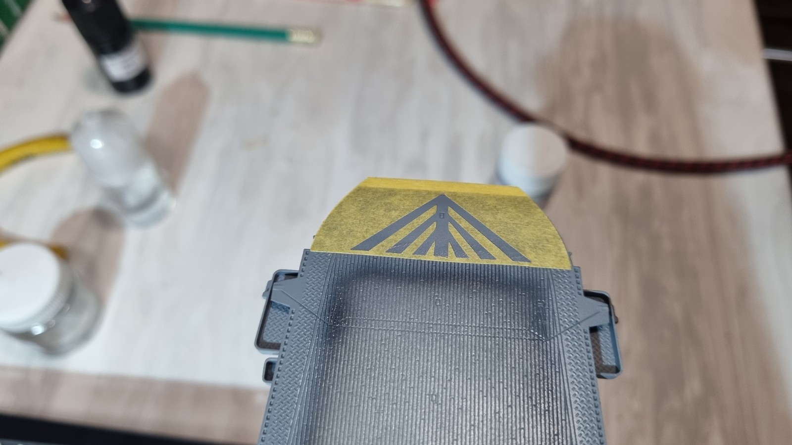 Нанёс трафарет на носовую часть палубы. Трафарет в комплекте. Удобно, хотя повозиться с ним пришлось. Клей достаточно сильный. Так же есть декаль. Видимо как часть более простого набора.
