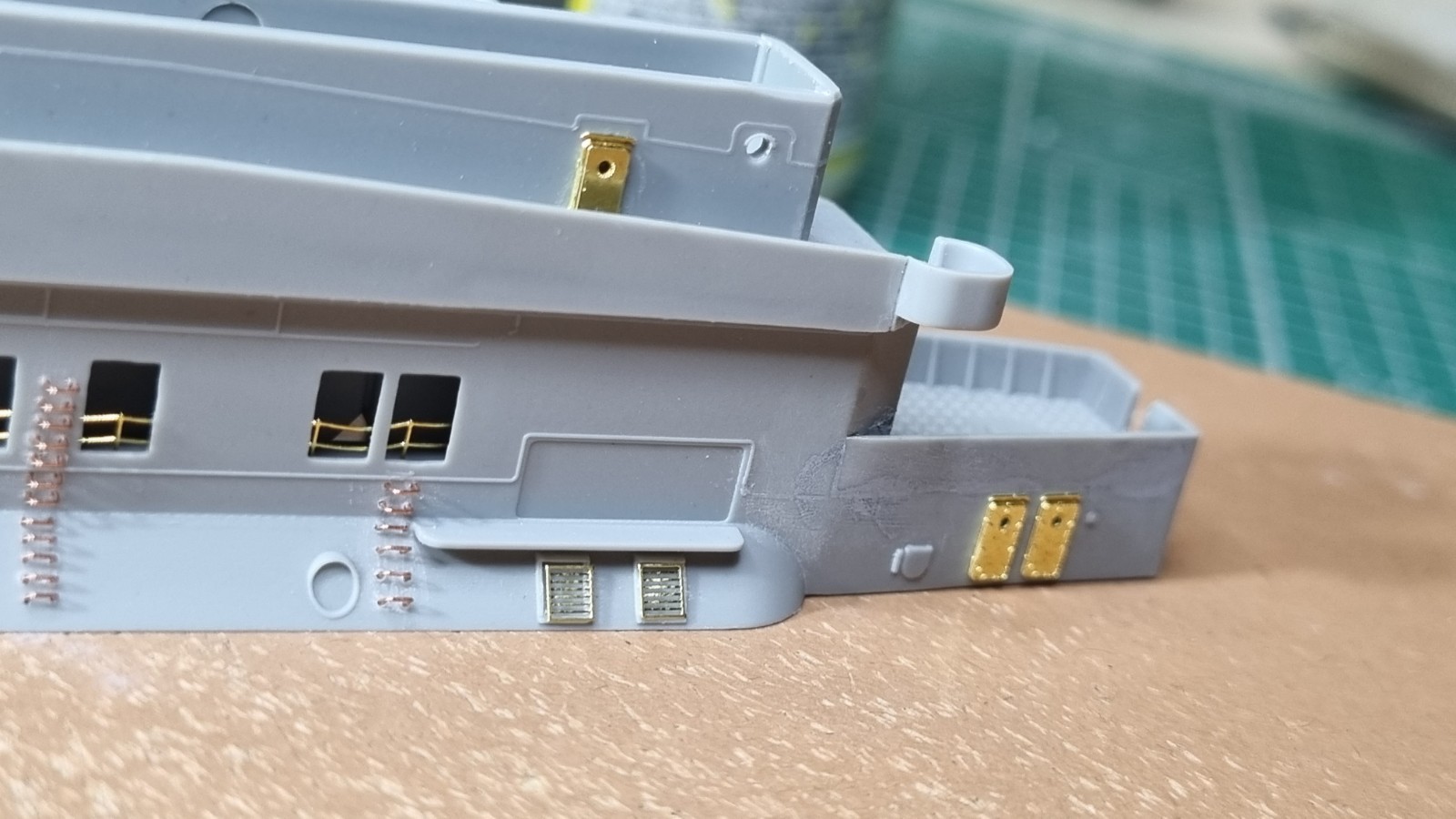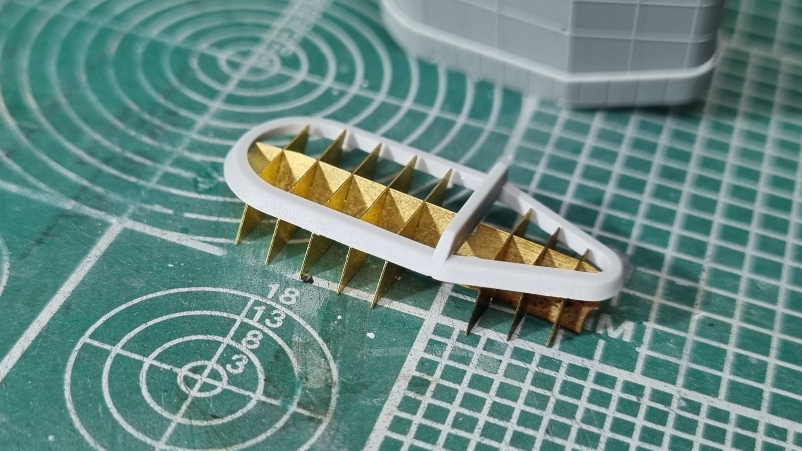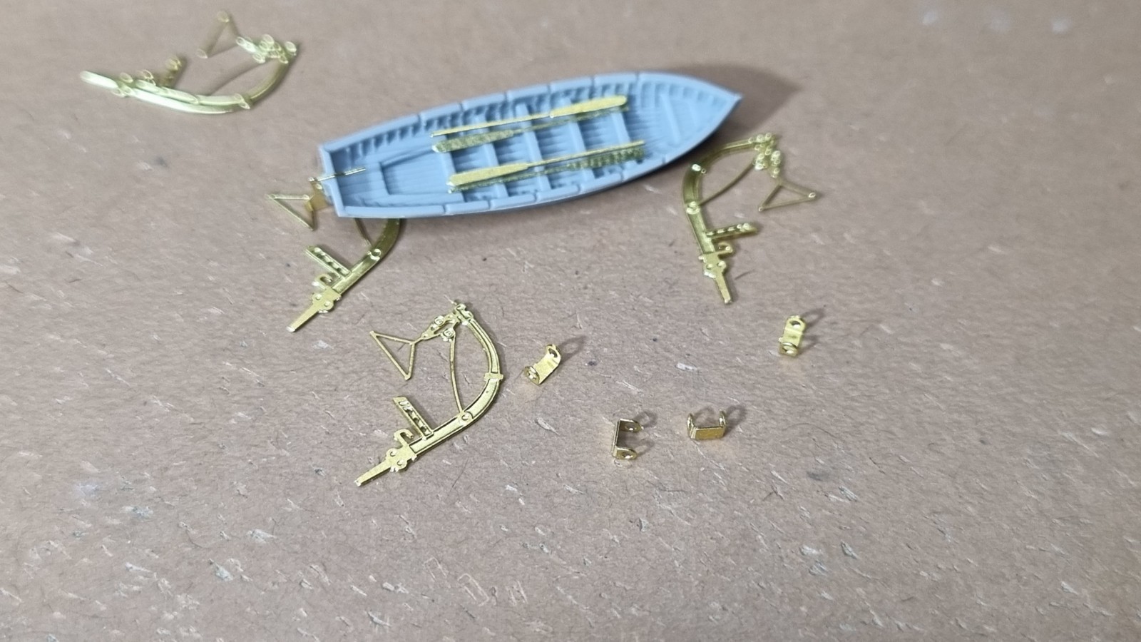 Подготовил бортовые шлюпки, шлюп-балки, и аварийный руль. Интересно, что если собирать пластик, то шлюпки эти ставятся на балконы и соответственно балки смотрят к борту, а если делать в травлении, то они вывешиваются от борта и крепятся лентами (забыл как называются).