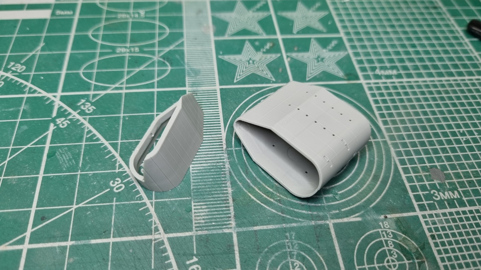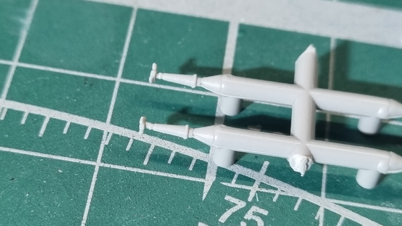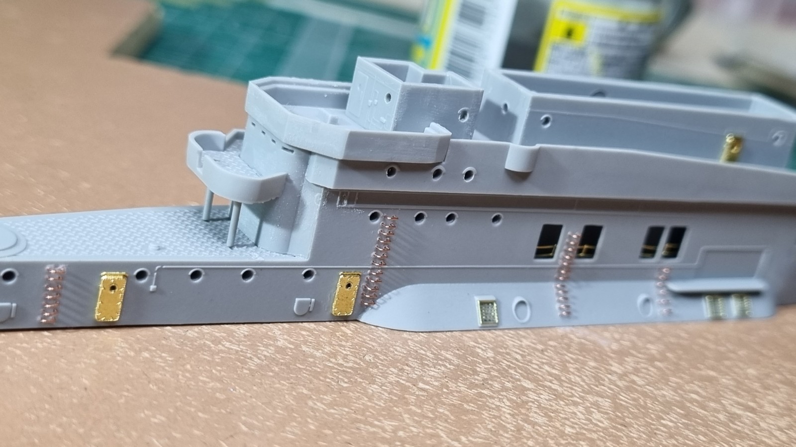 Подготовил бортовые шлюпки, шлюп-балки, и аварийный руль. Интересно, что если собирать пластик, то шлюпки эти ставятся на балконы и соответственно балки смотрят к борту, а если делать в травлении, то они вывешиваются от борта и крепятся лентами (забыл как называются).