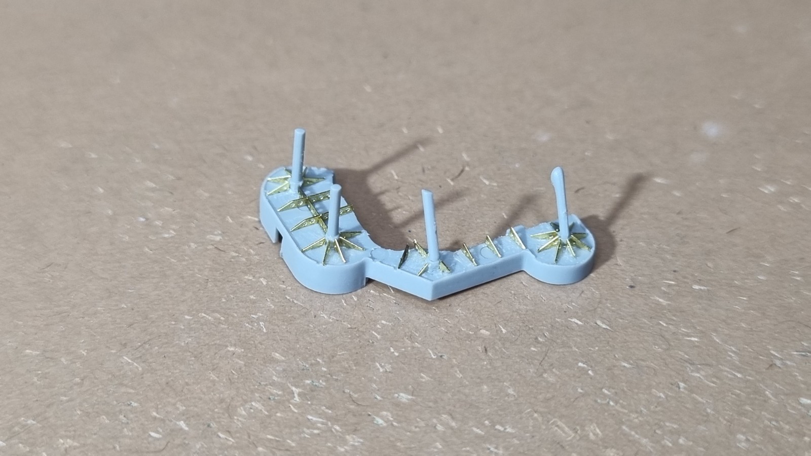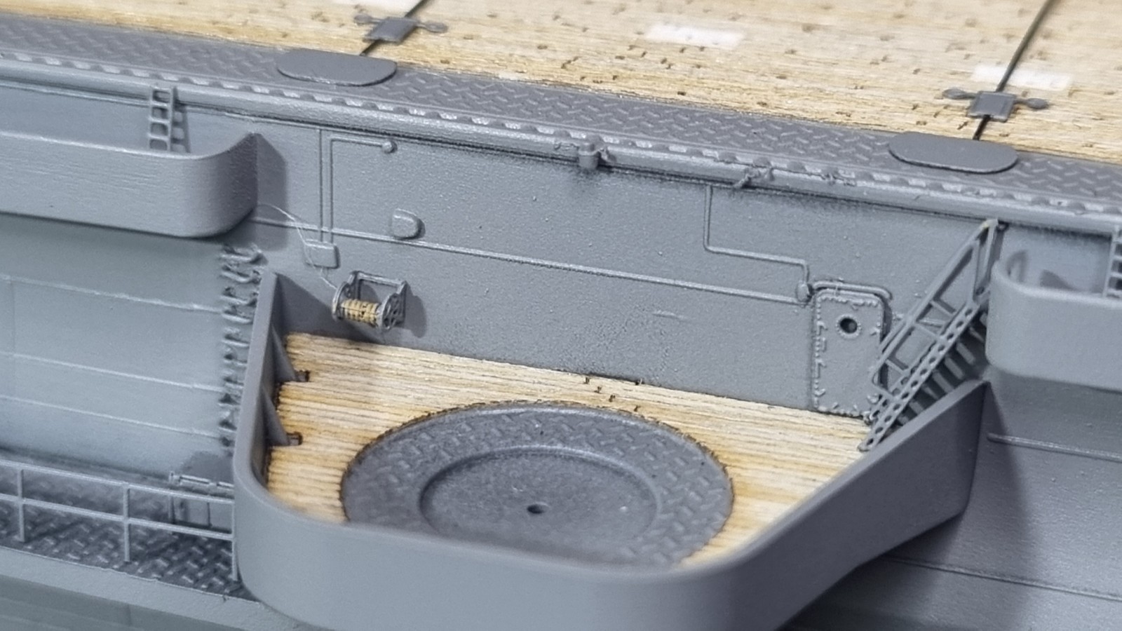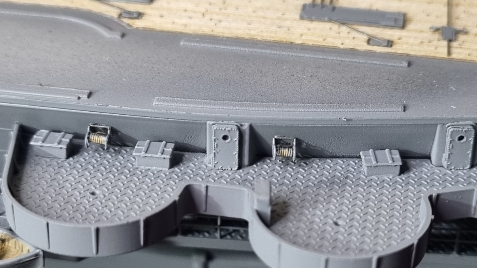 Началась установка тросов. Сами тросы покрасил Ган Метал. Что бы хоть чуть придать им бескучесть/натертость. Так же поставил люки прожекторов. Они открываются (сдвигаются на направляющих), прожектора поднимаются. Есть вариант в травлении сделать без прожекторов с закрытыми люками. Но кто же так будет делать...?))))