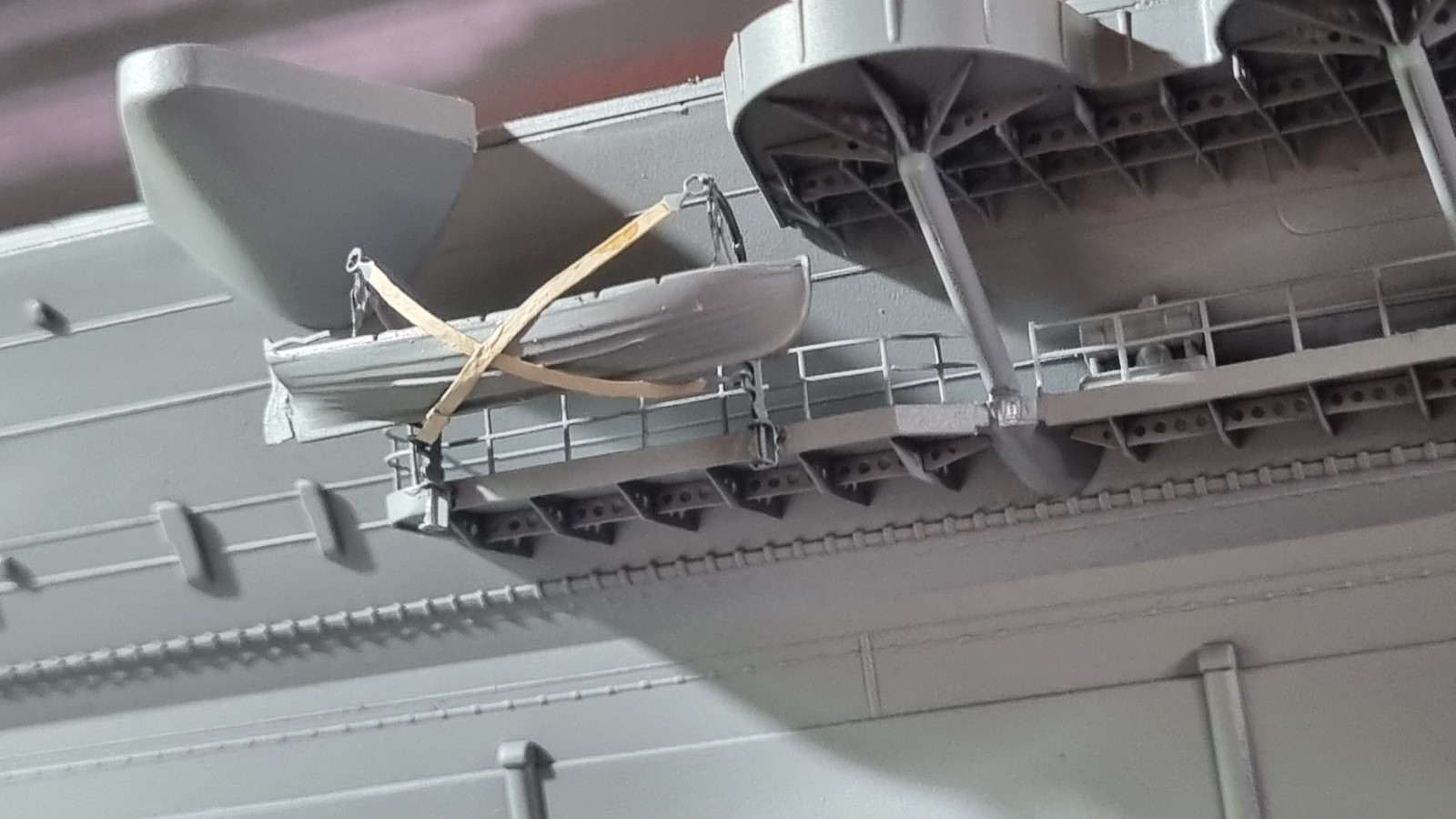 Бортовые шлюпки приделаны к борту. И что? А то, что утром я понял какой я феерический де... умственно отсталый человек!!! Я так сосредоточиться внимание вчера на лентах этих шлюпок, что совершенно забыл, что они на разные борта ставятся и должны быть зеркальны!!! Теперь одна смотрит вперёд, другая на корму! Блин!!! Это ж надо так опростоволоситься!!!