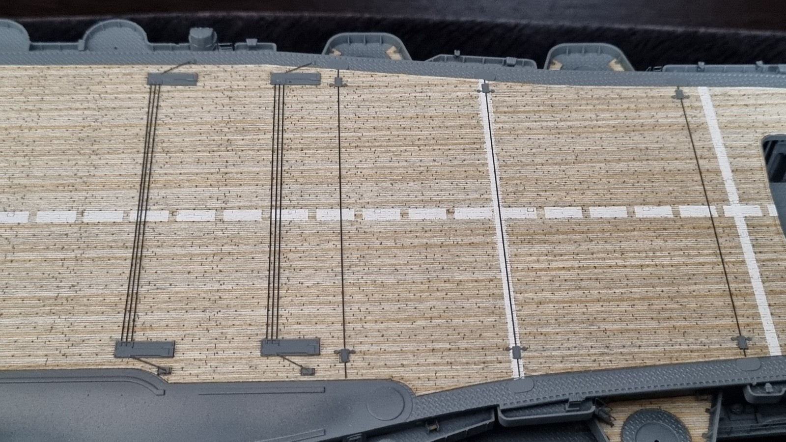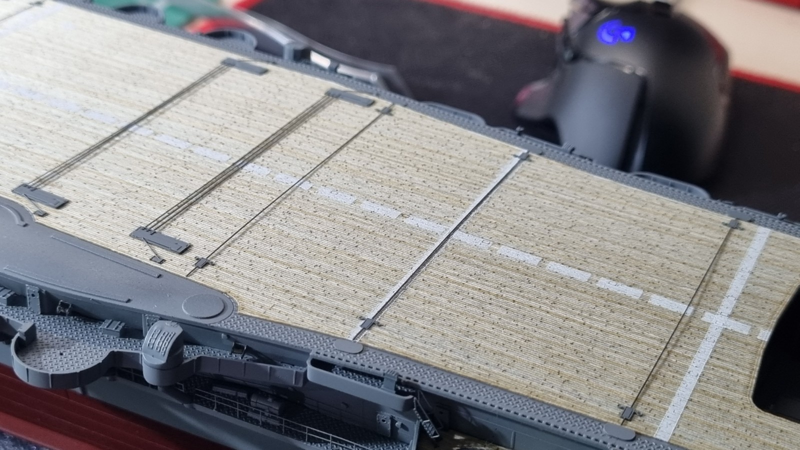 Тем временем выявилась проблема с палубой. Я как то говорил, что она тонкая и без жесткостей. И теперь происходит вот что, ночью корпус стоит в ящике комода и всё хорошо. А достав и пол часа поработал с ним палуба немного изгибается и тормозные тросы изгибаются дугой в разных плоскостях. Не знаю что пока с этим делать...