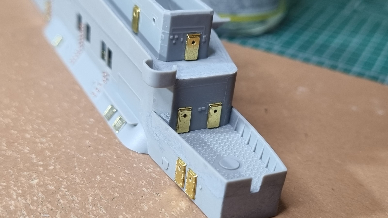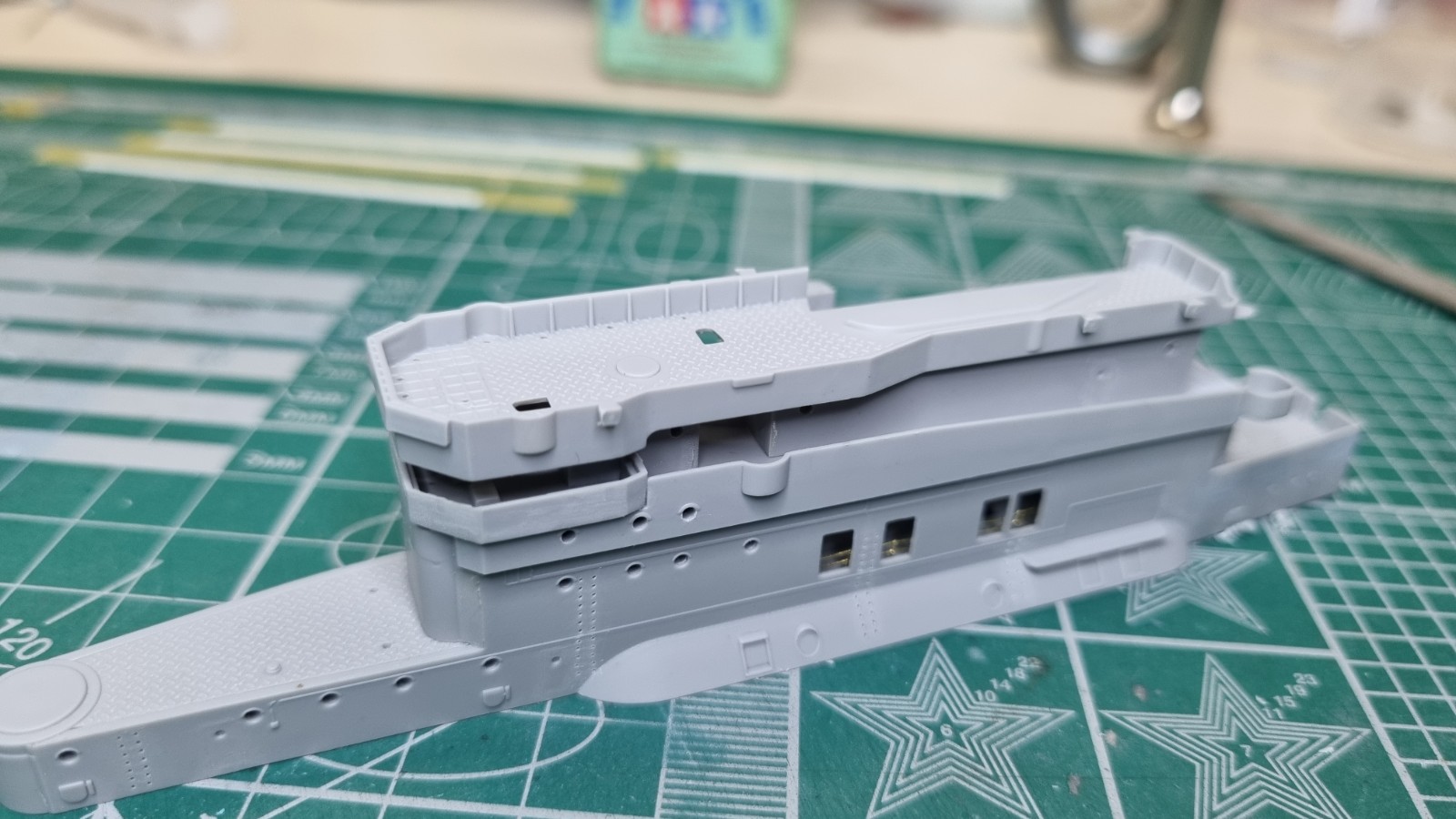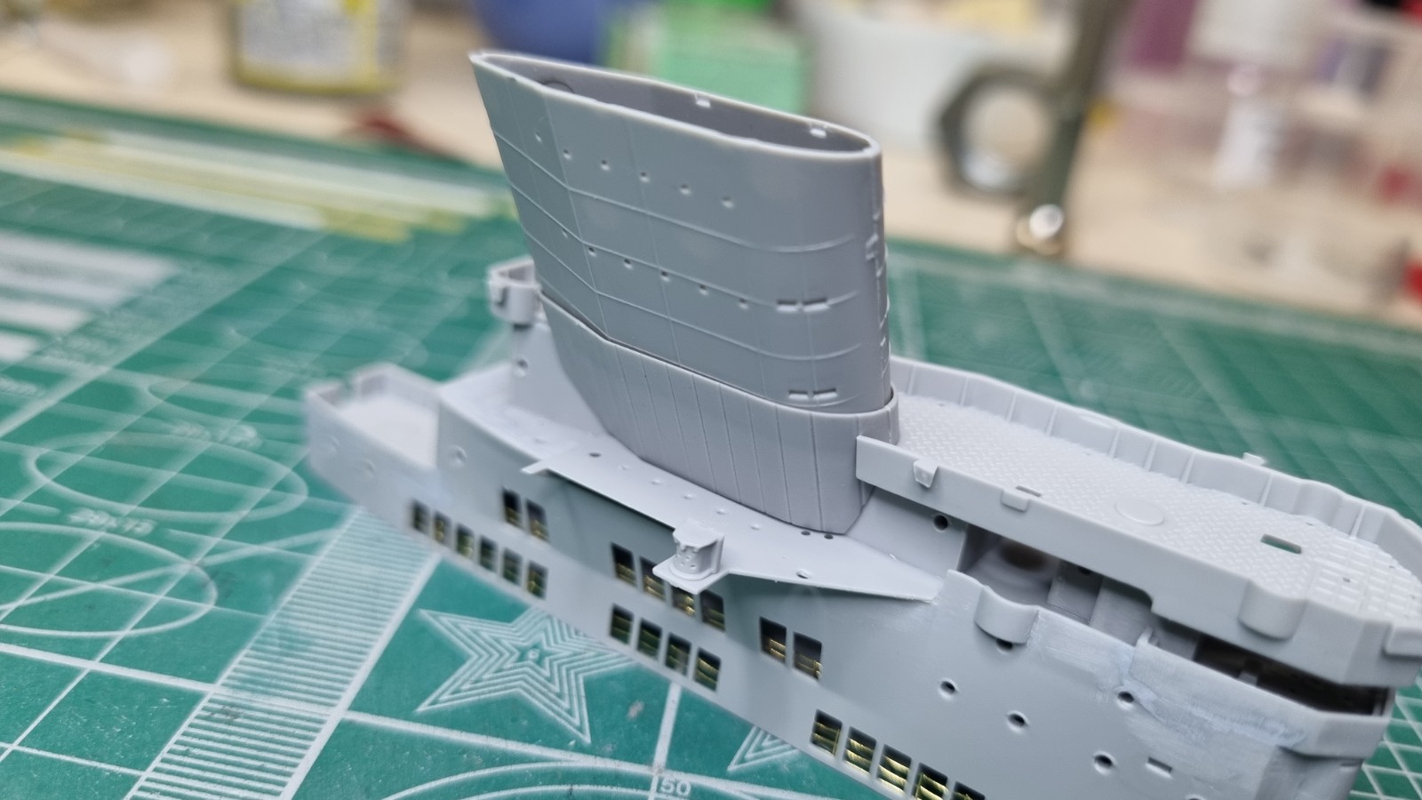 Собираю и примеряю (подгоняю) крупные части острова. Верхняя палубы вроде нормально накрыла всё. Труба в процессе.