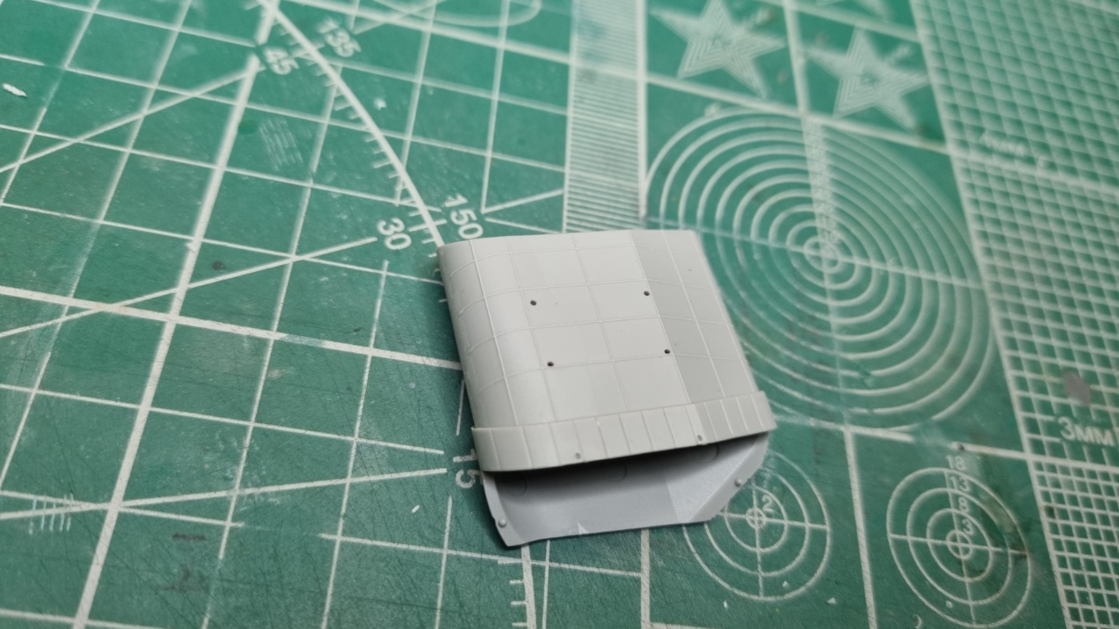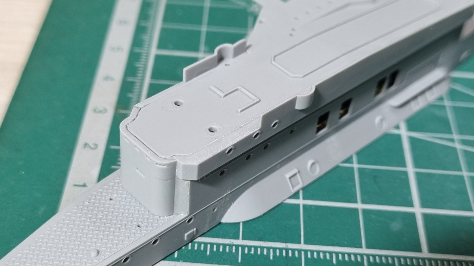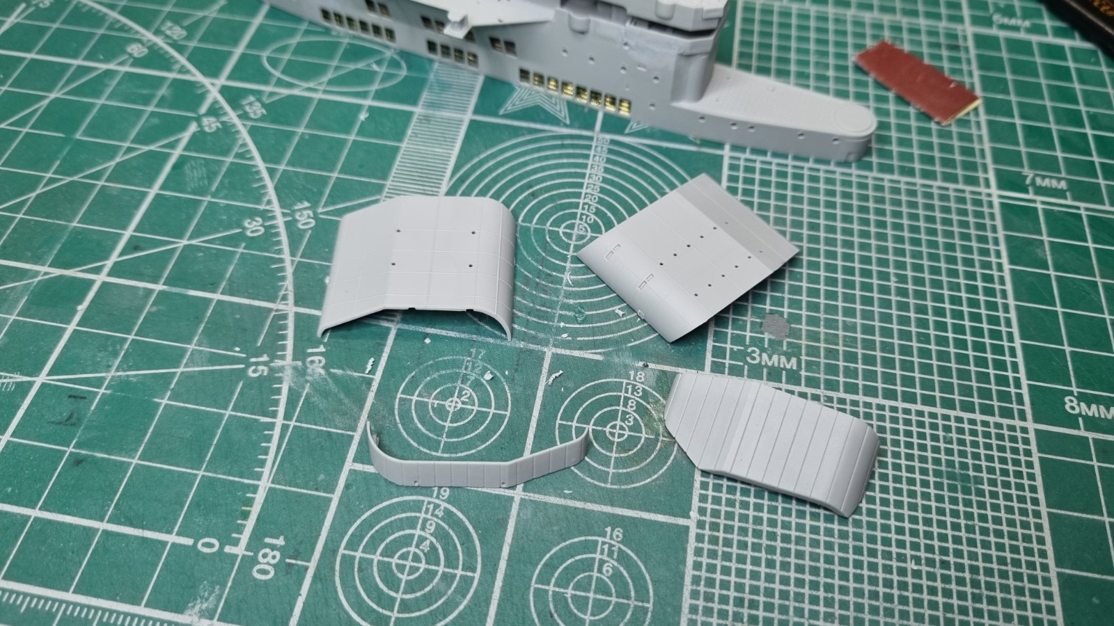 Собираю и примеряю (подгоняю) крупные части острова. Верхняя палубы вроде нормально накрыла всё. Труба в процессе.