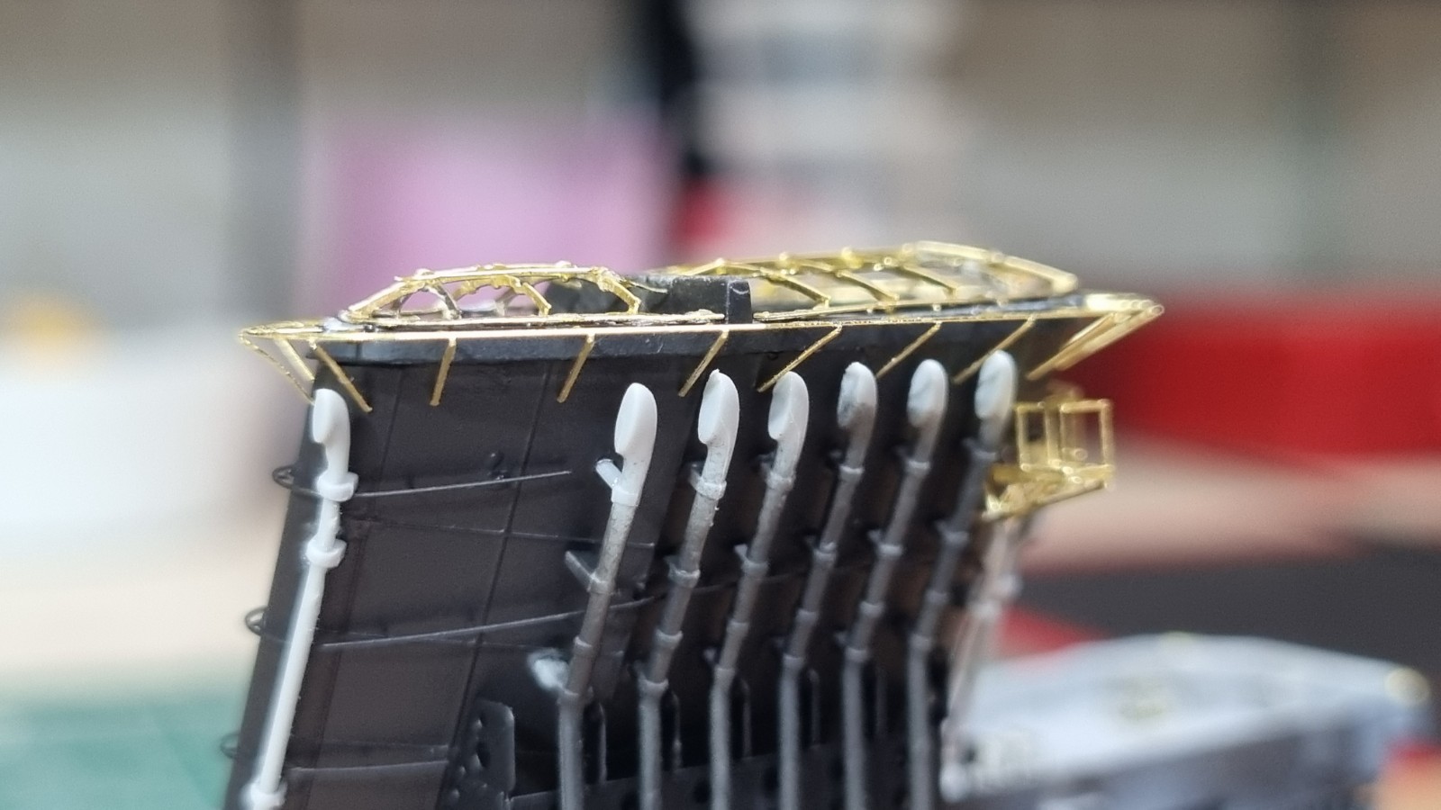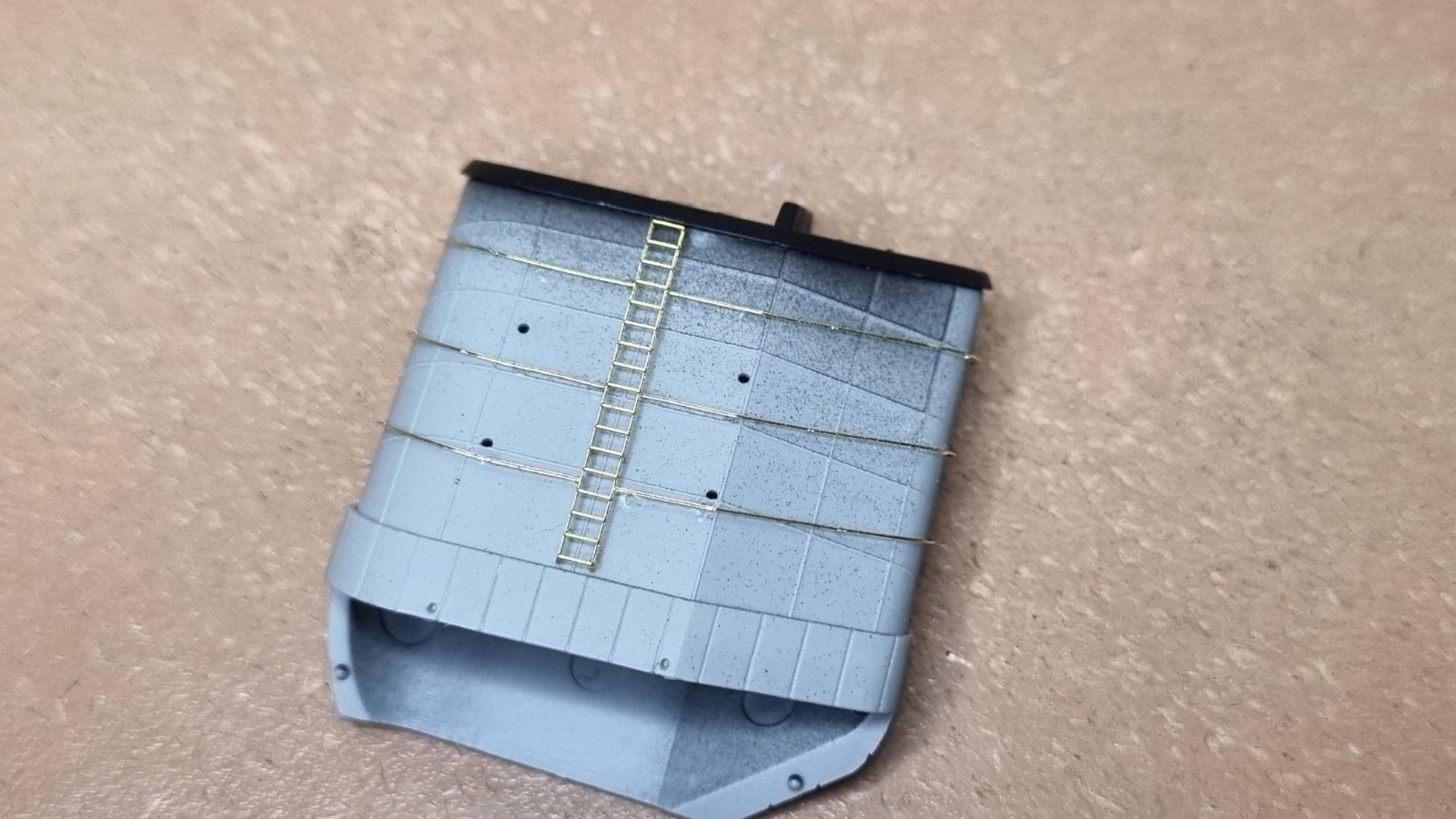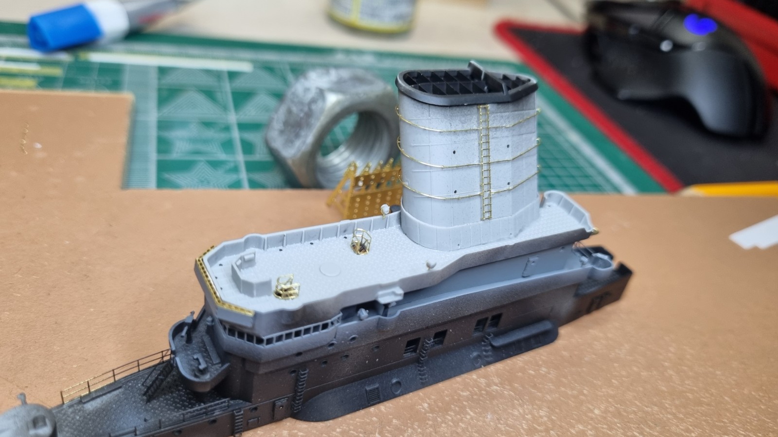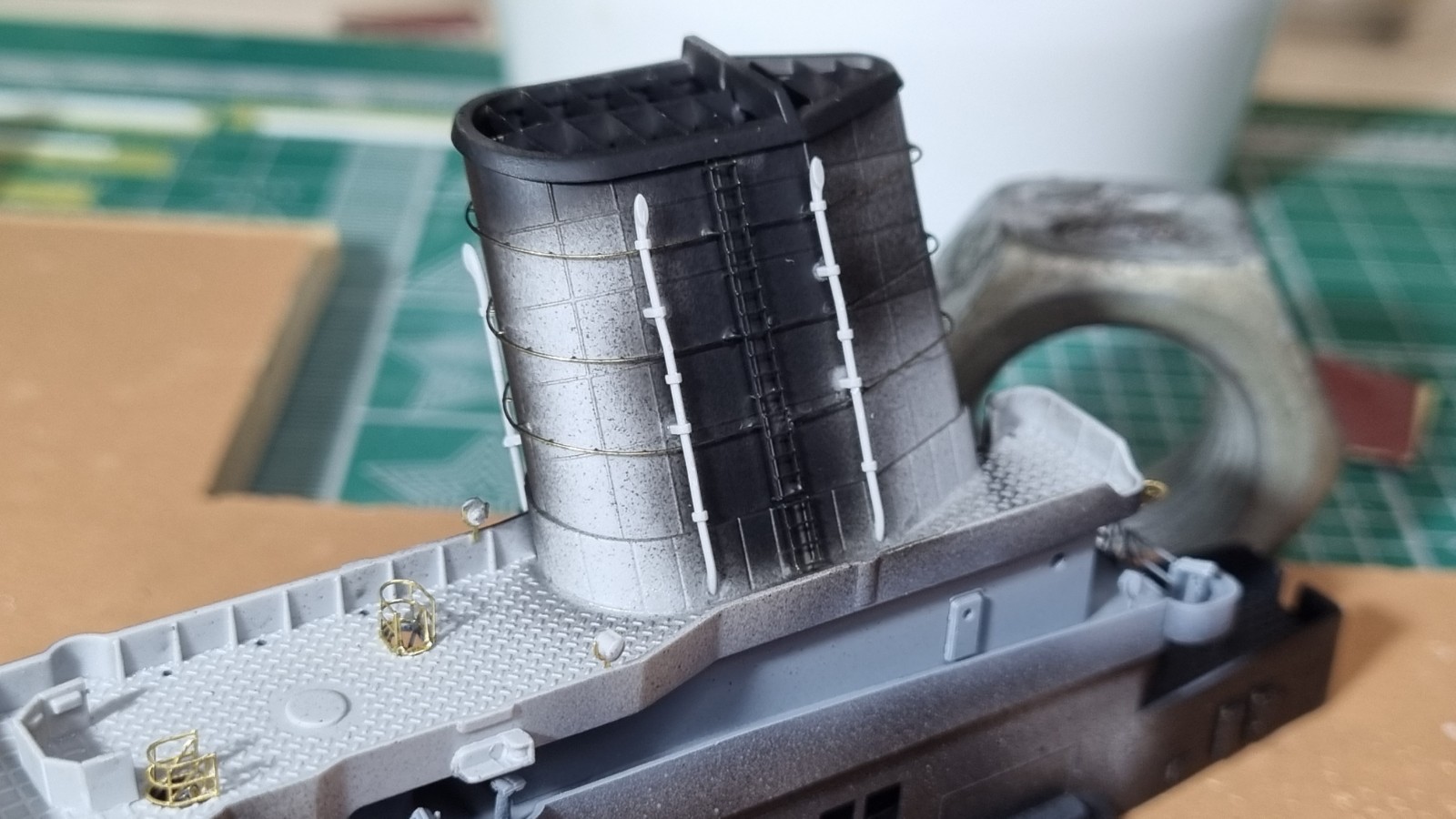 Начал работу с верхней палубой острова. Не заснял сборку рассекателя, но думаю все представляют как набираются эти рёбра))