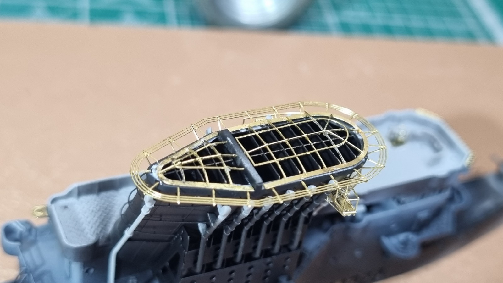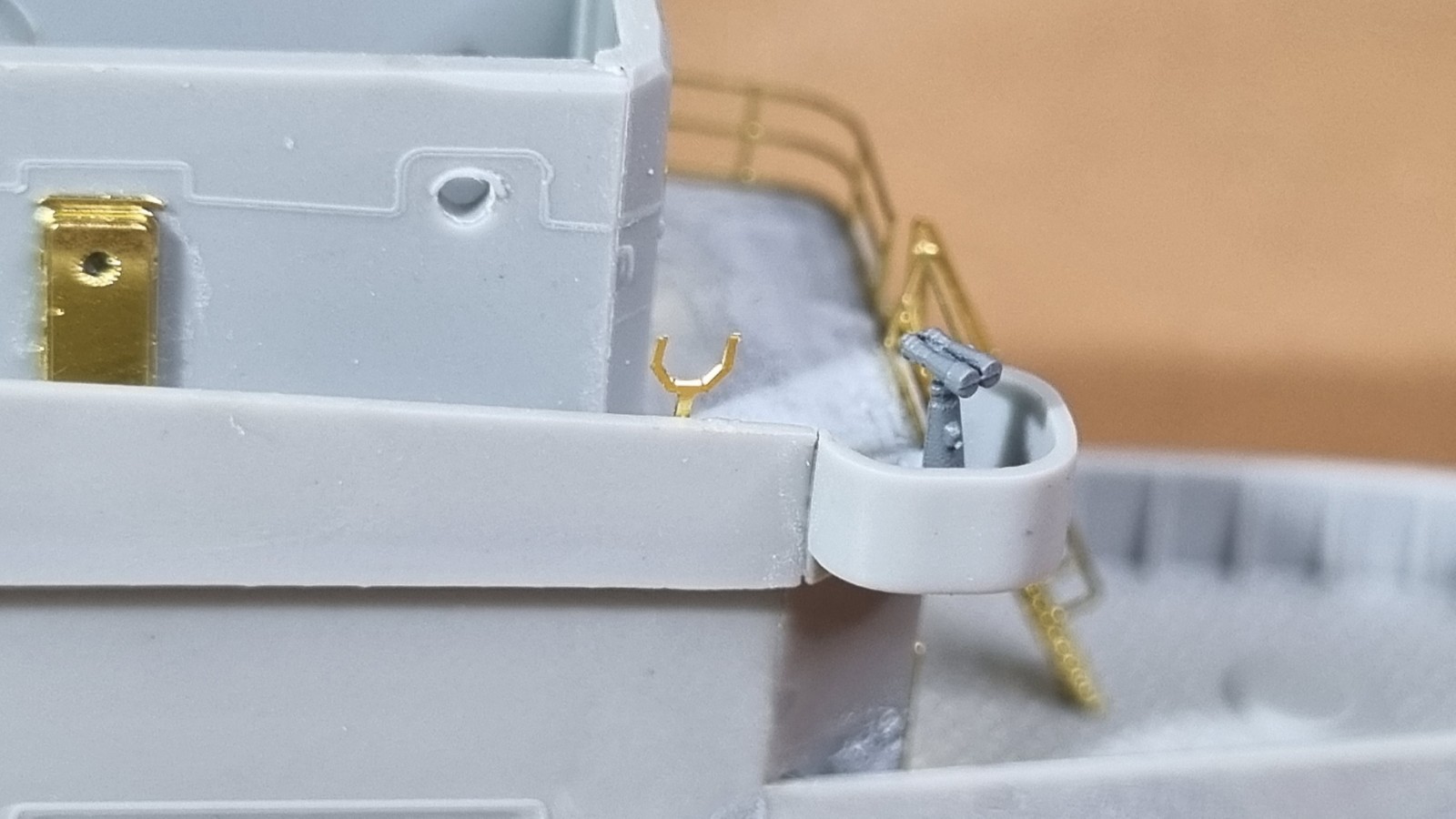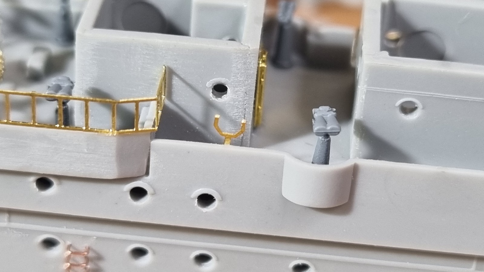 Начал работу с верхней палубой острова. Не заснял сборку рассекателя, но думаю все представляют как набираются эти рёбра))