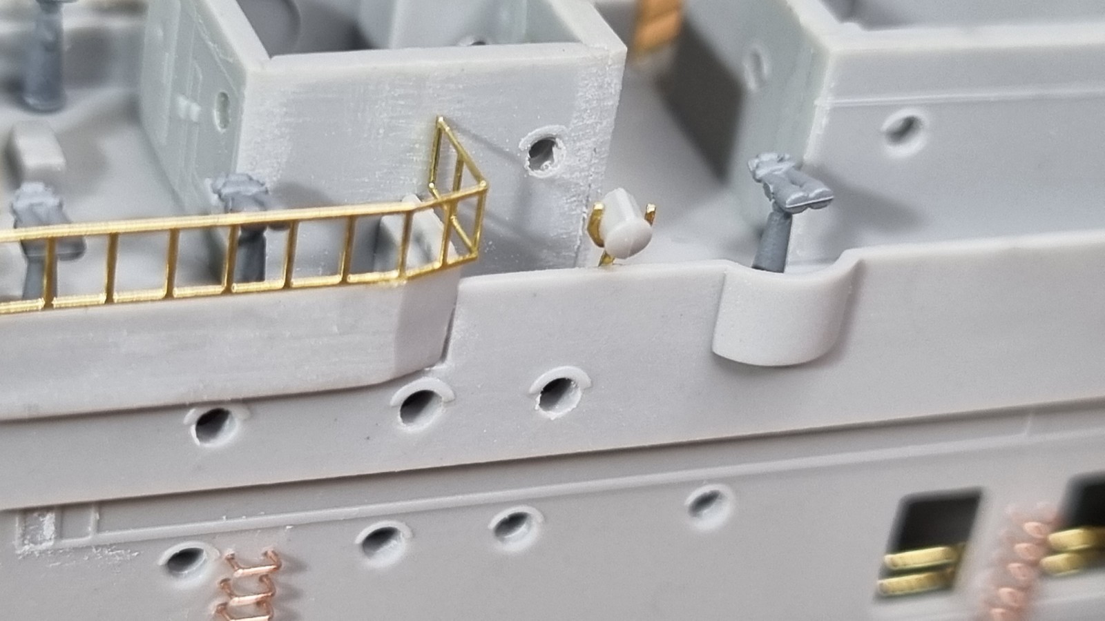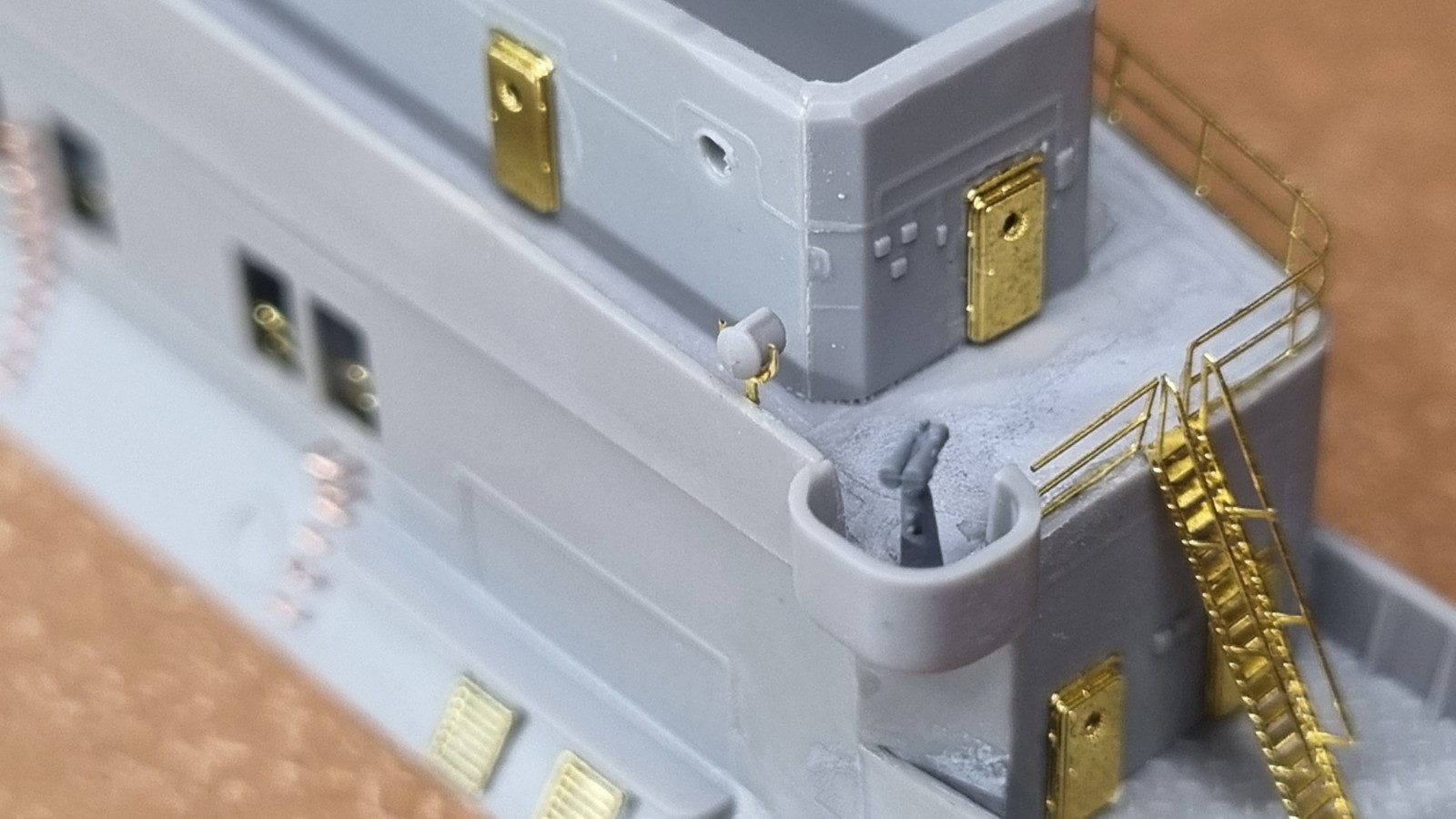 Ну вот я много раз взяв руками облепил нижнюю часть острова травлением и мелочью. Надо ещё доставить биноклей и посмотреть что там с прожекторами. Скорее всего их надо делать отдельно и ставить тоже отдельно.