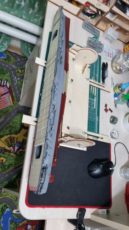 Времени пока нет допиливать трубу, но есть что показать. Как то Олег Черкасов продемонстрировал нам стапель пластиковый (3D) печать с алишки. Меня он заинтересовал. Правда он был для 1/700 и по моим расчётам максимум для него, это крейсер 1/350. Мне хотелось что то посерьёзнее. Короче! Нашёл на озоне стапель для парусников. Собрал его с тем расчётом, что бы зажимными планками можно было зажимать шпильки (а не киль), вкученные в отверстия для стоек. Ну, я думаю по фото всё поймёте. Теперь удобно с бортами работать и наклонять как удобно. Может быть немного громоздко, но всё таки удобно если дело касается вертикальных поверхностей. К фанере конечно надо приложить напильник и болтов добрать. Почему то не хватает 4 шт. Хотя положили всё правильно. Просто в комплект не входит. Россия... Я ещё переживал что не влезит в место хранения (ящик комода), но нет! В наклоненном состоянии уместился в домик. Чему я был несказанно рад)))