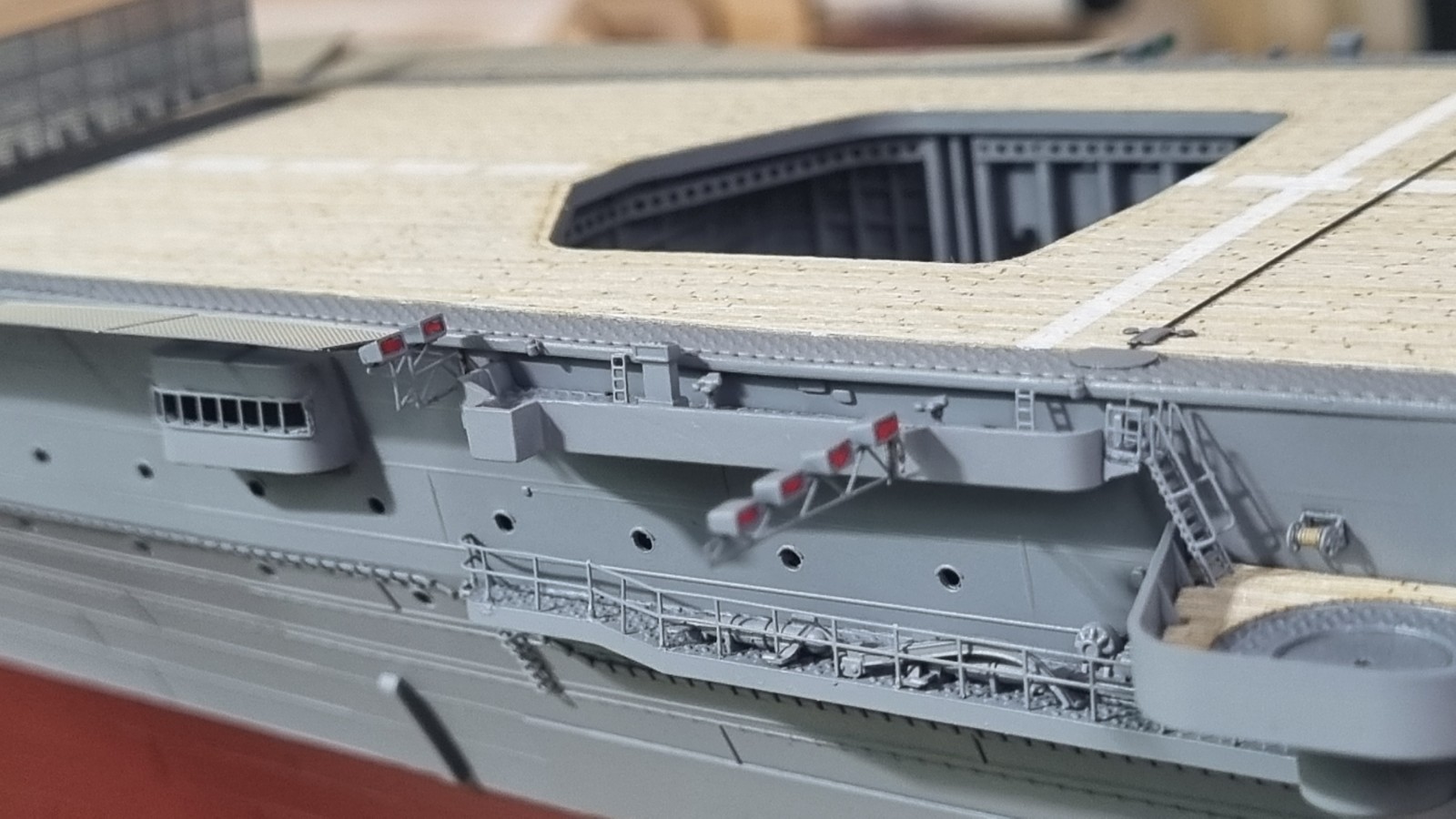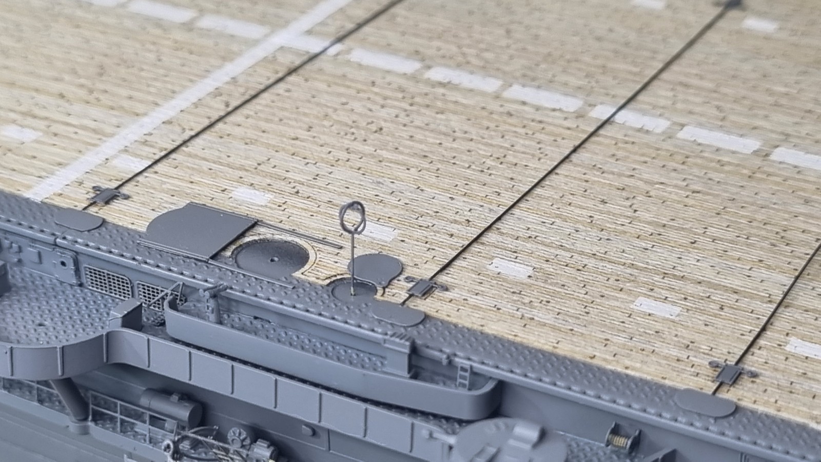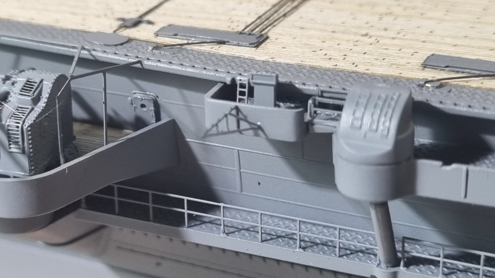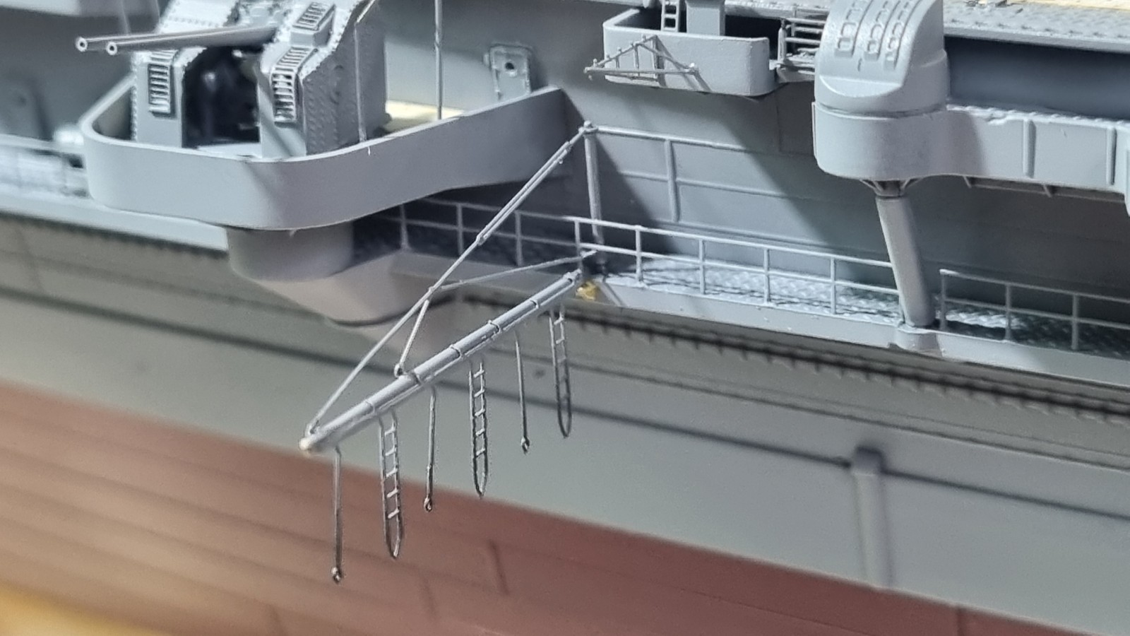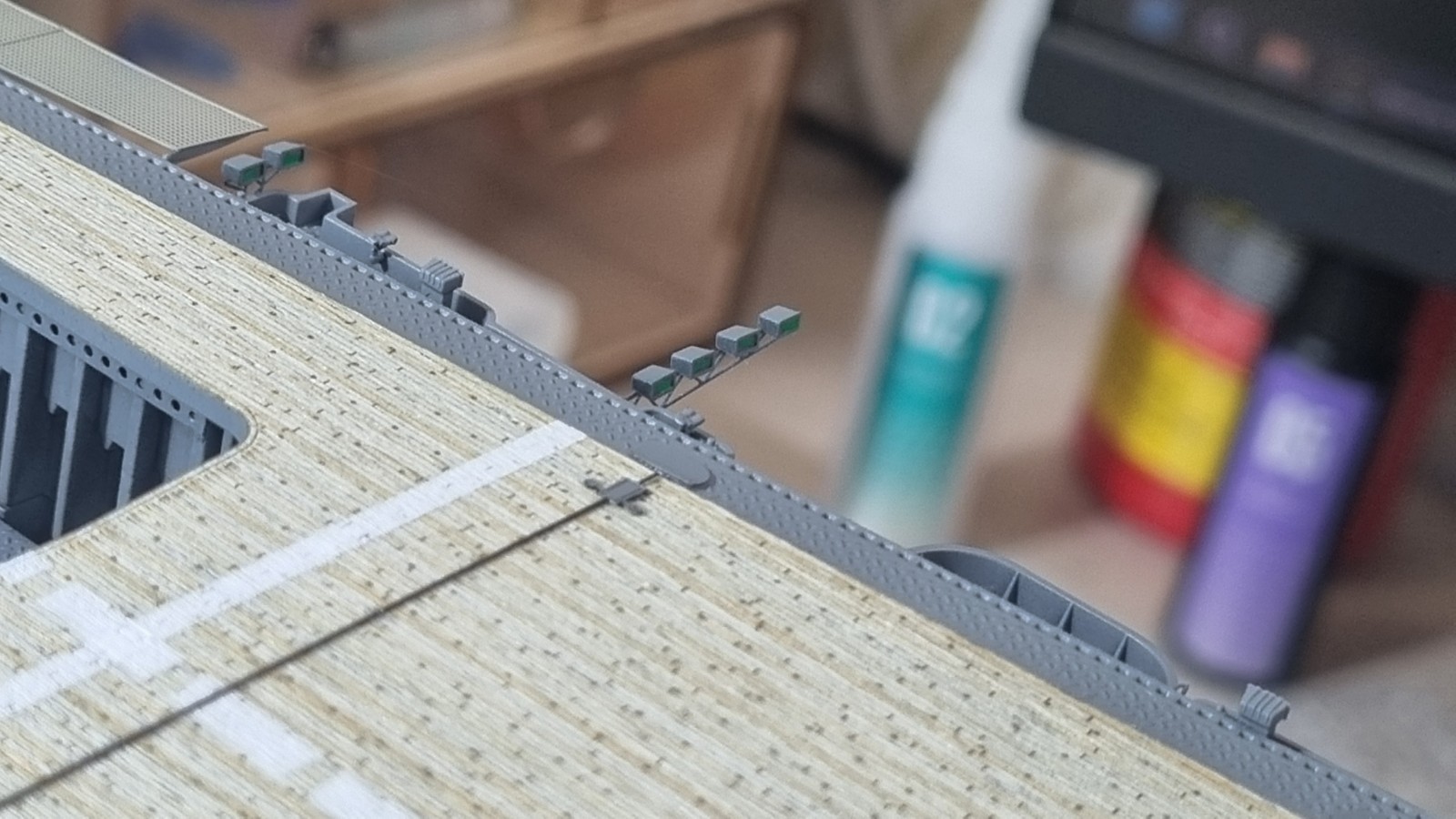 И так... закончил с сетями, дабы команда не падала за борт, поставил пару антенн и развернул носовые посадочные огни, и сразу их покрасил. Кормовые буду красить по месту. Они как то хорошо прилипли и конструкция там ажурные немного.