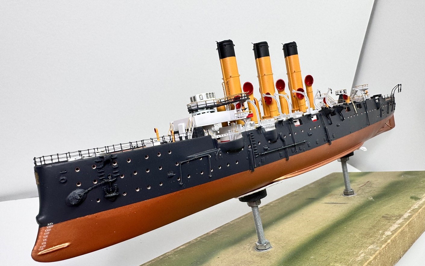 Всем доброго времени суток! Итак, стройка продолжается. Как писал выше, работа была посвящена оборудованию "малого флота", Были сделаны шлюп-балки, родстеры и немного дооснащение бортов. По бортам, сделаны шесты ограничения винтов, сделаны крышки клюзов, установлены якоря. Крышки клюзов на "Диане" решил сделать закрытыми. На систершипах делал их открытыми. Шесты винтов на "Диане", в отличии от "Авроры" и "Паллады" были сдвинуты ближе к кормовым бортовым казематам 75мм орудий. Я так и сделал. Так же различия были и в шлюп-балках яликов. Они располагались чуть шире, чем на остальных кораблях этой серии. Далее установил вьюшки. Подкрасил перила мостиков и трапов под светлое дерево. Сделал леера из леерных стоек и проволочки. Делал первый раз, поэтому сильно не "пинайте". Больно ведь