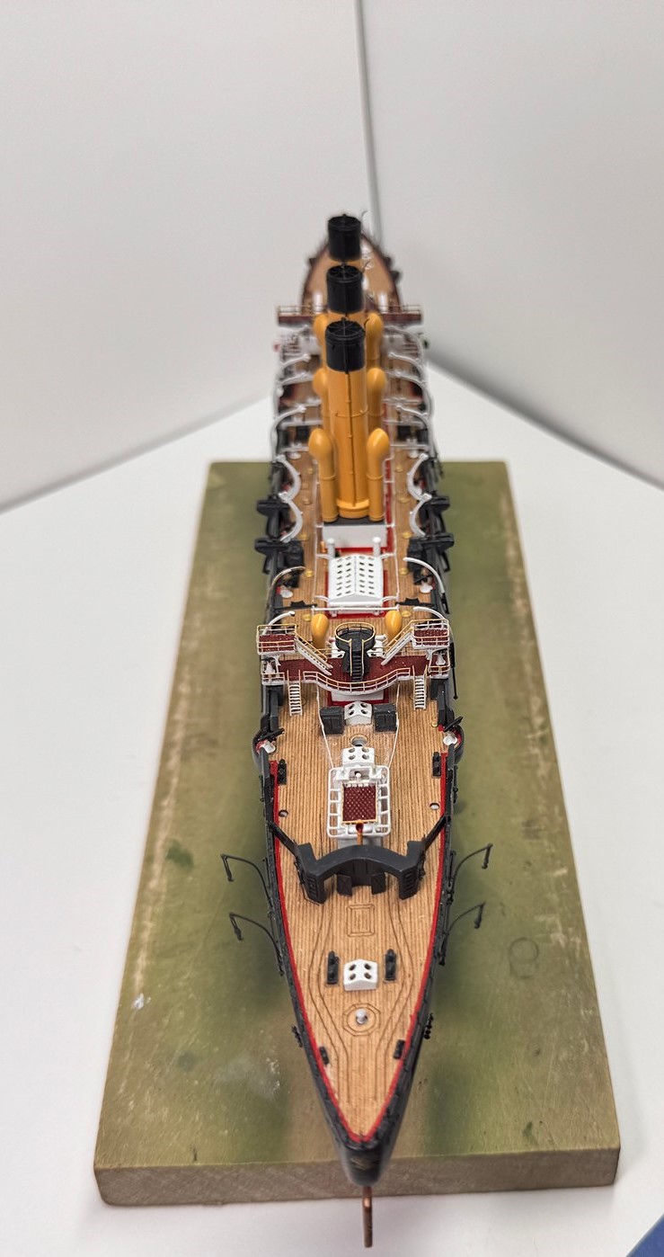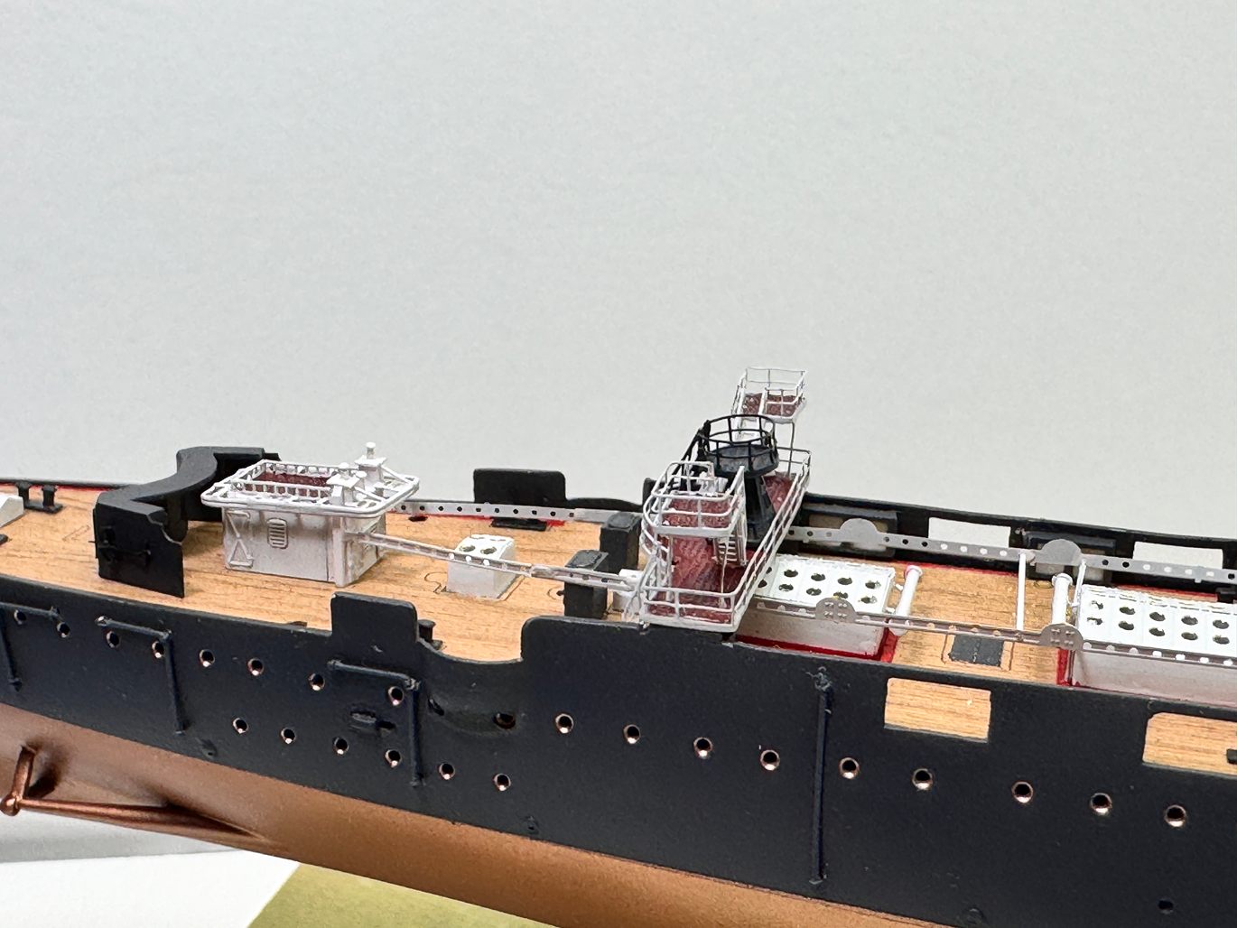 Хорошо получается, видно что набил руку на предыдущих моделях этой серии. Единственное что смущает это черные леера на носовом мостике. На фото они белые и по верху деревянный поручень.