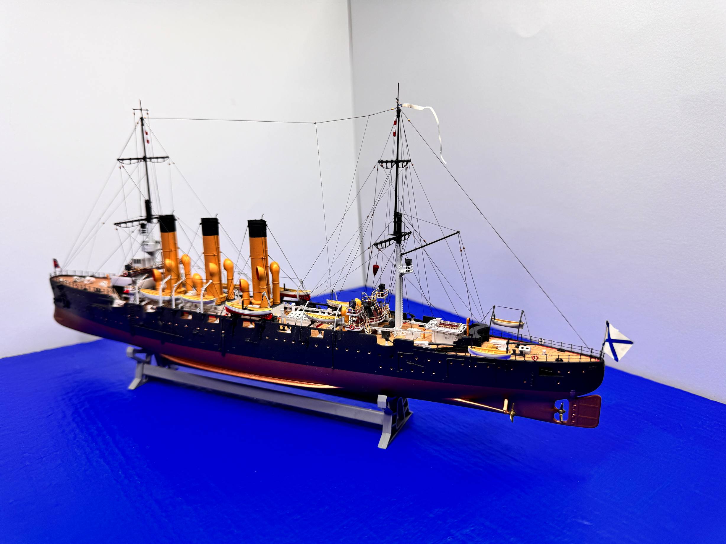 Начну с того, что на "Палладе" было 7 угольных портов, на других крейсерах 8. Шесты сетевого ограждения на всех кораблях располагались по разному. На "Диане" и "Авроре" их различие в расположении было только в носовой части. "Аврора" отличалась от двух других не только якорями системы Холла, вместо Мартина но и якорными подушками, скоб-трапами и расположением иллюминаторов в районе крепления якорей. Аврора имела незначительные изменения крамболов. Кронштейны пиллерсов под крыльями ходового мостика у всех были разные по форме. На Палладе, на скошенных стенках ходовой рубки было по два окна , на Авроре и Диане по одному. Двери в боковых стенках ходовой рубки по проекту располагались не симметрично. С правого борта - позади двух окон, с левого между окнами, посередине. В реальности так было только на Палладе. На Авроре двери передвинули к корме и они на ходовой рубке были симметричны. На Диане двери размещались за ходовой рубкой в пристроенном тамбуре. На Авроре паровой катер со шлюпбалками размещался ниже , на уровне фальшборта. Выстрел на Авроре также размещался ниже. Кормовые шлюпбалки 6-вёсельного яла только на Палладе соответствовали чертежам. На двух других крейсерах стояли более широко. На Палладе не было одного кормового шпигата, шест ограждения винтов был сдвинут в нос, по сравнению с двумя другими крейсерами. На Авроре его также передвинули во время ремонта 1906 году. Крышки портов 75мм орудий на верхней палубе на Палладе и Диане были сняты после вступления кораблей в строй. На Авроре их не было изначально. Брам-реи на мачтах были только на Диане, их сняли перед уходом на ДВ. На остальных кораблях было изначально два яруса реев. Только на Авроре были смонтированы две грузовые стрелы на грот-мачте, заменены одной входе ремонта 1916-1917 гг. На других кораблях грузовых стрел не было вообще. На бортах крейсеров были небольшие отверстия, вероятно шпигаты для мусора, в районе батарейной палубы, на Авроре по два, на Палладе и Диане по три с каждого борта . Боевой марс не был круглым. В его кормовой части не было одного сектора и он упирался на семь кронштейнов. Вот некоторая часть перечисленных отличий на момент вступления кораблей встрой. Не буду перечислять все изменения которые претерпели Аврора и Диана в ходе последующих ремонтов. Их было множество. Взять хотя бы перевооружение основного калибра, установку щитов и т.д. Не говорю про полную переделку Авроры под музей.