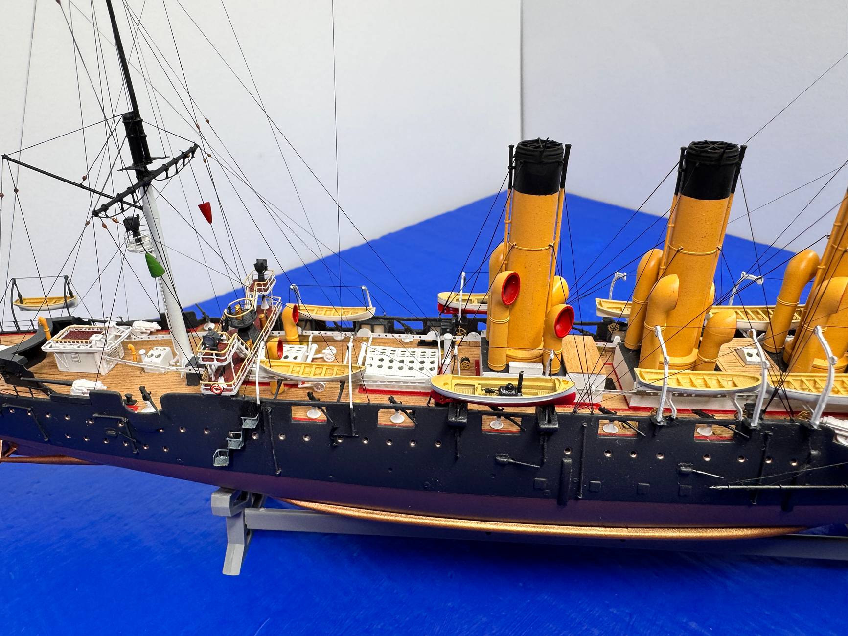 Но наверное не сдержу своего обещания перекрасить лафеты. Они на корабле приклеены, и снять их для покраски не получиться. Сделаны из смолы, очень нежные. Без повреждений не получиться демонтировать. Поэтому оставлю белыми. На будущее учту.