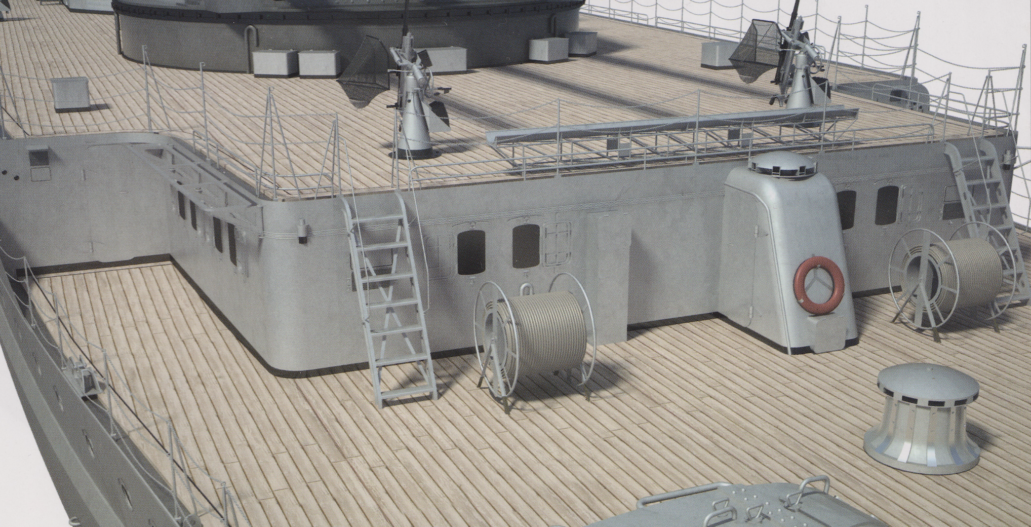 ну смотрите.1) крыша рубки была темной и с рифленкой2) крыша кдп с дальномером тоже была темной. 3) люки на крыше кдп были иначе расположены4) никаких приборов управления кораблем или его системами на этой площадке не было (нарисованы на передней стенке). площадка чисто наблюдательная.5) под дальномером видим приборы: передний - это нечто типа директора прожекторов, задний - зенитный директор.по факту на передней позиции как раз должен быть зенитный, а сзади просто колонка с биноклем, т.к. директор туда поставить не успели.6) ну и верхняя часть фальшборта не была как нарисовано монолитной. Это были щитки, которые можно было опускать и поднимать.