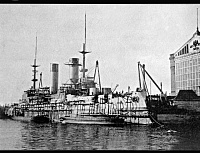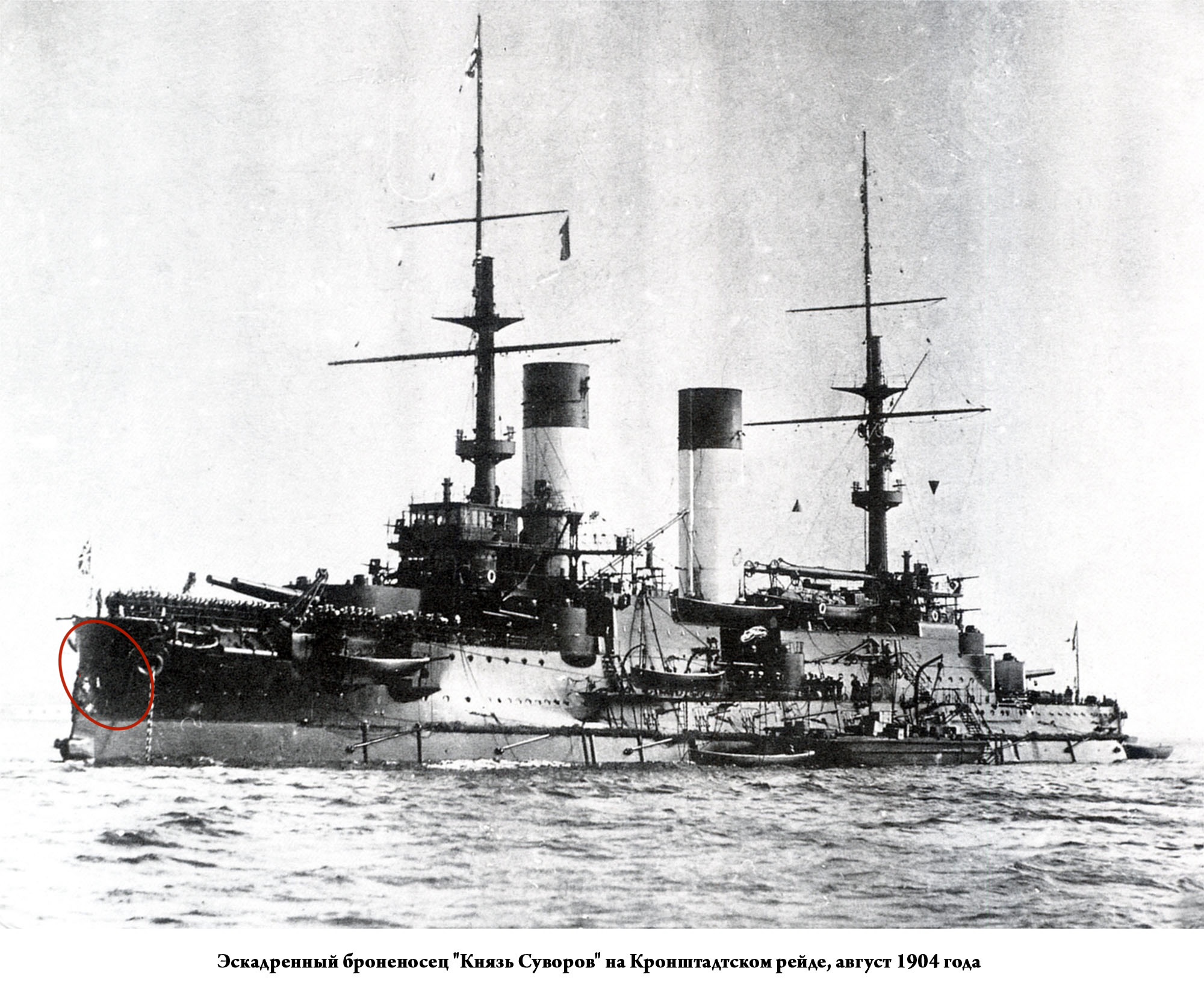 Я не Саныч, но позволю себе ответить- в носу, внутри корпуса, под палубой полубака у этих броненосцев находился выдвижной , на тележке по рельсам прожектор. В обычном положении его порт был закрыт и прожектор не было видно.