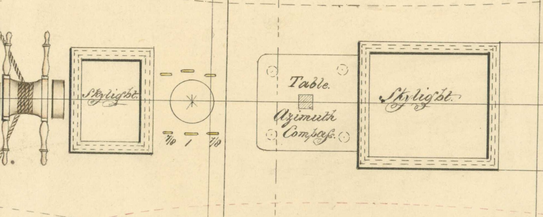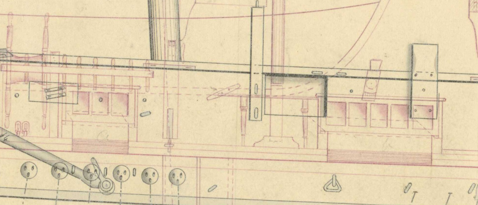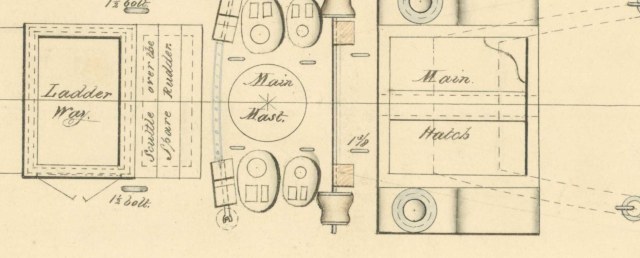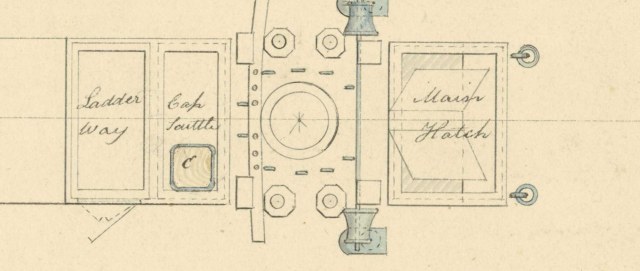 На чертеже 1839 г эти люки имеют комингсы с двойной пунктирной линией и надписью