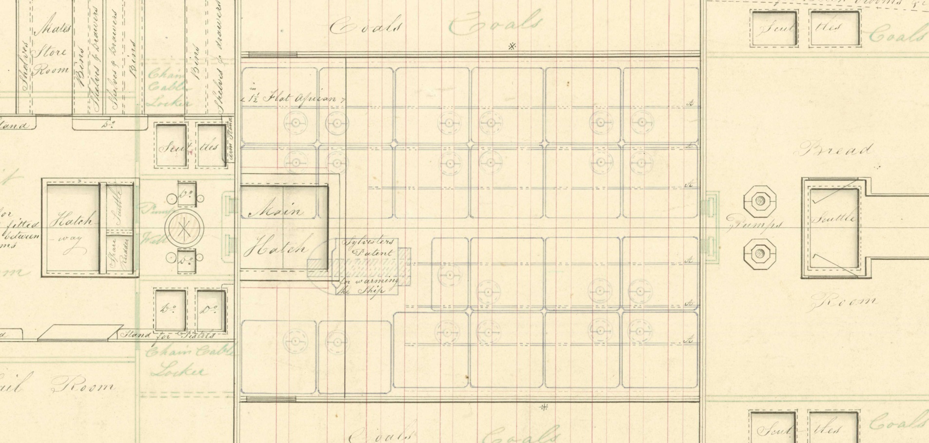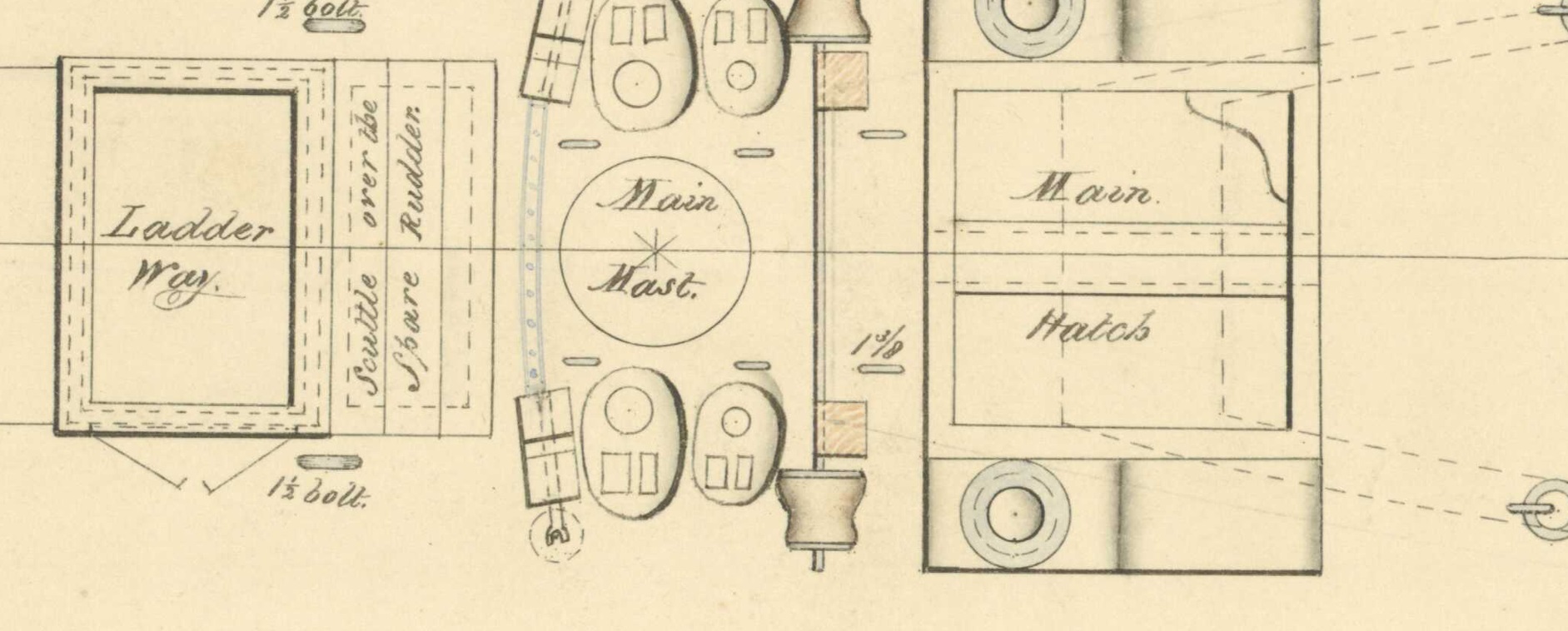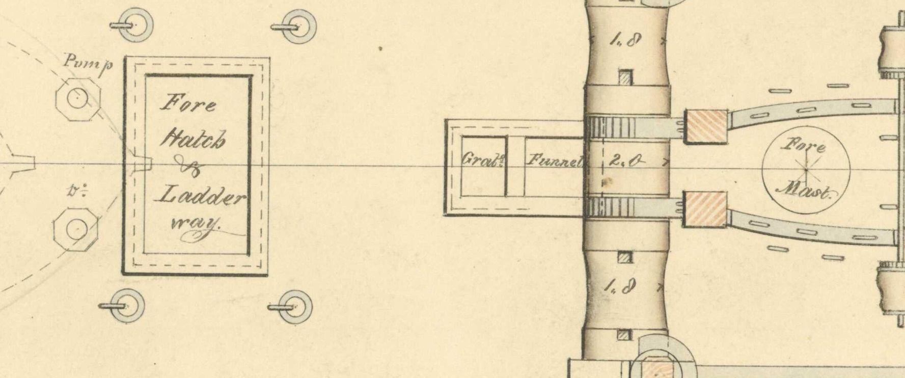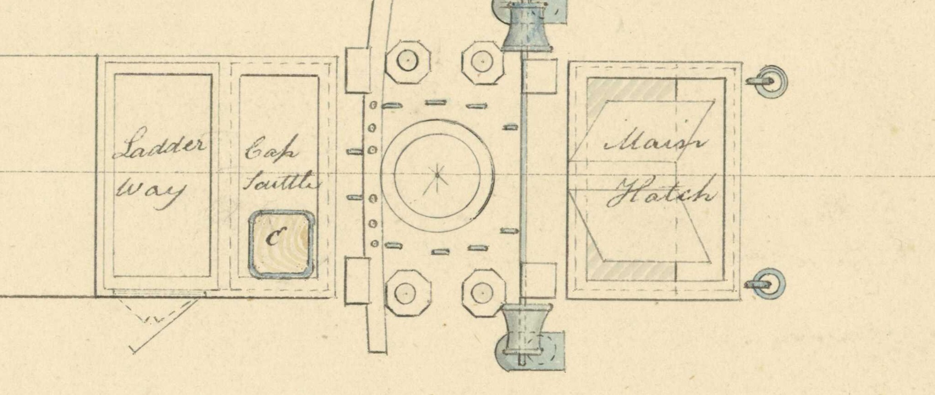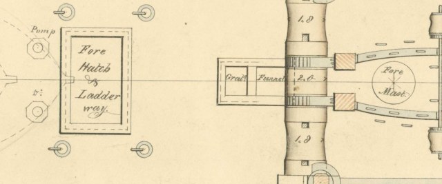 Левее на чертеже появляется  - фор-люк, подписанный "fore hatch & ladder way". Это носовой грузовой люк с трапом,