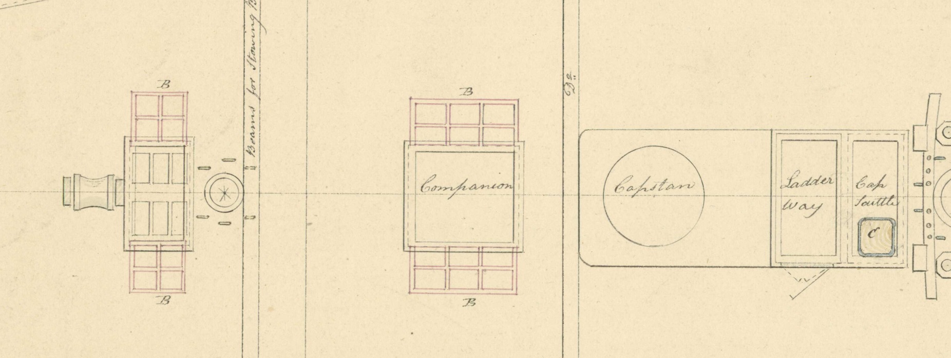 Вот эти "оконные рамы", "разбросанные" по краям комингсов люков, нарисованные красной тушью и подписанные буквой В, это как раз