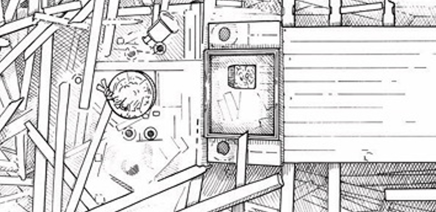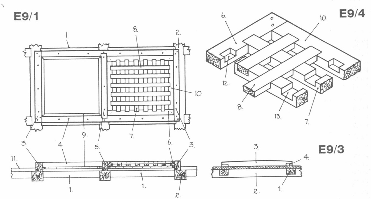 Далее, мы вновь видим центральную балку в проёме люка и две открытые вверх-к-центру сплошные дощатые крышки, показанные
