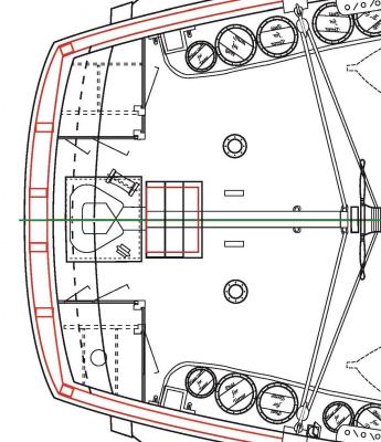 кают-кампании (он прямо перед штурвалом). Черным цветом выделен вариант цельной крышки люка с шестью окошками, а красным цветом -