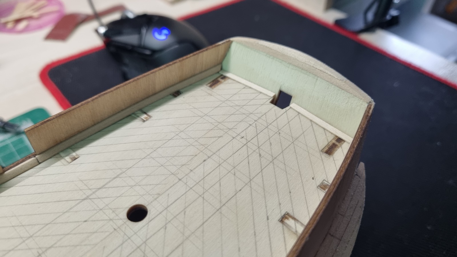 Значит, по аналогии с бимсами, нижние планки ставятся поперек ДП корабля. А верхние планки, они прямые, потому что седловатость не имеет