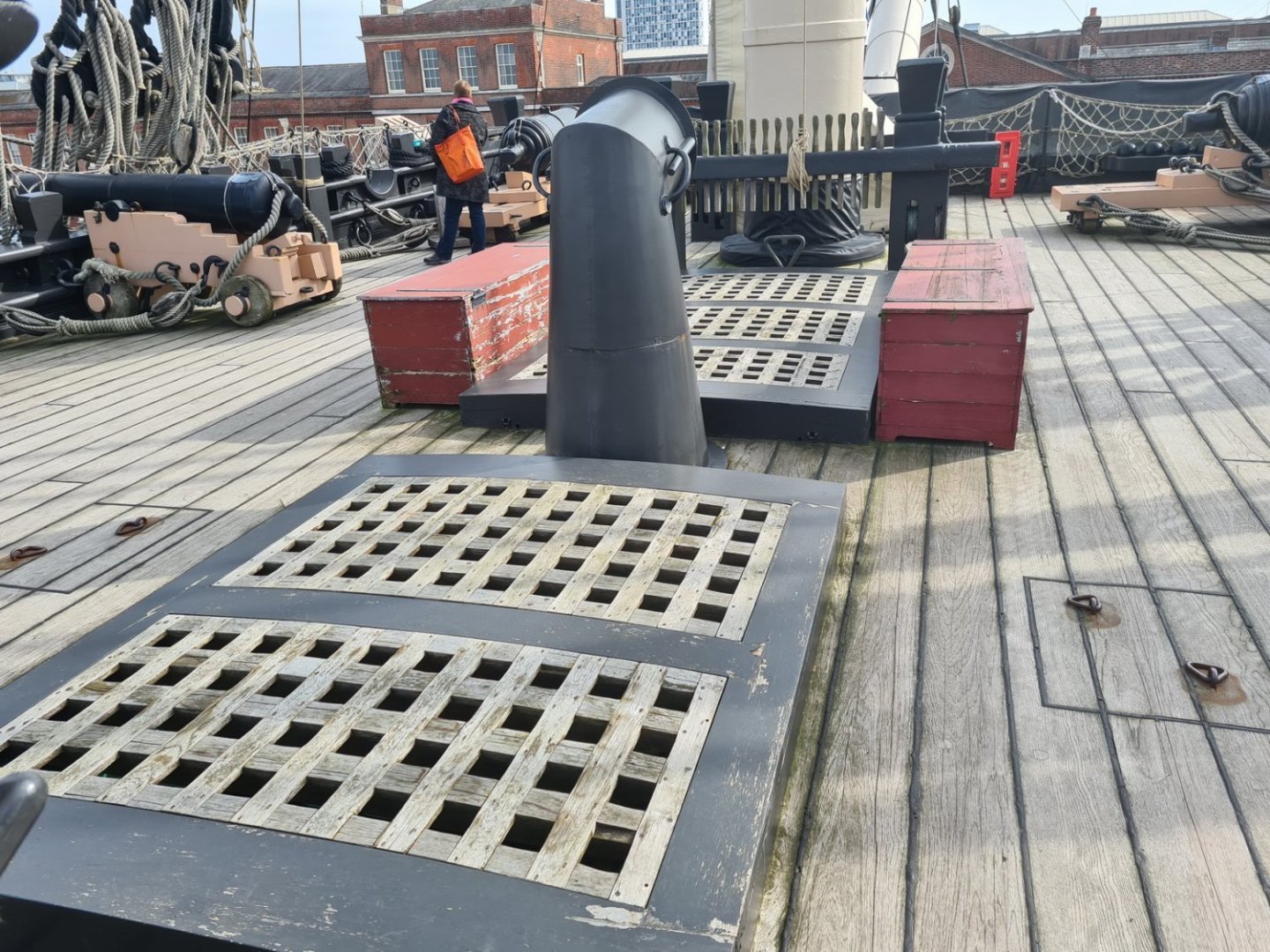 Вот опердек по состоянию на 1839 год. Cлева от грот-мачты - задний грота-люк, в котором одним общим комингсом объединены два люка:
