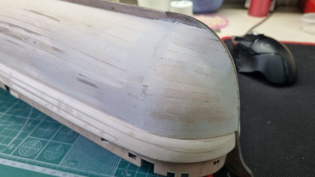 Закончил я с правкой носовой части. По чертежу чуть выше есть выступ усиления над основной обшивкой. Я его решил сделать из дополни ельного слоя чистовых реек.