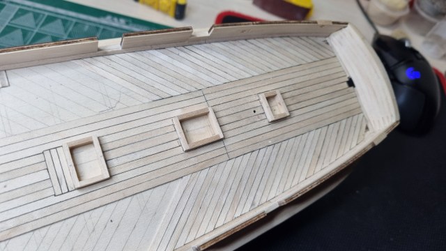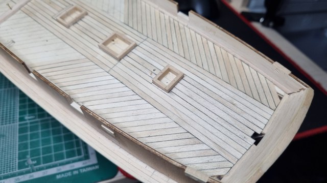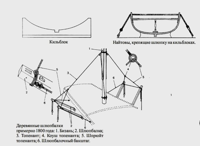 так на плане палубы однозначно (однозначно, потому что подписаны текстом) показаны кильблоки для установки шлюпки. Это такие массивные балки с фасонным вырезом сверху и мягкими накладками на лапках. По обоим краям кильблока прибивались рым-болты для фиксации шлюпки найтовами.Дмитрий Ревякин написал(а):Но как то же это стояло..? С другой стороны другого места для него всё равно нет.