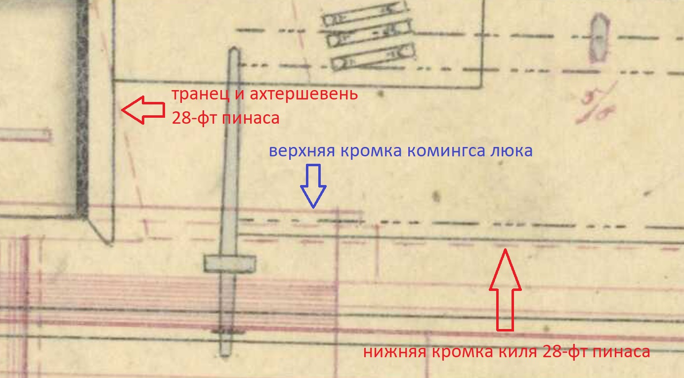 К сожалению, Дима, я здесь вновь должен признать, что чертеж "борт, 1839", - это больше про схему размещения, чем про размеры. Дело в том, что двадцати восьми футовый пинас (согласно спецификации, это он) не только частично закрывает собой люк, что терпимо, когда учитываем обводы корпуса пинаса, но ещё он, согласно чертежу, в принципе не может так стоять, потому что его киль полностью утонул в комингсах грота-люка! На чертеже нарисована нереальная ситуация, такого быть не может.Дмитрий Ревякин написал(а):Во вторых проблемы ... шлюпок ... никуда не делись.