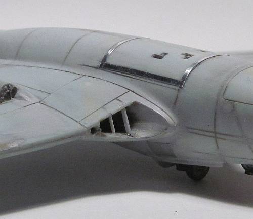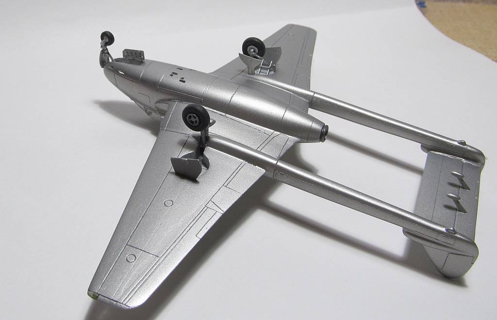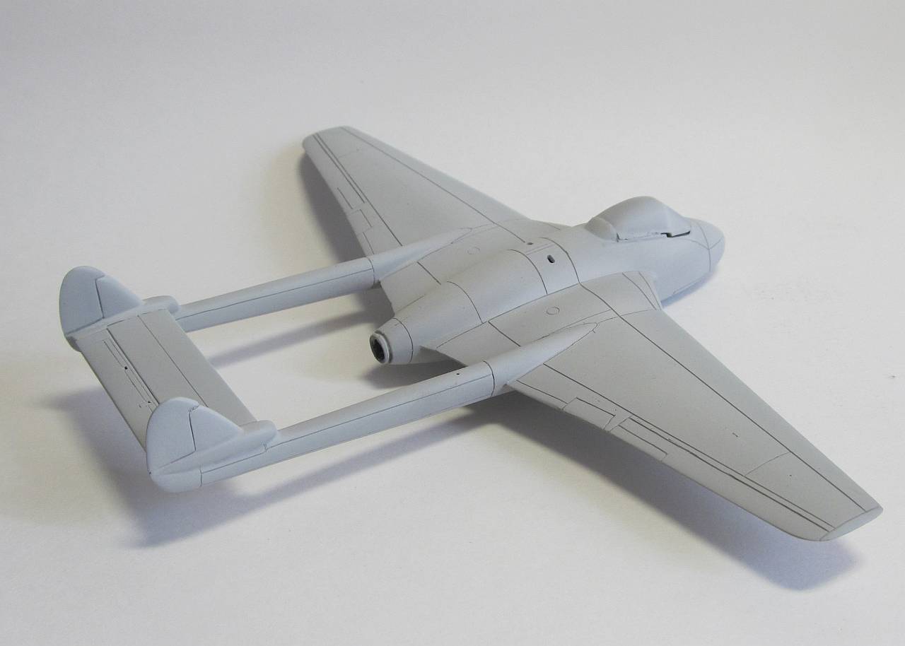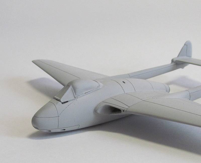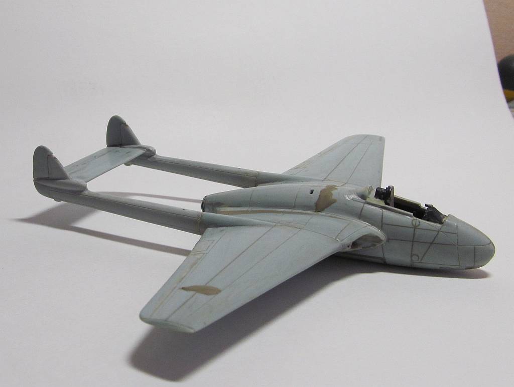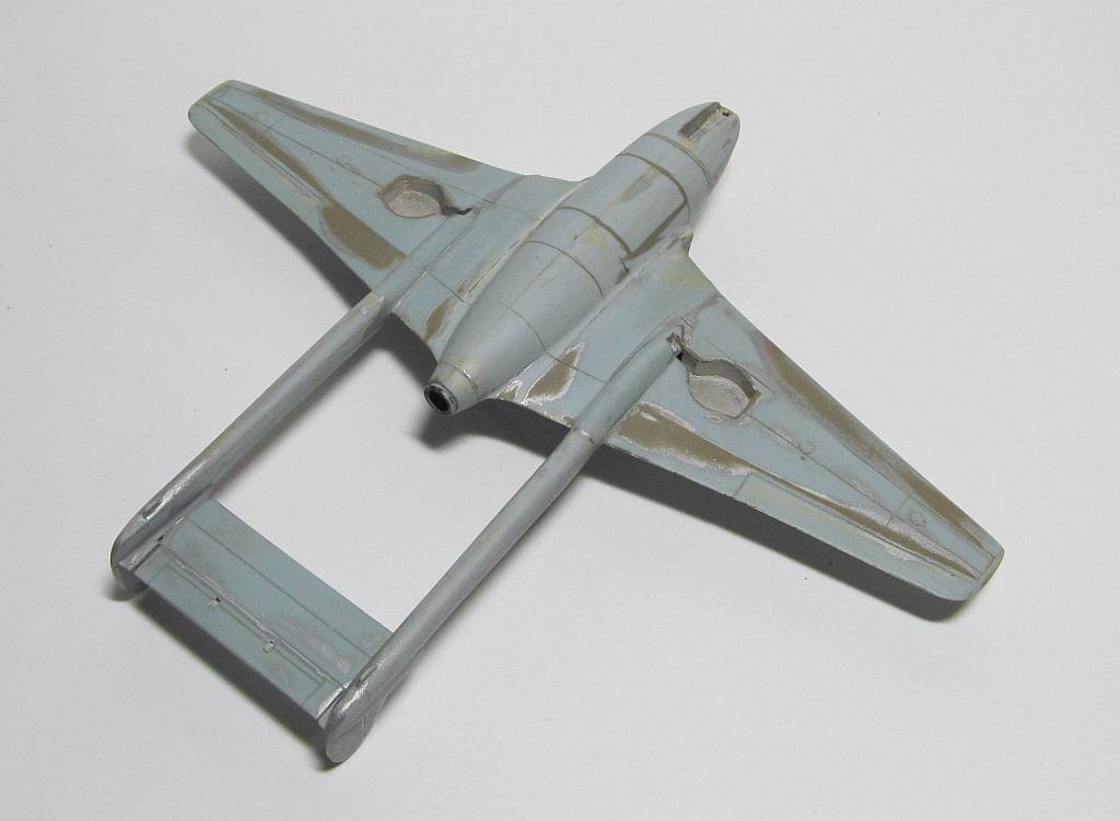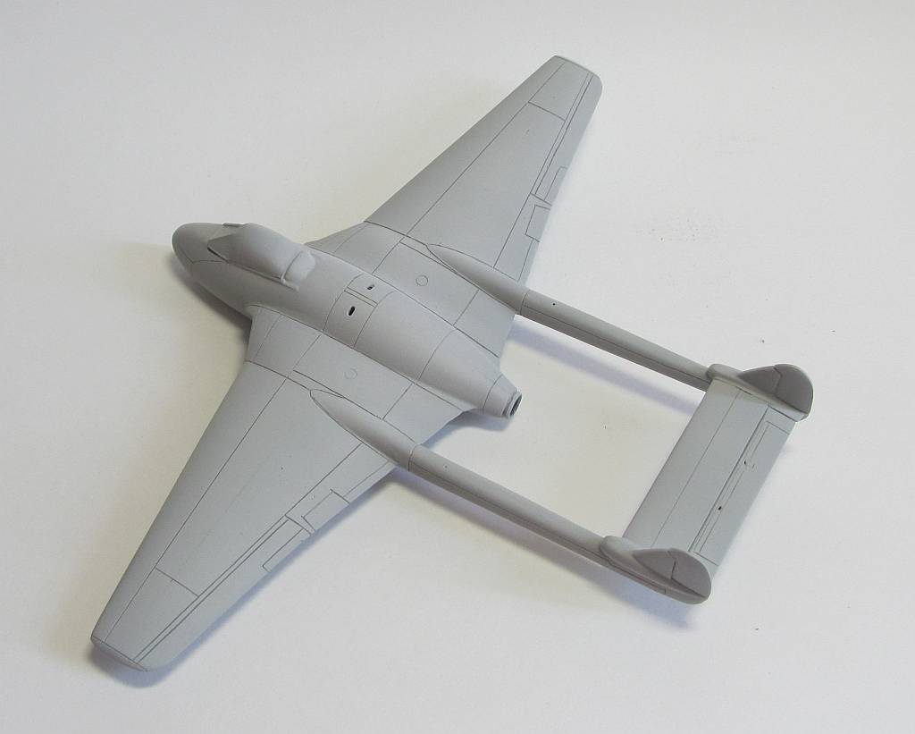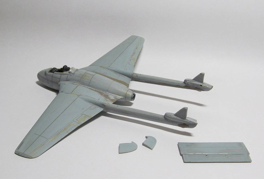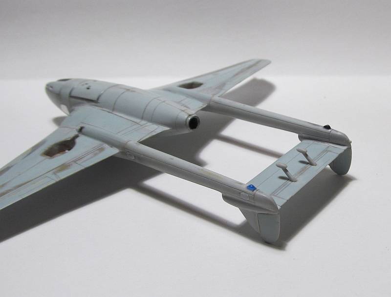 Случаются у меня, к сожалению, такие неприятные моменты, когда я застреваю на какой-то мелочи, не зная как её лучше изготовить, и тогда модель подвисает, иногда надолго. В данном случае камнем преткновения стали, смешно сказать, перегородки в воздухозаборниках: очень уж хотелось сделать их как положено, с дугой по внешней кромке, но не получилось с наскока... А тут ещё с первого июля график на работе изменился... В общем, вроде и мелочи это всё, но из колеи они меня совместными "усилиями" выбили. Вот только в отпуске удалось наконец собраться с мыслями и, после небольшой разминки на другом, ещё более старом долгострое, взяться снова за "Вампира". Злополучные перегородки, со психу, сделал как проще, из прямых полосок дошипласта. Ещё по паре таких полосок вклеил в ниши шасси, чтобы не выглядели совсем уж пусто. Фольгой-самоклейкой изобразил лючки по бортам и крышку пушечного отсека на брюшке фюзеляжа. Осталось изобразить овальные лючки(?) на хвостовых балках, ещё не определился как это сделать, тоже фольгой, или с расшивкой помучиться?