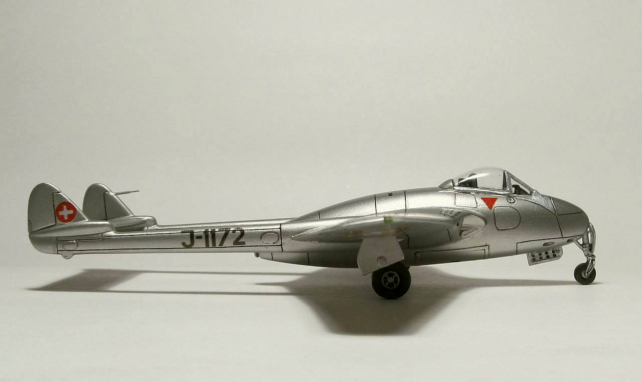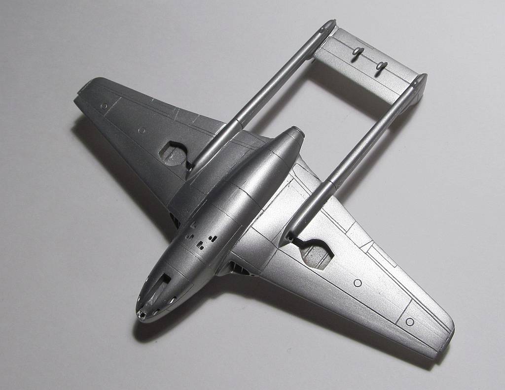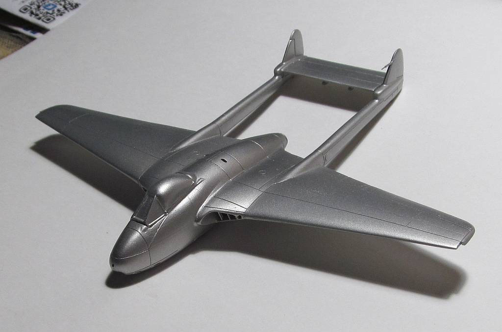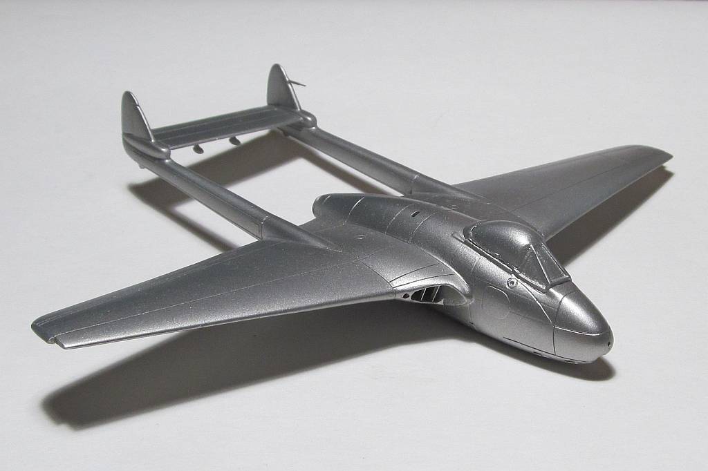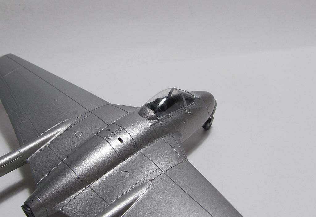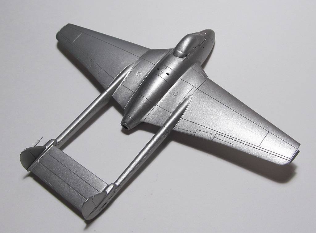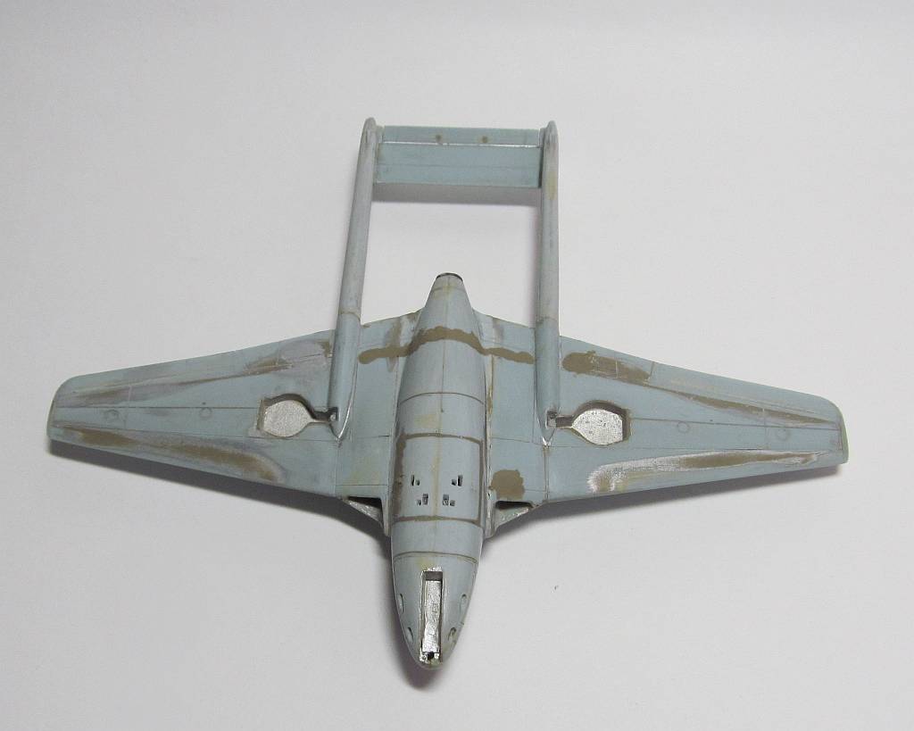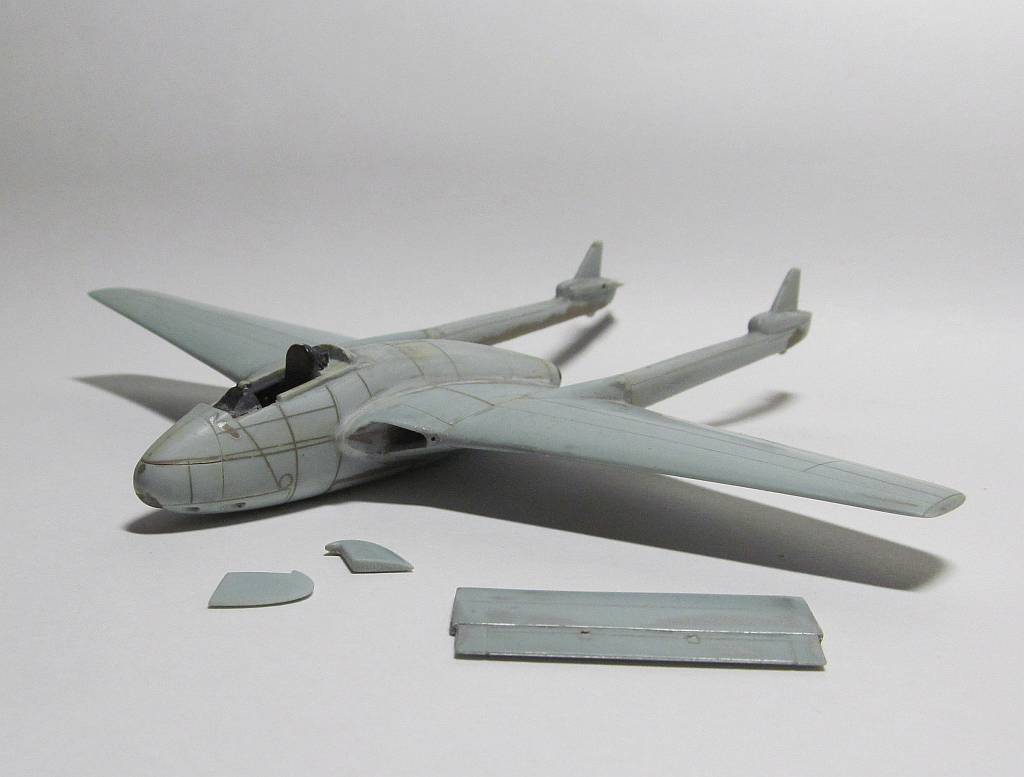 Случаются у меня, к сожалению, такие неприятные моменты, когда я застреваю на какой-то мелочи, не зная как её лучше изготовить, и тогда модель подвисает, иногда надолго. В данном случае камнем преткновения стали, смешно сказать, перегородки в воздухозаборниках: очень уж хотелось сделать их как положено, с дугой по внешней кромке, но не получилось с наскока... А тут ещё с первого июля график на работе изменился... В общем, вроде и мелочи это всё, но из колеи они меня совместными "усилиями" выбили. Вот только в отпуске удалось наконец собраться с мыслями и, после небольшой разминки на другом, ещё более старом долгострое, взяться снова за "Вампира". Злополучные перегородки, со психу, сделал как проще, из прямых полосок дошипласта. Ещё по паре таких полосок вклеил в ниши шасси, чтобы не выглядели совсем уж пусто. Фольгой-самоклейкой изобразил лючки по бортам и крышку пушечного отсека на брюшке фюзеляжа. Осталось изобразить овальные лючки(?) на хвостовых балках, ещё не определился как это сделать, тоже фольгой, или с расшивкой помучиться?