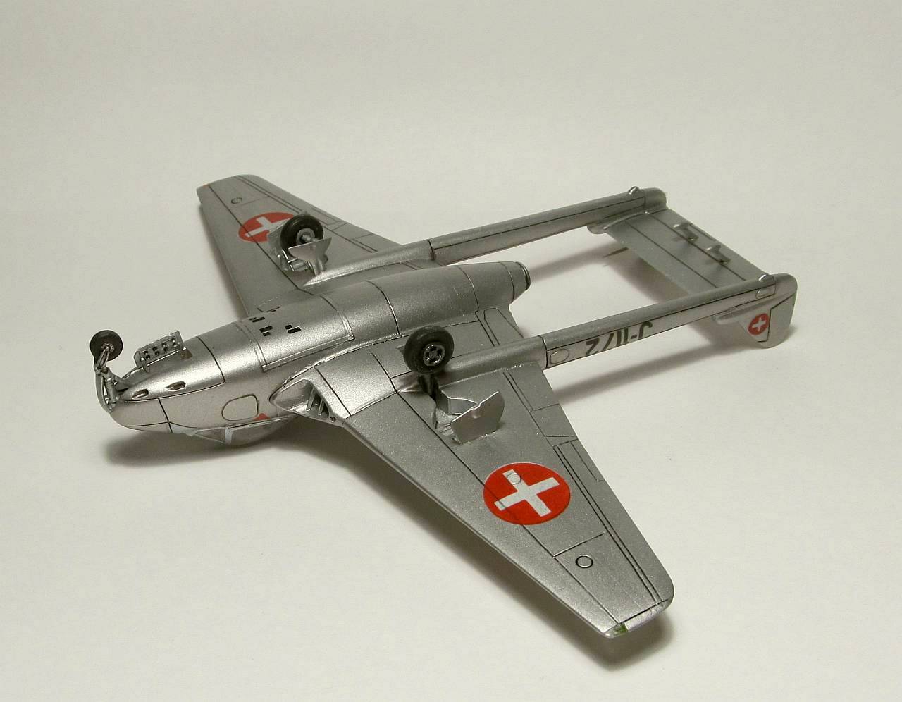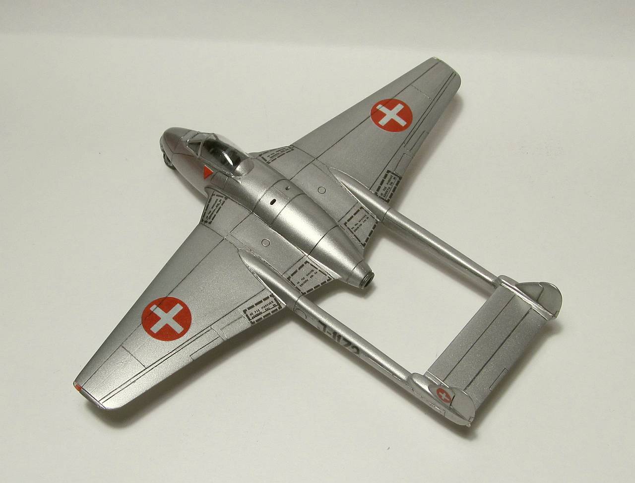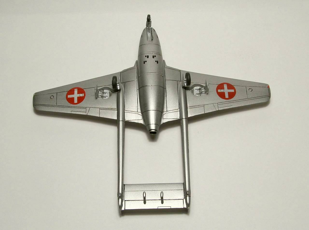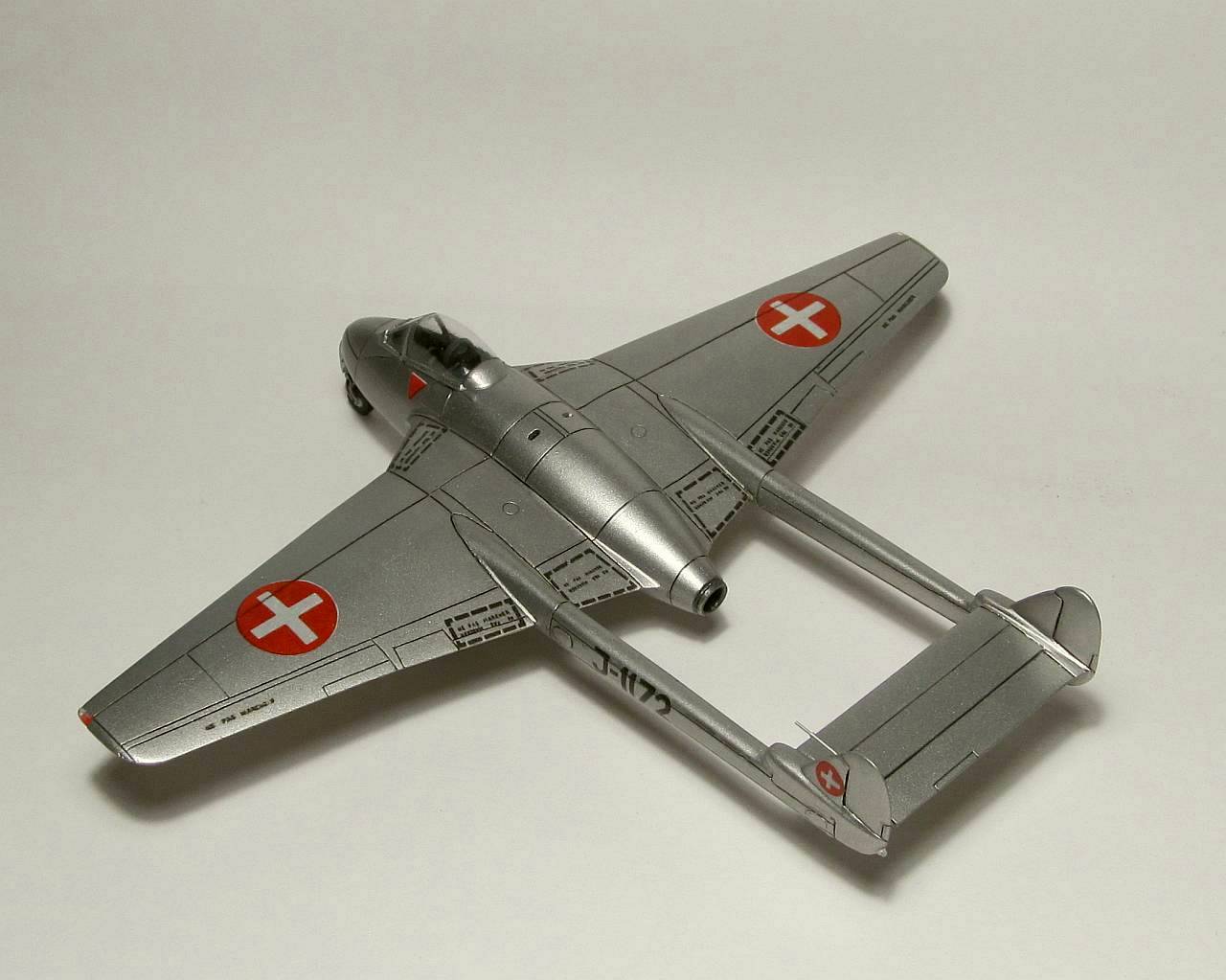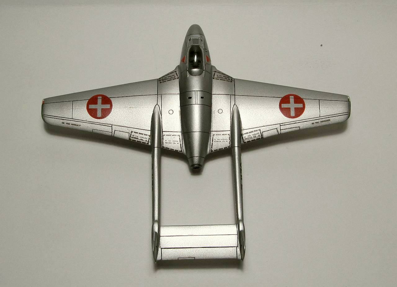 Случаются у меня, к сожалению, такие неприятные моменты, когда я застреваю на какой-то мелочи, не зная как её лучше изготовить, и тогда модель подвисает, иногда надолго. В данном случае камнем преткновения стали, смешно сказать, перегородки в воздухозаборниках: очень уж хотелось сделать их как положено, с дугой по внешней кромке, но не получилось с наскока... А тут ещё с первого июля график на работе изменился... В общем, вроде и мелочи это всё, но из колеи они меня совместными "усилиями" выбили. Вот только в отпуске удалось наконец собраться с мыслями и, после небольшой разминки на другом, ещё более старом долгострое, взяться снова за "Вампира". Злополучные перегородки, со психу, сделал как проще, из прямых полосок дошипласта. Ещё по паре таких полосок вклеил в ниши шасси, чтобы не выглядели совсем уж пусто. Фольгой-самоклейкой изобразил лючки по бортам и крышку пушечного отсека на брюшке фюзеляжа. Осталось изобразить овальные лючки(?) на хвостовых балках, ещё не определился как это сделать, тоже фольгой, или с расшивкой помучиться?