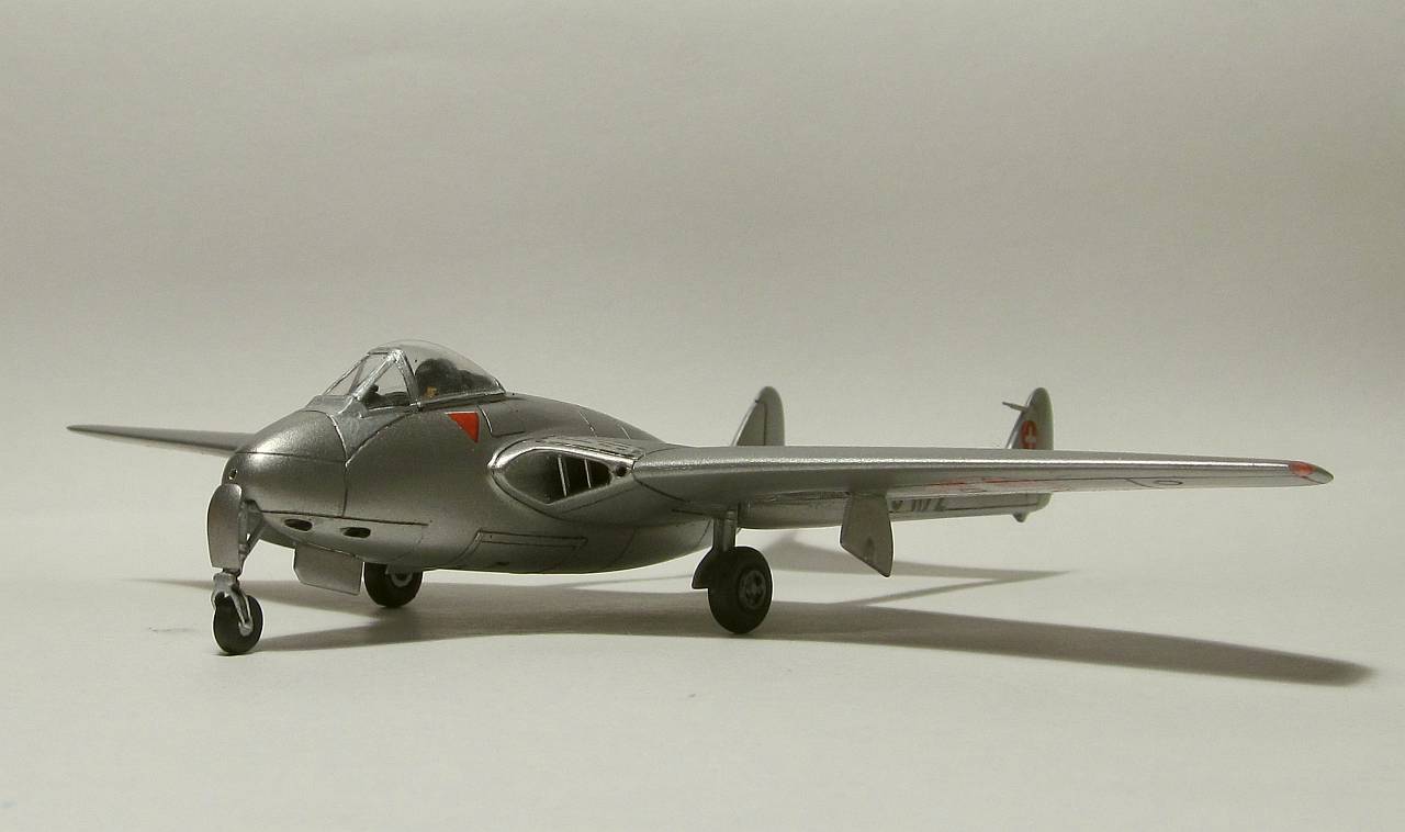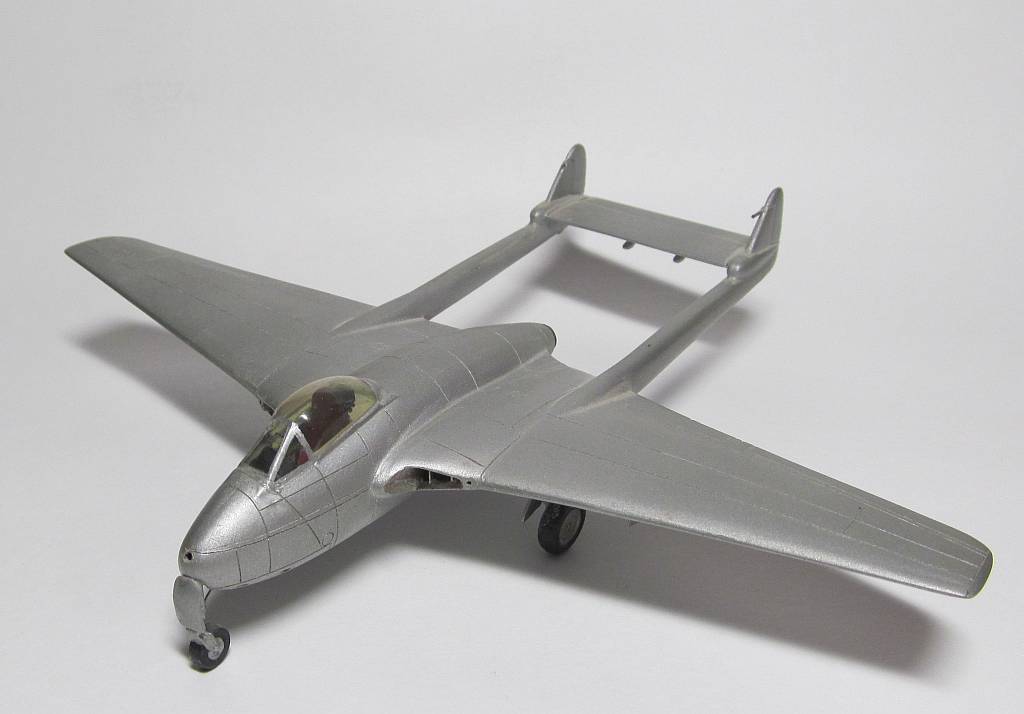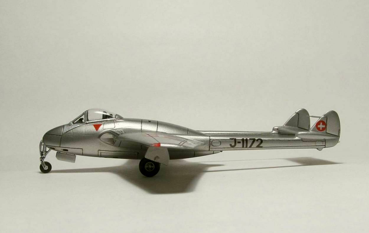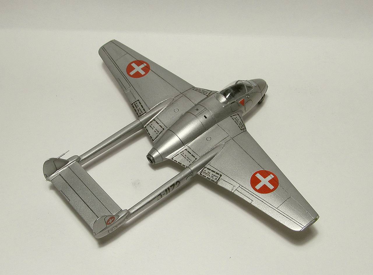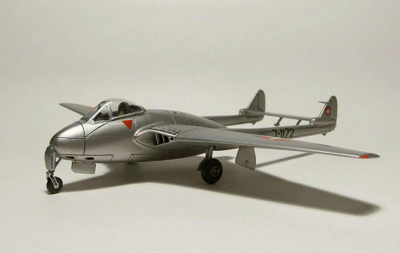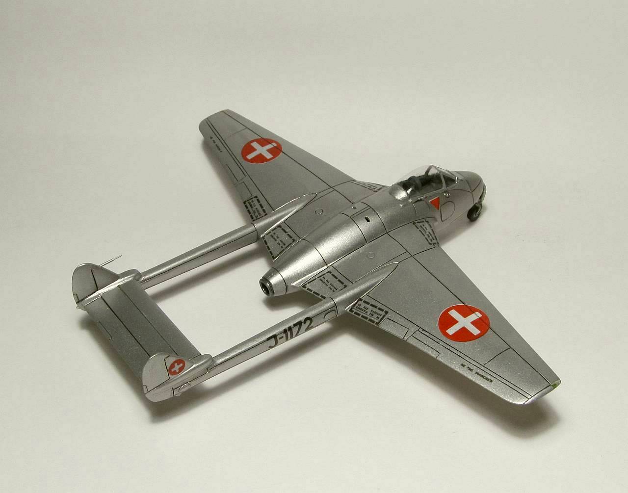 Случаются у меня, к сожалению, такие неприятные моменты, когда я застреваю на какой-то мелочи, не зная как её лучше изготовить, и тогда модель подвисает, иногда надолго. В данном случае камнем преткновения стали, смешно сказать, перегородки в воздухозаборниках: очень уж хотелось сделать их как положено, с дугой по внешней кромке, но не получилось с наскока... А тут ещё с первого июля график на работе изменился... В общем, вроде и мелочи это всё, но из колеи они меня совместными "усилиями" выбили. Вот только в отпуске удалось наконец собраться с мыслями и, после небольшой разминки на другом, ещё более старом долгострое, взяться снова за "Вампира". Злополучные перегородки, со психу, сделал как проще, из прямых полосок дошипласта. Ещё по паре таких полосок вклеил в ниши шасси, чтобы не выглядели совсем уж пусто. Фольгой-самоклейкой изобразил лючки по бортам и крышку пушечного отсека на брюшке фюзеляжа. Осталось изобразить овальные лючки(?) на хвостовых балках, ещё не определился как это сделать, тоже фольгой, или с расшивкой помучиться?