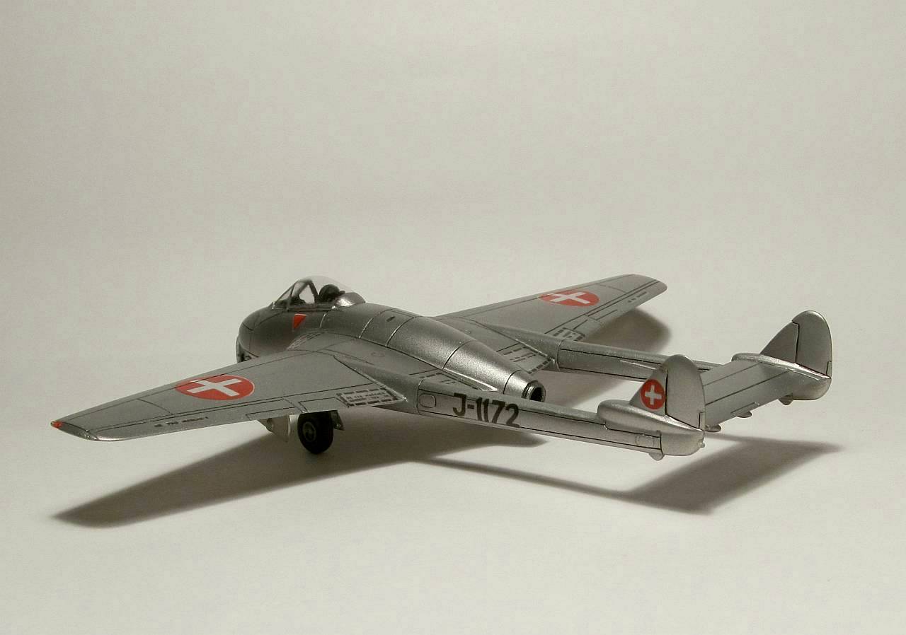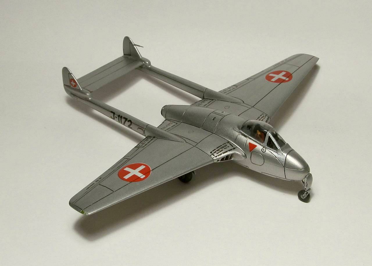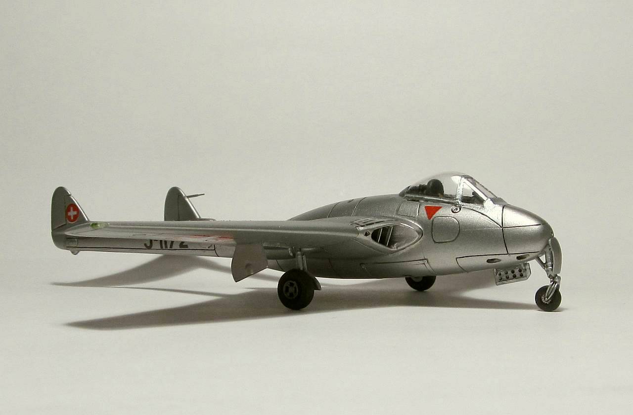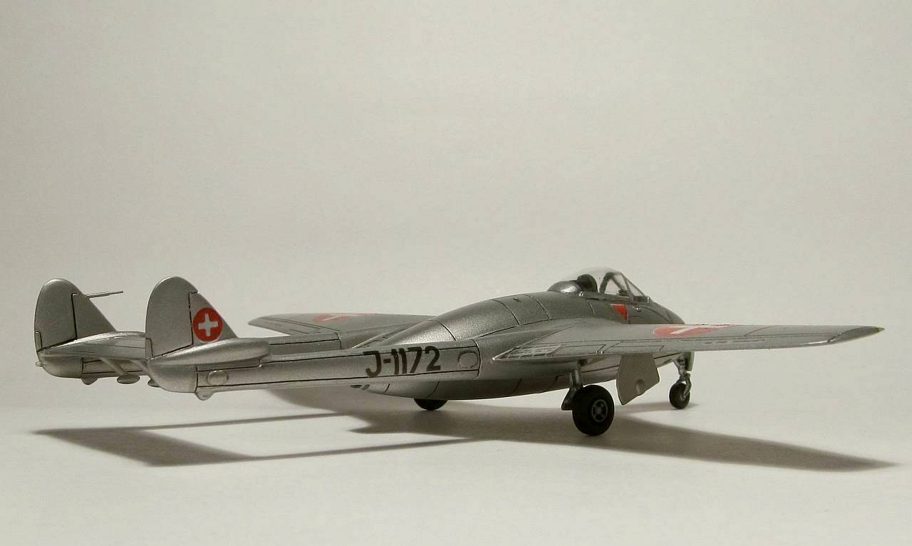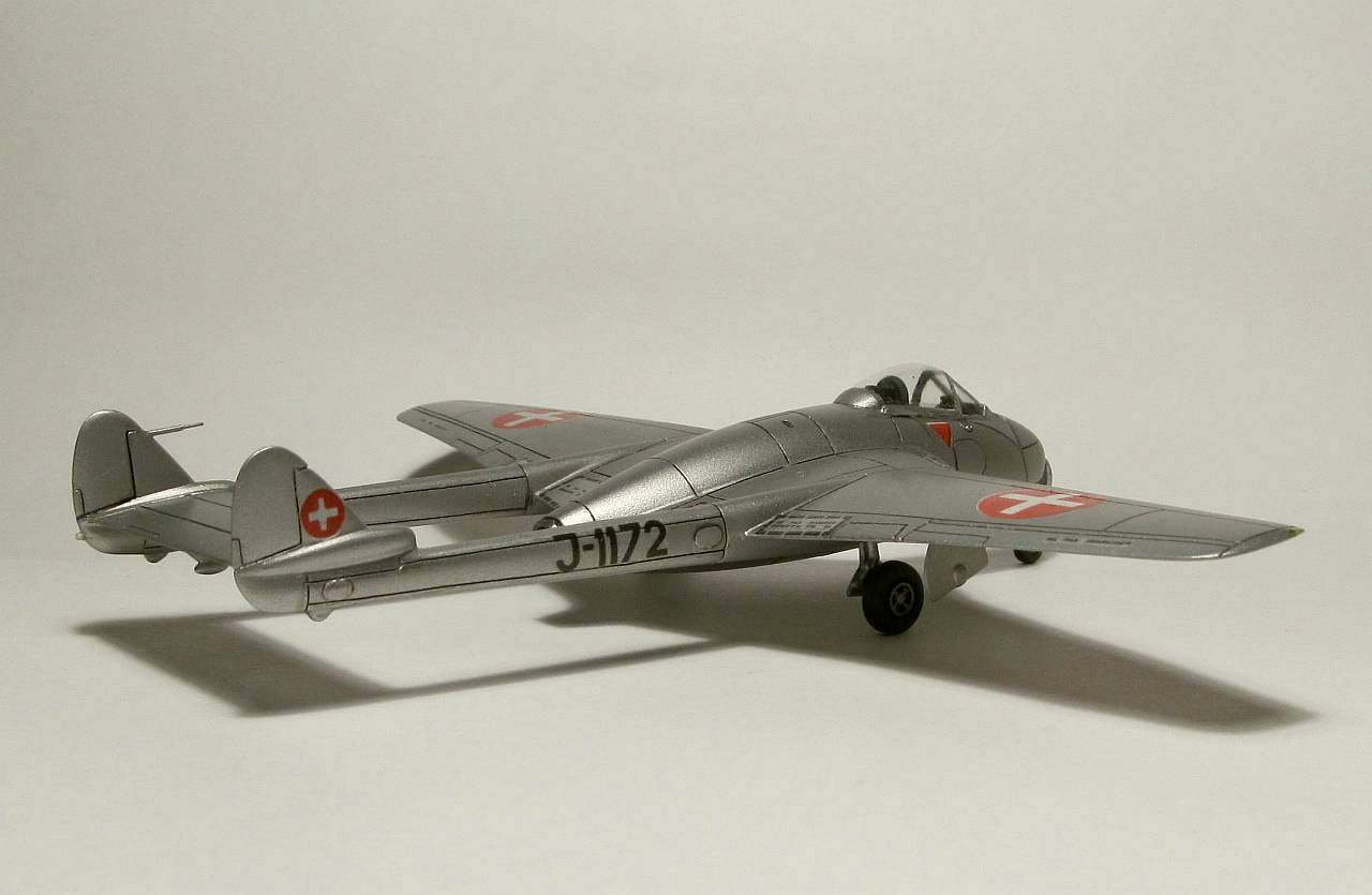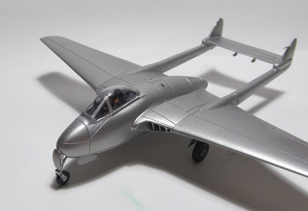 Случаются у меня, к сожалению, такие неприятные моменты, когда я застреваю на какой-то мелочи, не зная как её лучше изготовить, и тогда модель подвисает, иногда надолго. В данном случае камнем преткновения стали, смешно сказать, перегородки в воздухозаборниках: очень уж хотелось сделать их как положено, с дугой по внешней кромке, но не получилось с наскока... А тут ещё с первого июля график на работе изменился... В общем, вроде и мелочи это всё, но из колеи они меня совместными "усилиями" выбили. Вот только в отпуске удалось наконец собраться с мыслями и, после небольшой разминки на другом, ещё более старом долгострое, взяться снова за "Вампира". Злополучные перегородки, со психу, сделал как проще, из прямых полосок дошипласта. Ещё по паре таких полосок вклеил в ниши шасси, чтобы не выглядели совсем уж пусто. Фольгой-самоклейкой изобразил лючки по бортам и крышку пушечного отсека на брюшке фюзеляжа. Осталось изобразить овальные лючки(?) на хвостовых балках, ещё не определился как это сделать, тоже фольгой, или с расшивкой помучиться?