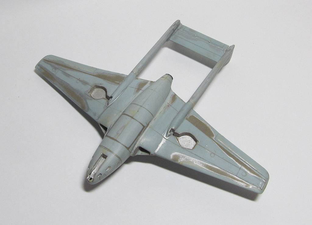 Загрунтовал. Во многих местах обнаружились незаметные раньше мелкие раковины. Забавно, только при подготовке к грунтованию заметил, что приклеил стабилизатор в перевёрнутом положении: следы от срезанных весовых компенсаторов оказались сверху. Мелочь, конечно, но куда смотрел когда клеил непонятненько. Задняя часть фюзеляжа лопнула по шву в момент высверливания отверстия внутри сопла для установки литника-державки.